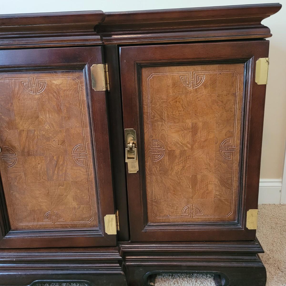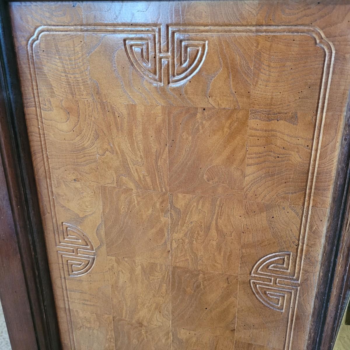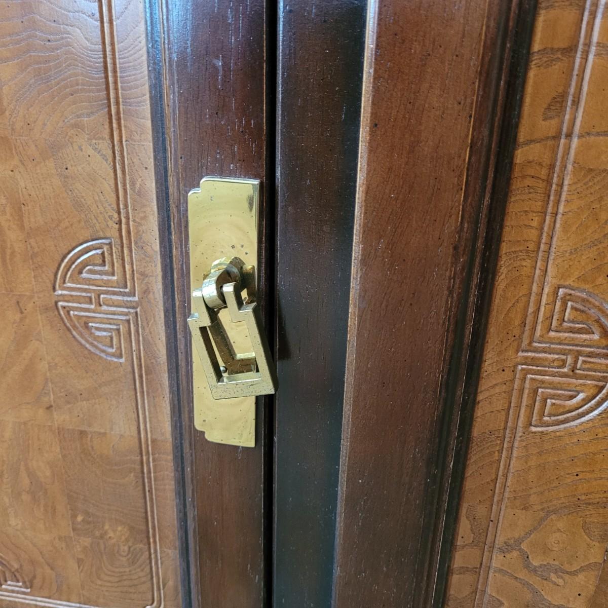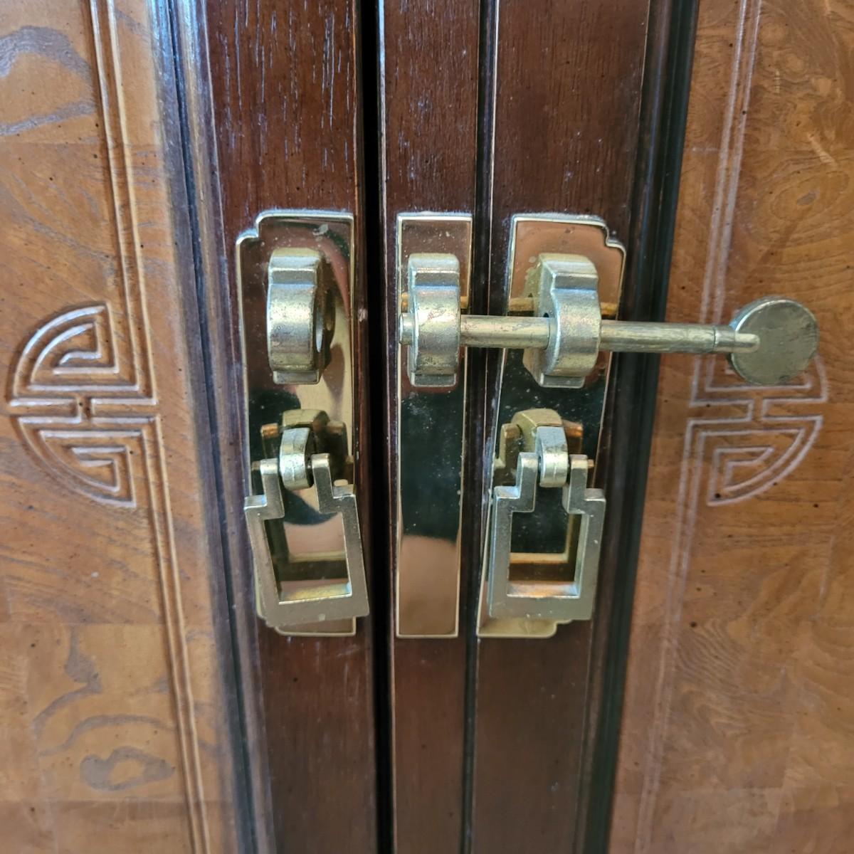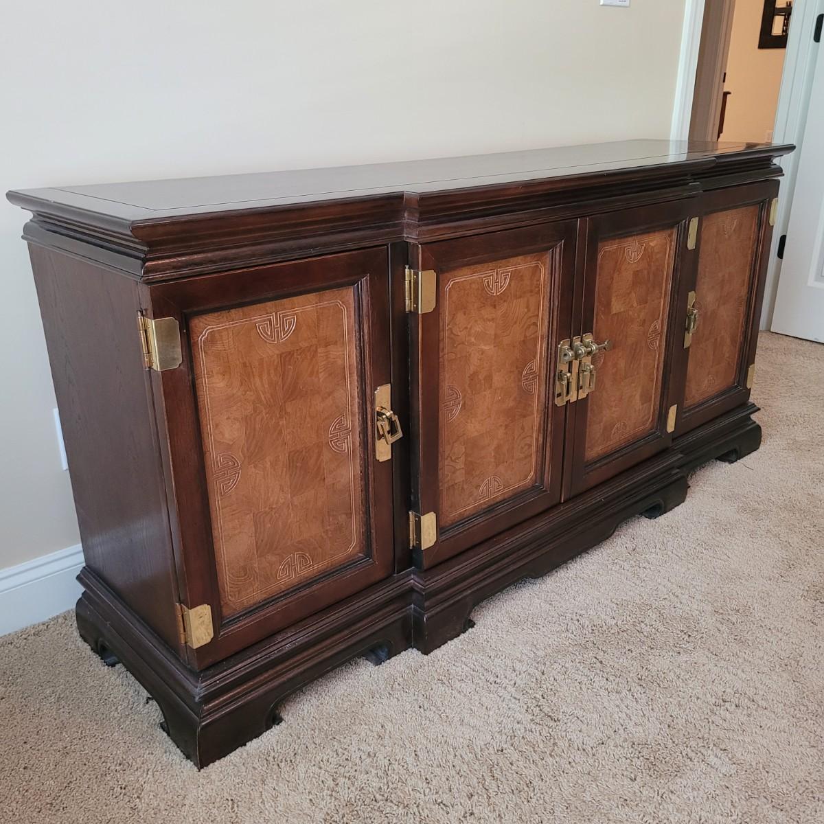 This lot includes one large Chinoiserie wooden credenza. Likely made in the1990s, this credenza has brass hardware and burl doors. There is a brass rod latch that may be used to secure the two middle doors. There is one divided drawer behind the middle two doors and one long shelf that spans the length of the entire credenza. The piece measures approximately 63.5" x 18" x 31"H.