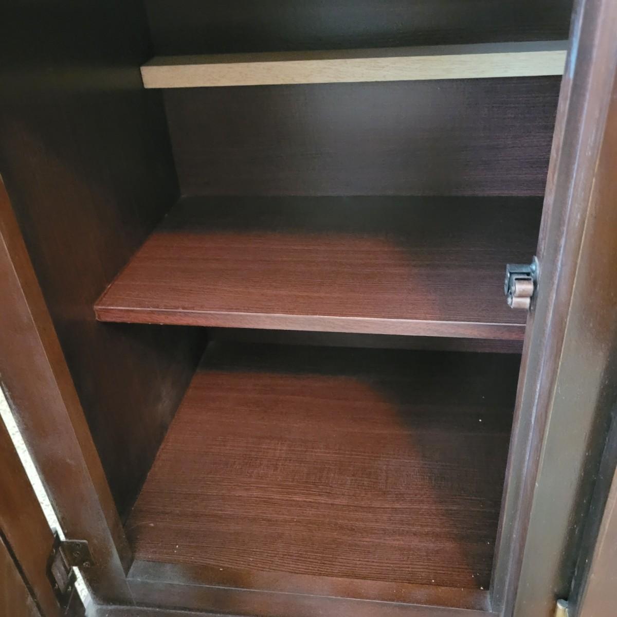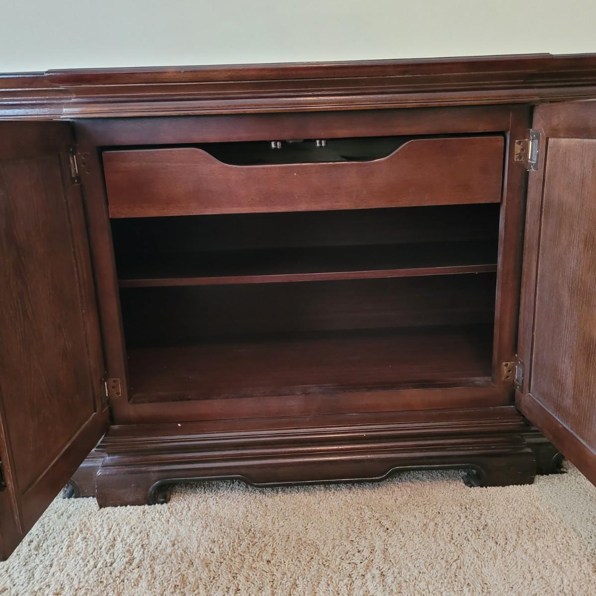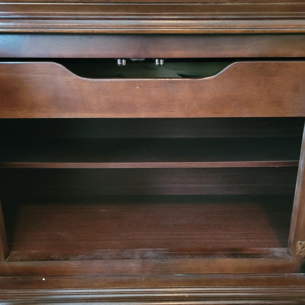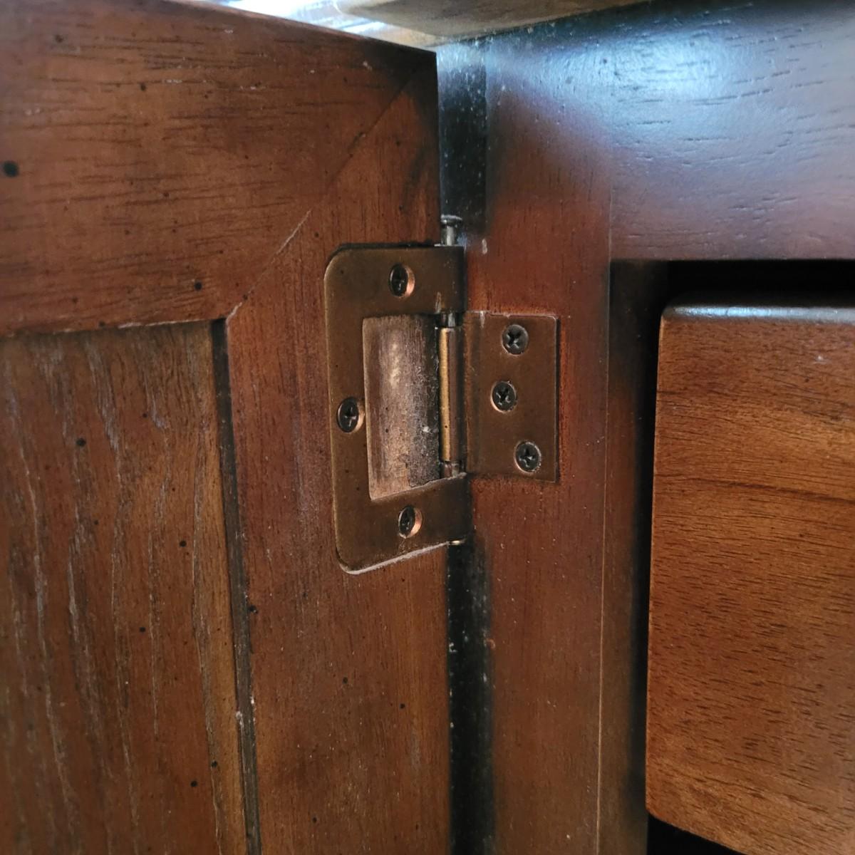 This lot includes one large Chinoiserie wooden credenza. Likely made in the1990s, this credenza has brass hardware and burl doors. There is a brass rod latch that may be used to secure the two middle doors. There is one divided drawer behind the middle two doors and one long shelf that spans the length of the entire credenza. The piece measures approximately 63.5" x 18" x 31"H.