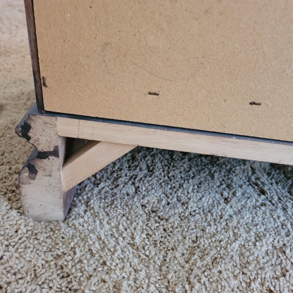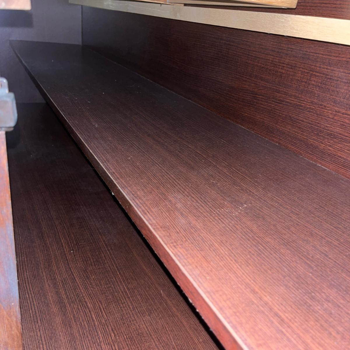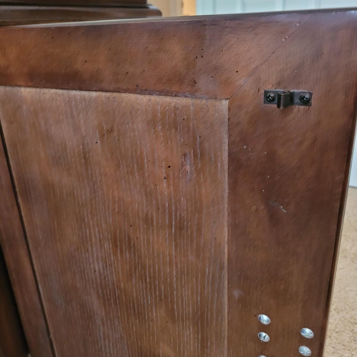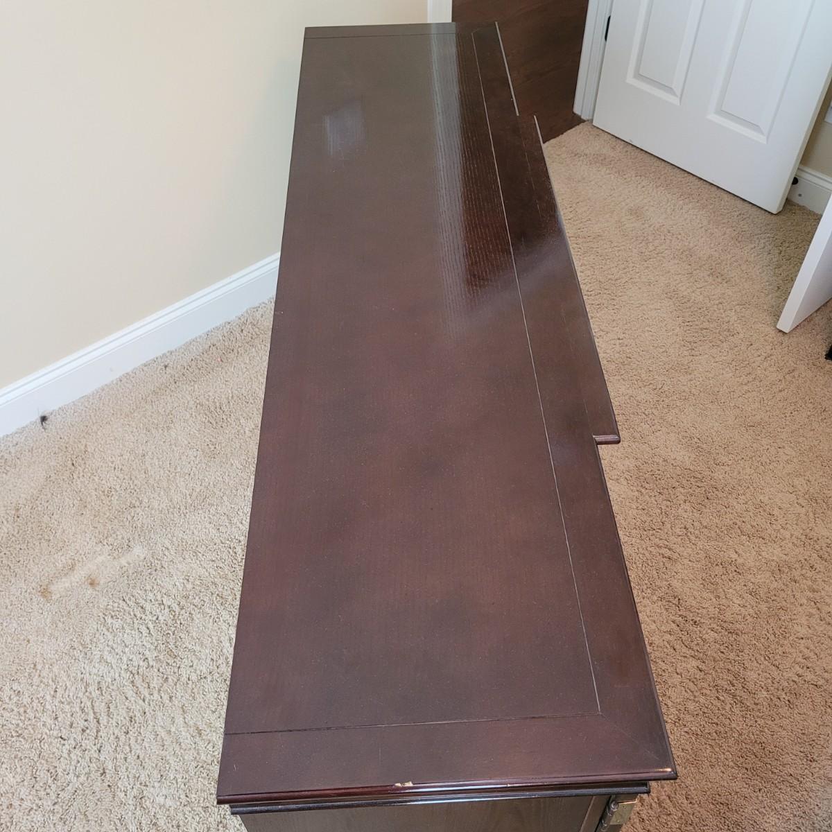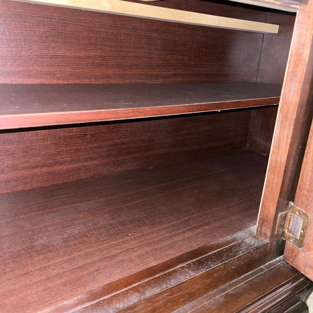 This lot includes one large Chinoiserie wooden credenza. Likely made in the1990s, this credenza has brass hardware and burl doors. There is a brass rod latch that may be used to secure the two middle doors. There is one divided drawer behind the middle two doors and one long shelf that spans the length of the entire credenza. The piece measures approximately 63.5" x 18" x 31"H.
