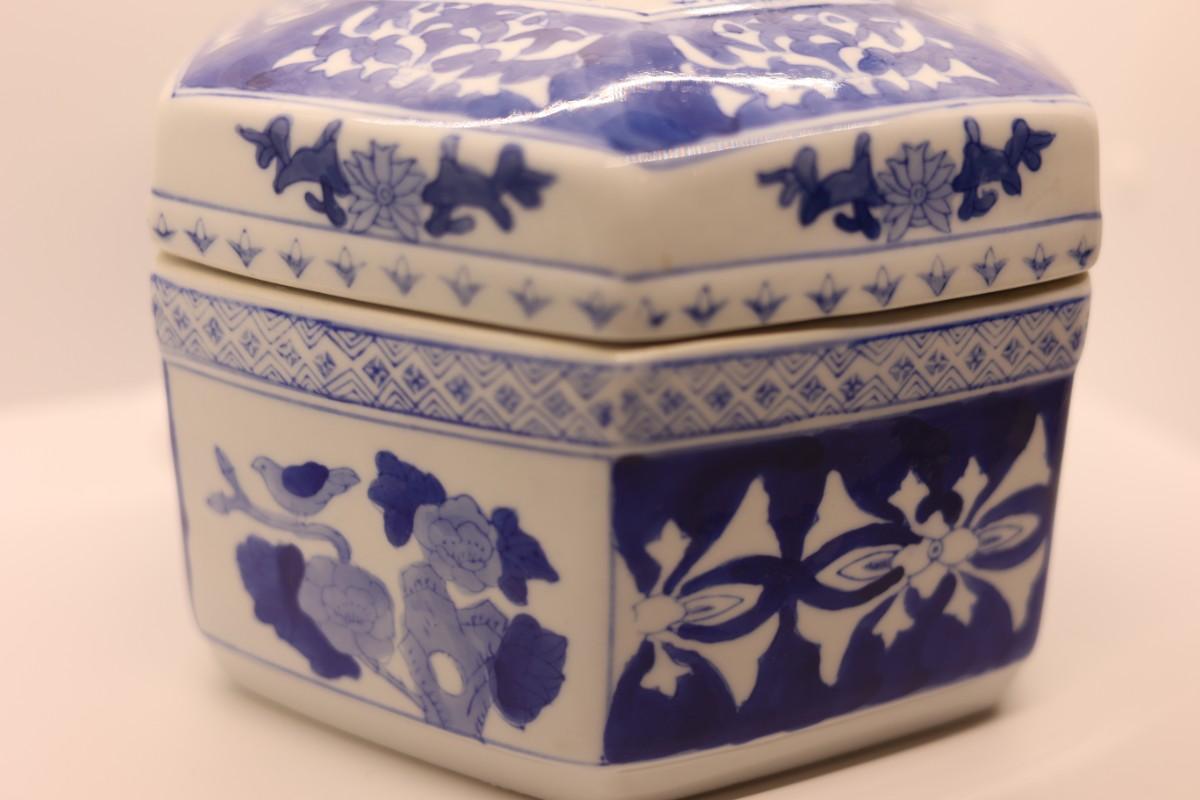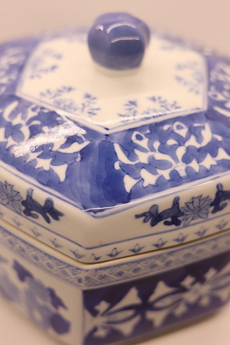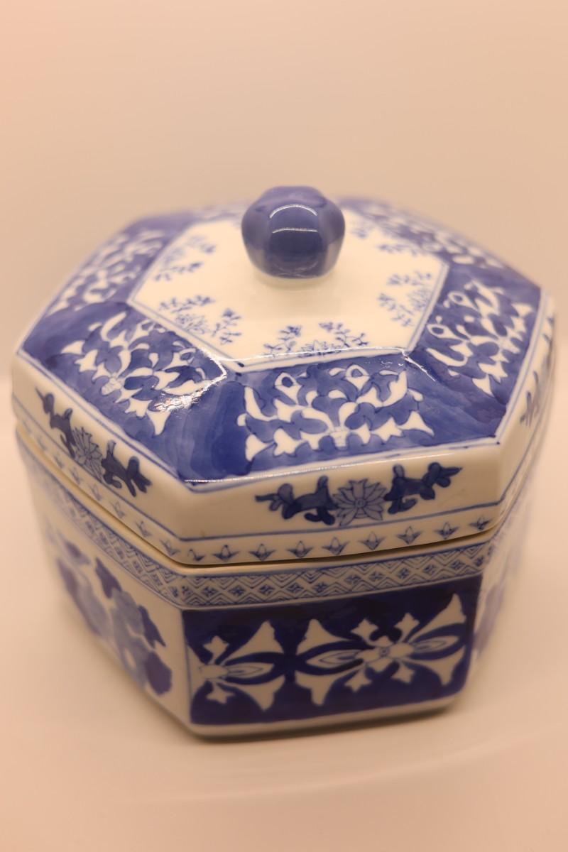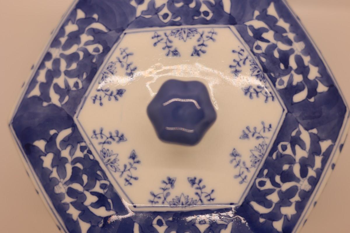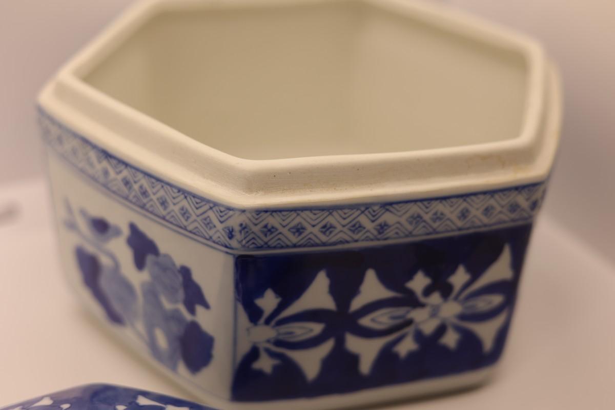 Chinoserie Large Blue & White Hexagonal Porcelain Ginger Jar