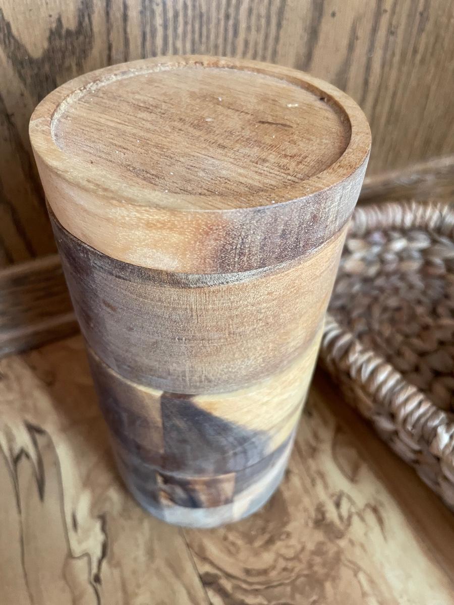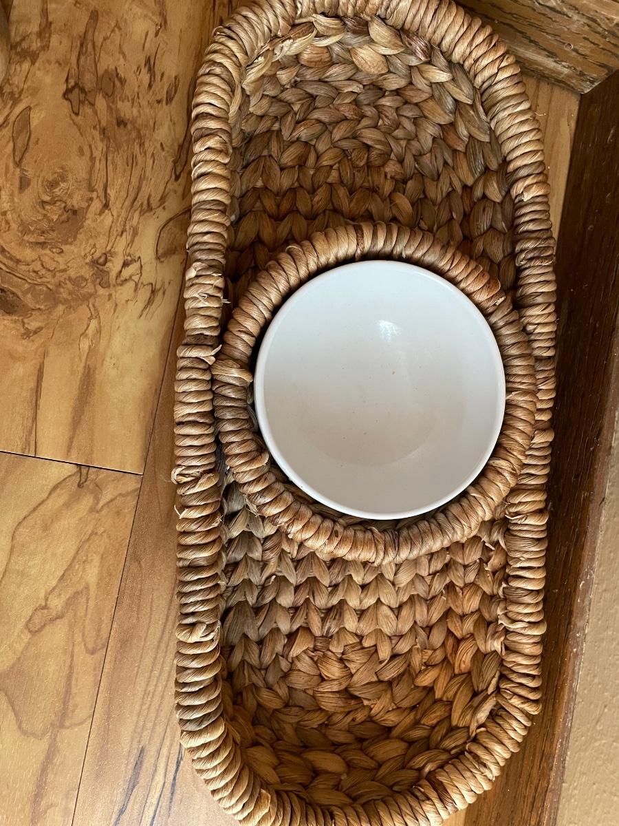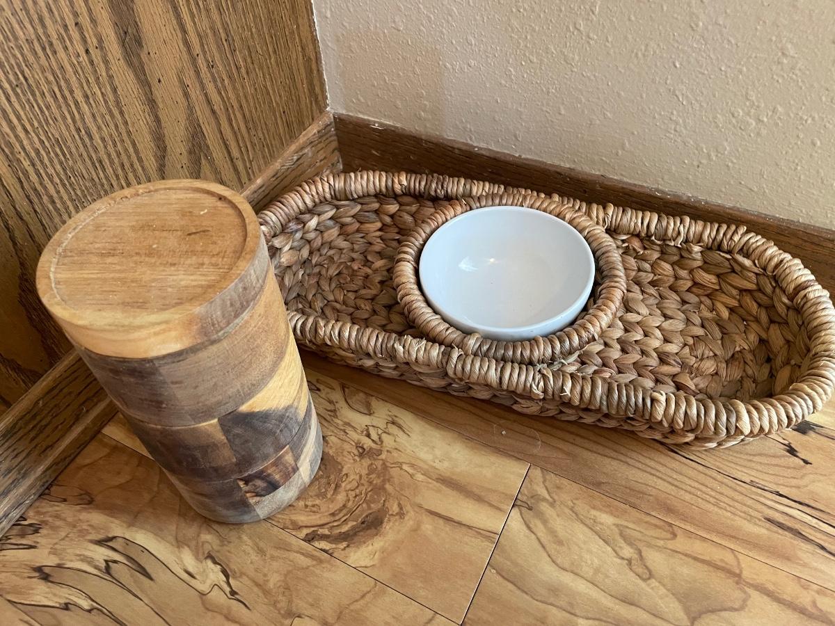 Wicker chip and dip tray along with spice container. Right now has salt & pepper