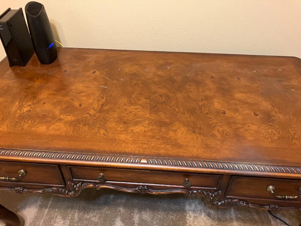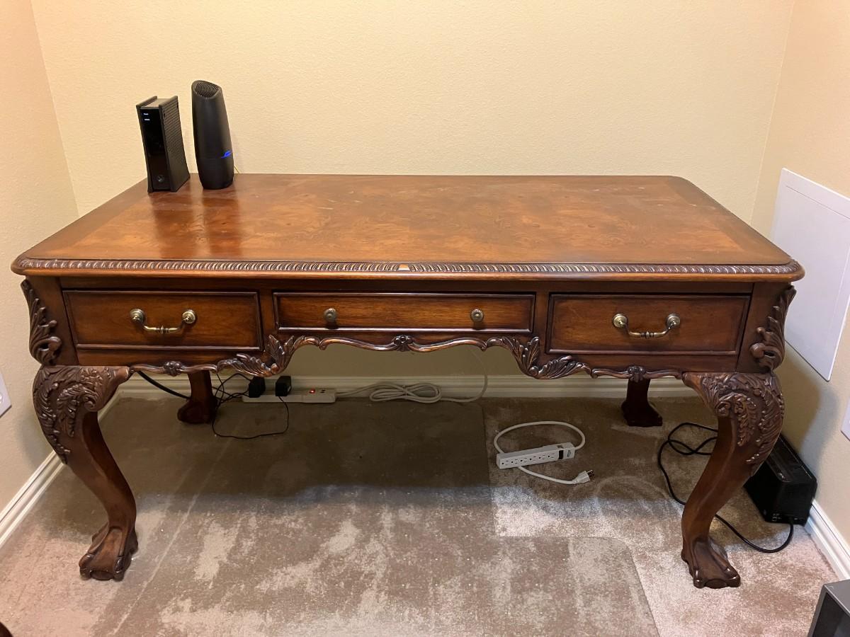 Chippendale style burl wood executive desk with carved legs and antiqued brass pulls. Excellent condition. 37" H x 60" W x 30" D