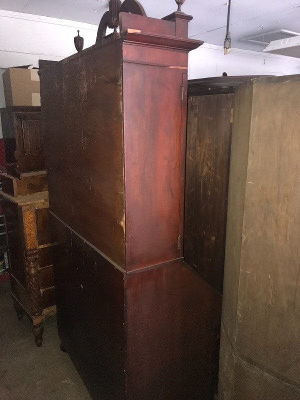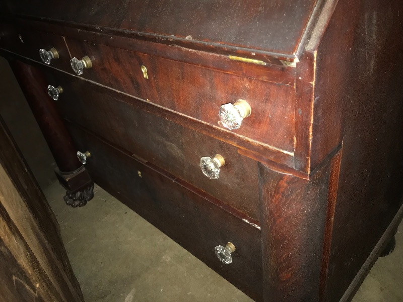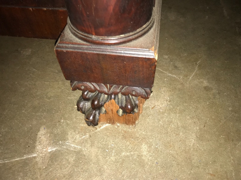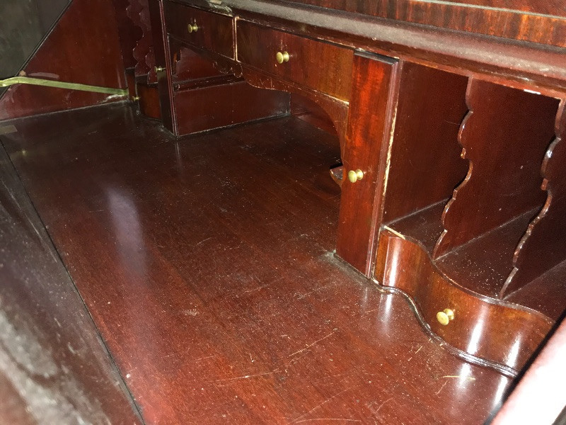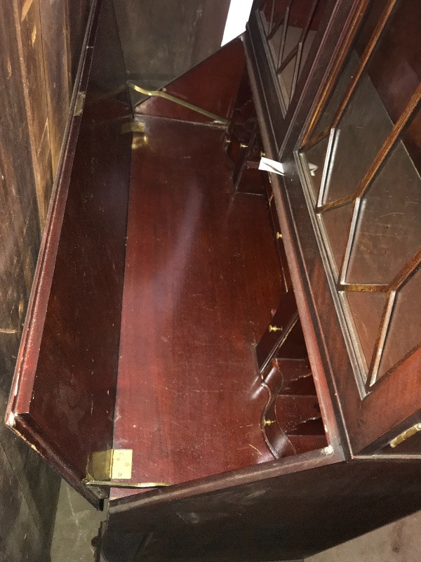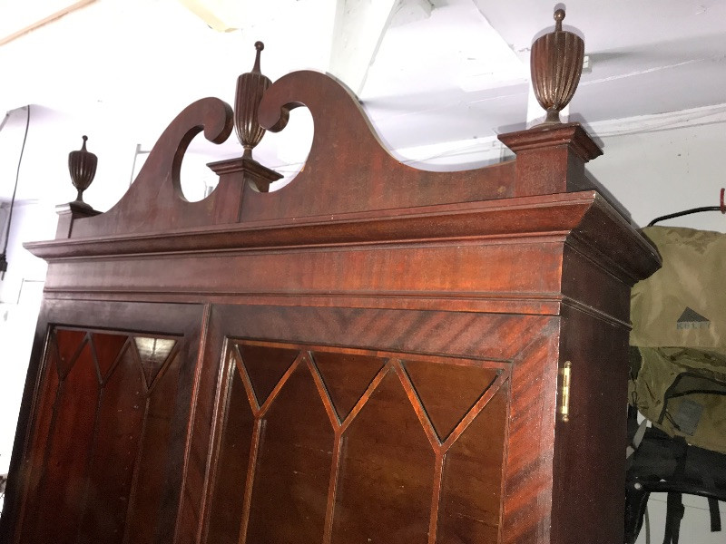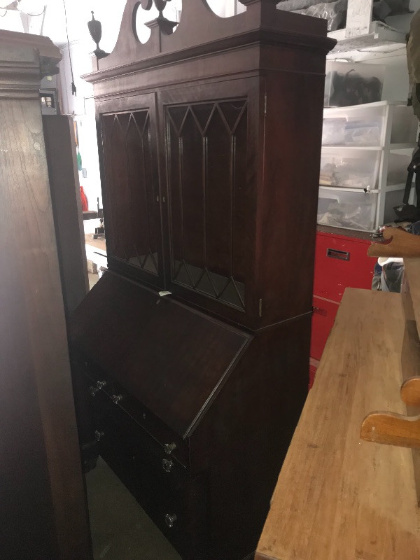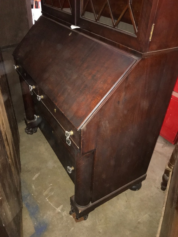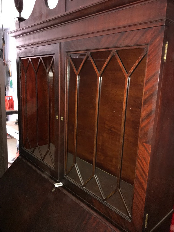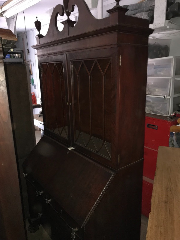 This is an antique Chippendale mahogany china cabinet. It comes with shelves. The bottom is a desk area. There are 3 drawers. There are glass knobs on the drawers. One of the feet is damaged and will need to be repaired. This is a perfect piece for restoration to the right person.
