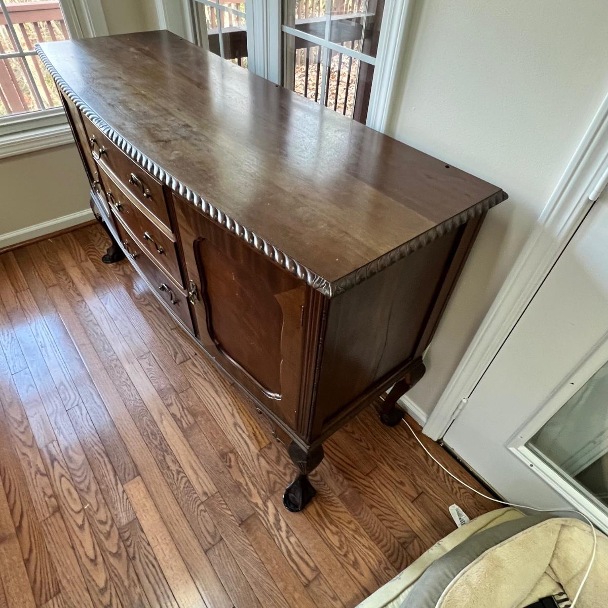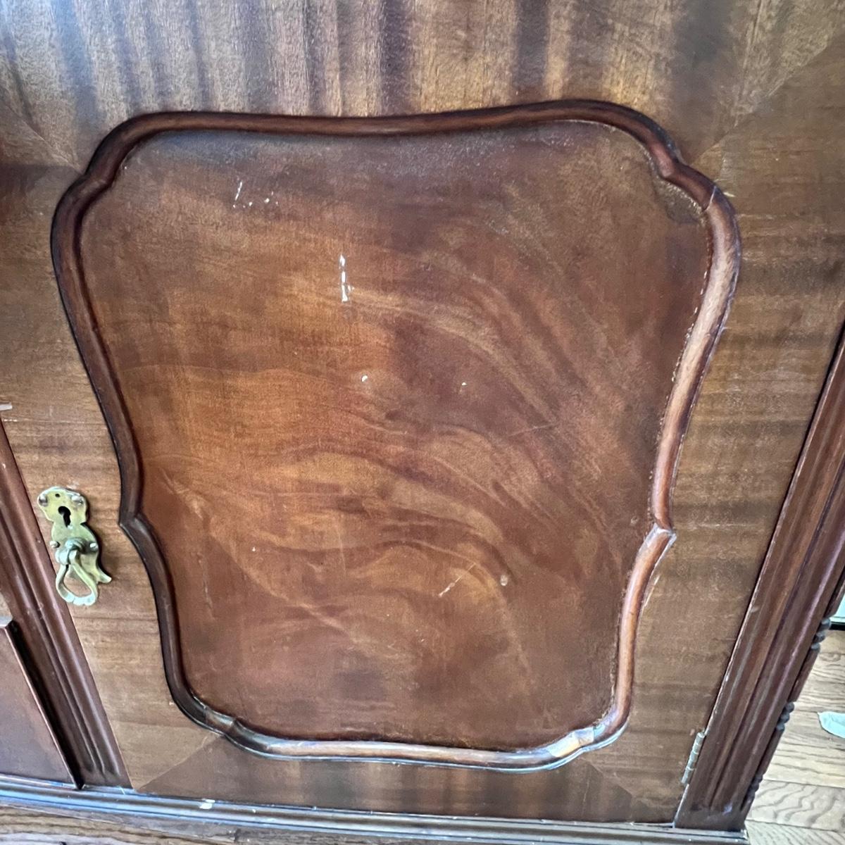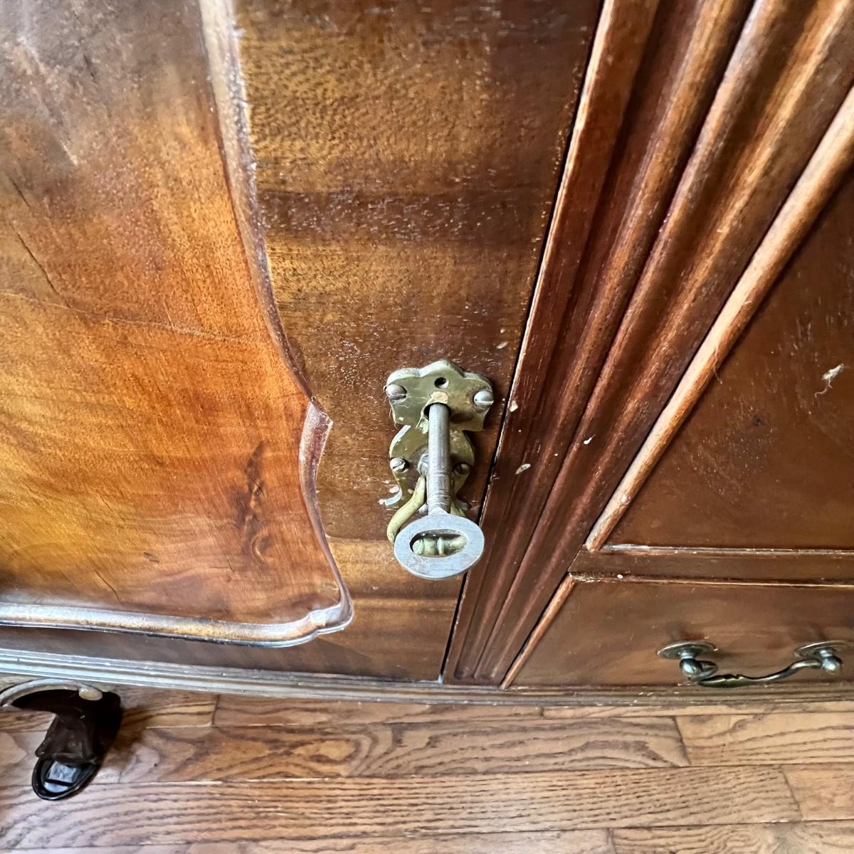 Beautiful bow front sideboard features three dovetailed drawers flanked by two cabinets. The original key only works currently on the left side, the right sides lock is jammed. The lower drawer will not pull out all the way. Hardware appears to be brass. Sideboard has three holes on its top possibly for a mirror once upon a time. The extra pieces appear to be from the trim around the back; the last photo shows where the pieces likely belong. Piece does have some nicks and scratches shown in photos and a split in the wood on one side. No mfg. labels found; a blank sticker found in one drawer.
