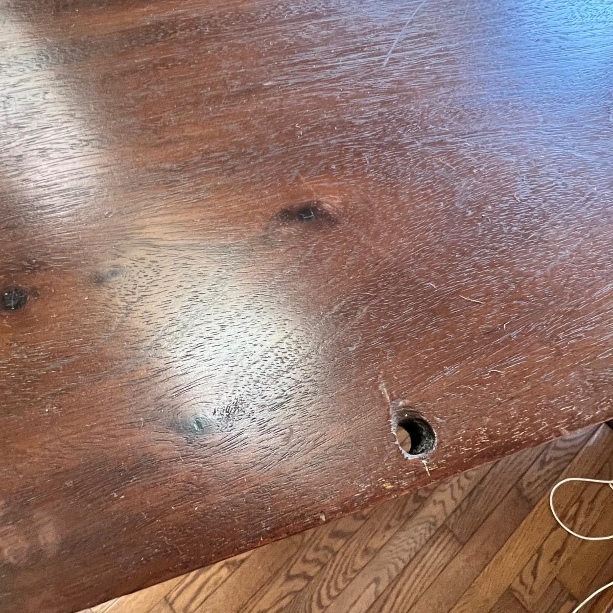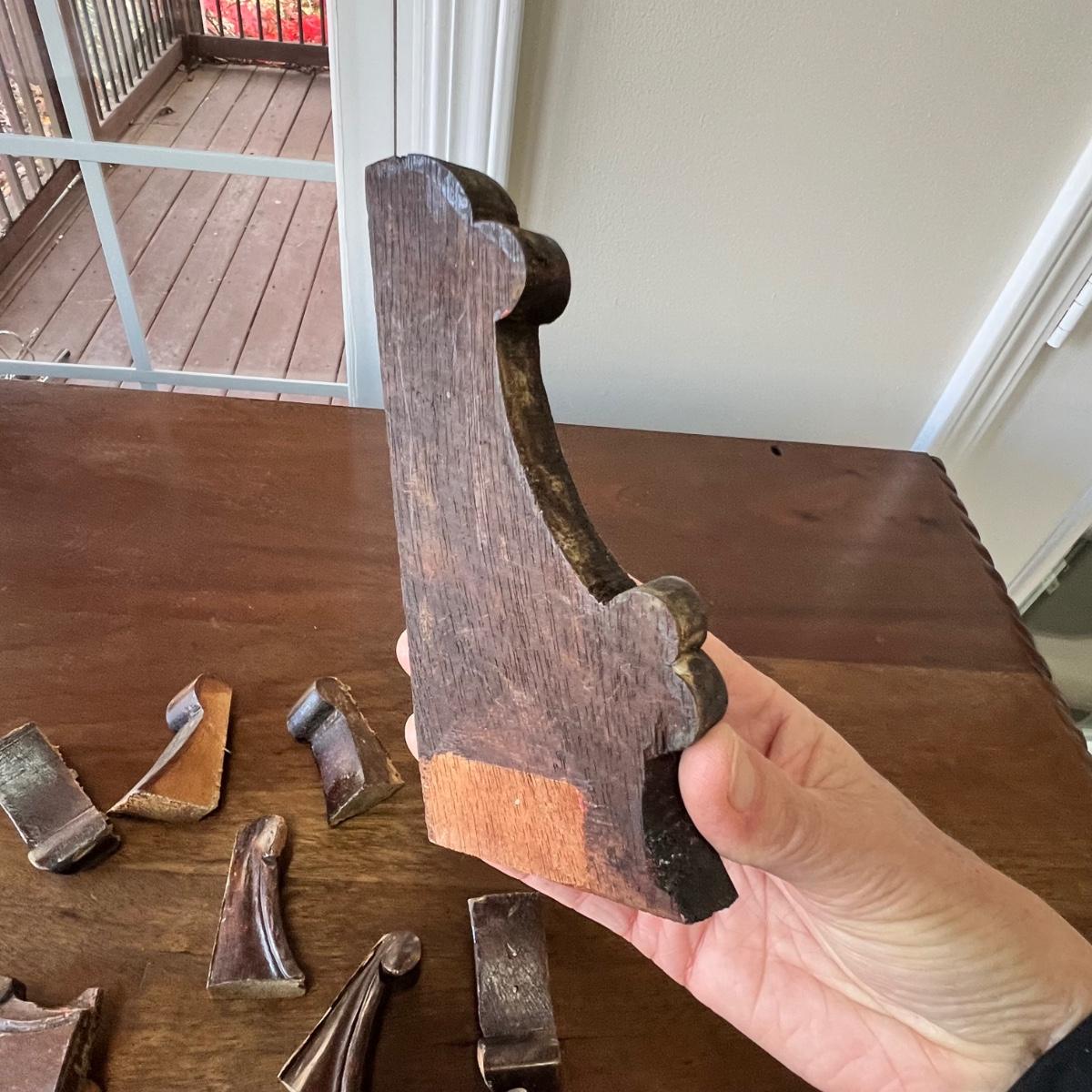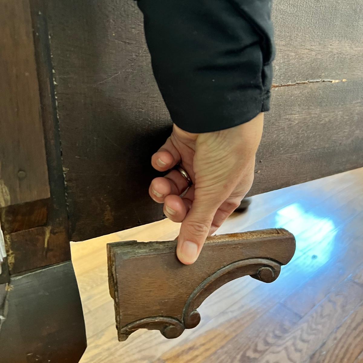 Beautiful bow front sideboard features three dovetailed drawers flanked by two cabinets. The original key only works currently on the left side, the right sides lock is jammed. The lower drawer will not pull out all the way. Hardware appears to be brass. Sideboard has three holes on its top possibly for a mirror once upon a time. The extra pieces appear to be from the trim around the back; the last photo shows where the pieces likely belong. Piece does have some nicks and scratches shown in photos and a split in the wood on one side. No mfg. labels found; a blank sticker found in one drawer.