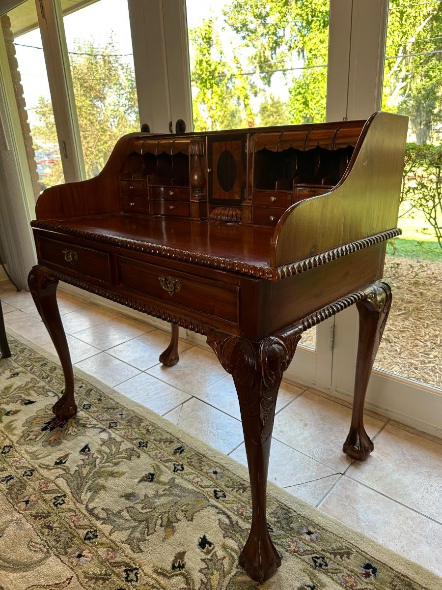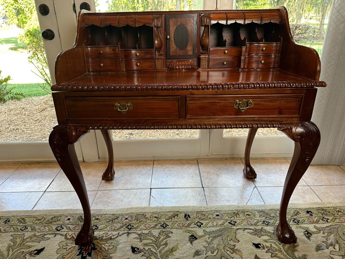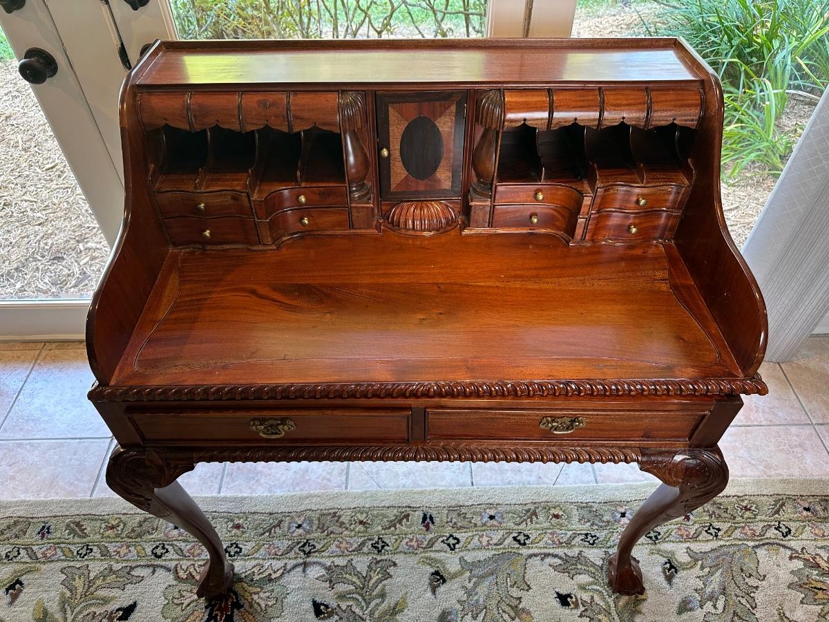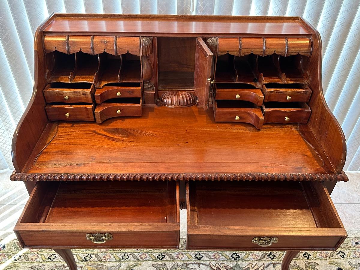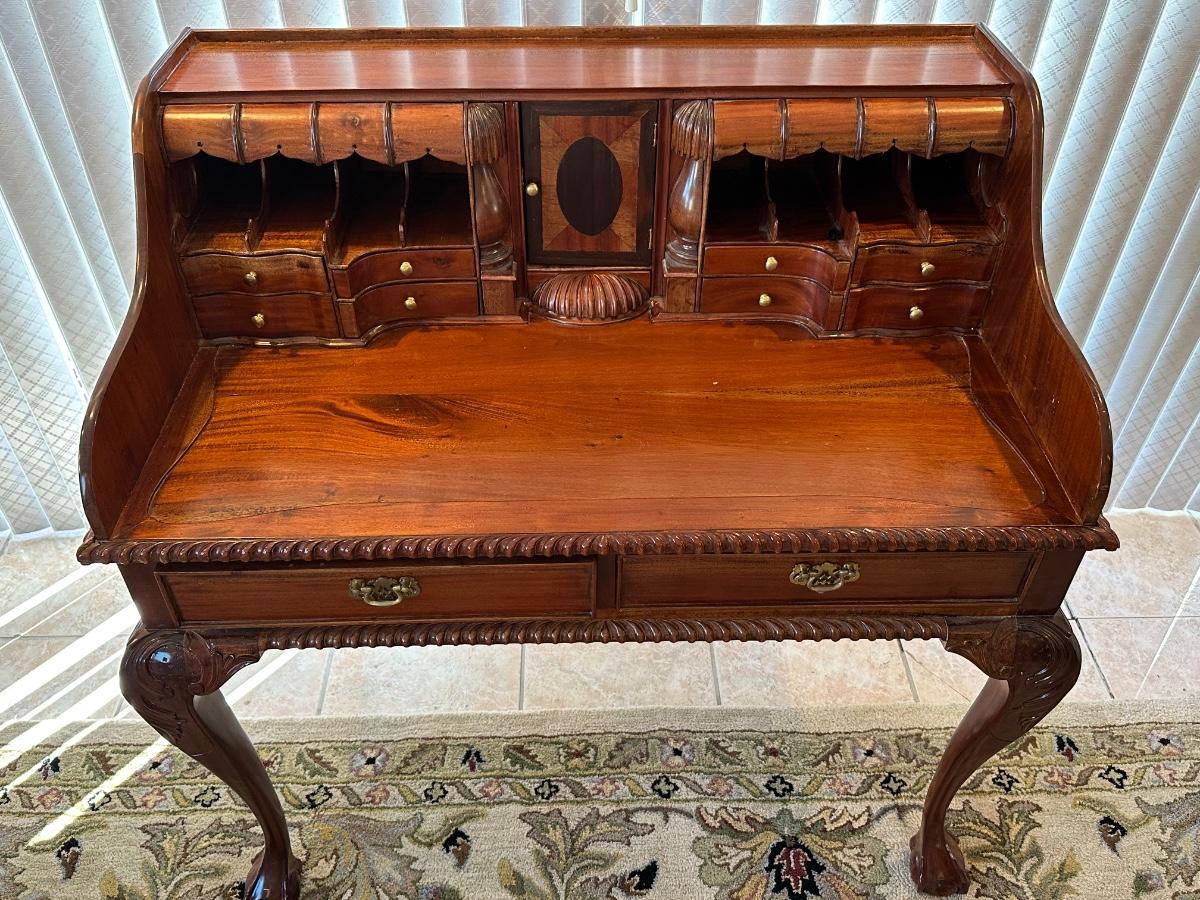 Elegant mahogany desk featuring a carved rope-edge border. The upper section includes multiple small drawers and pigeonholes for organizing stationery. Two full-width drawers below provide additional storage. Beautiful craftsmanship throughout with rich warm finish and brass hardware.