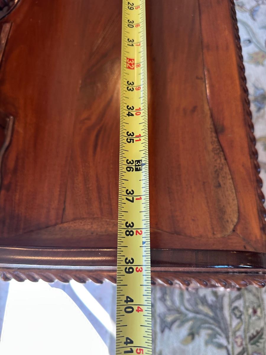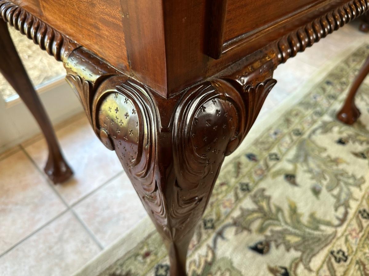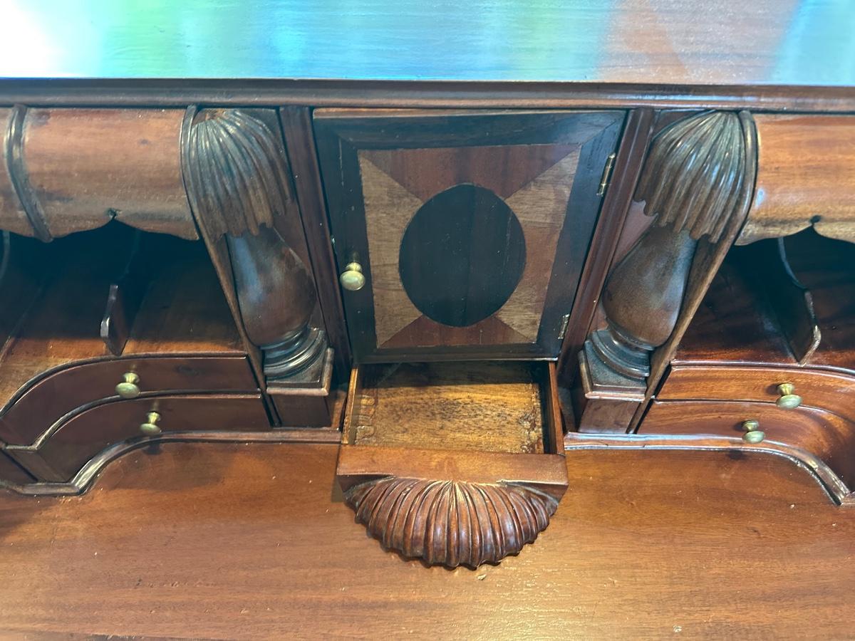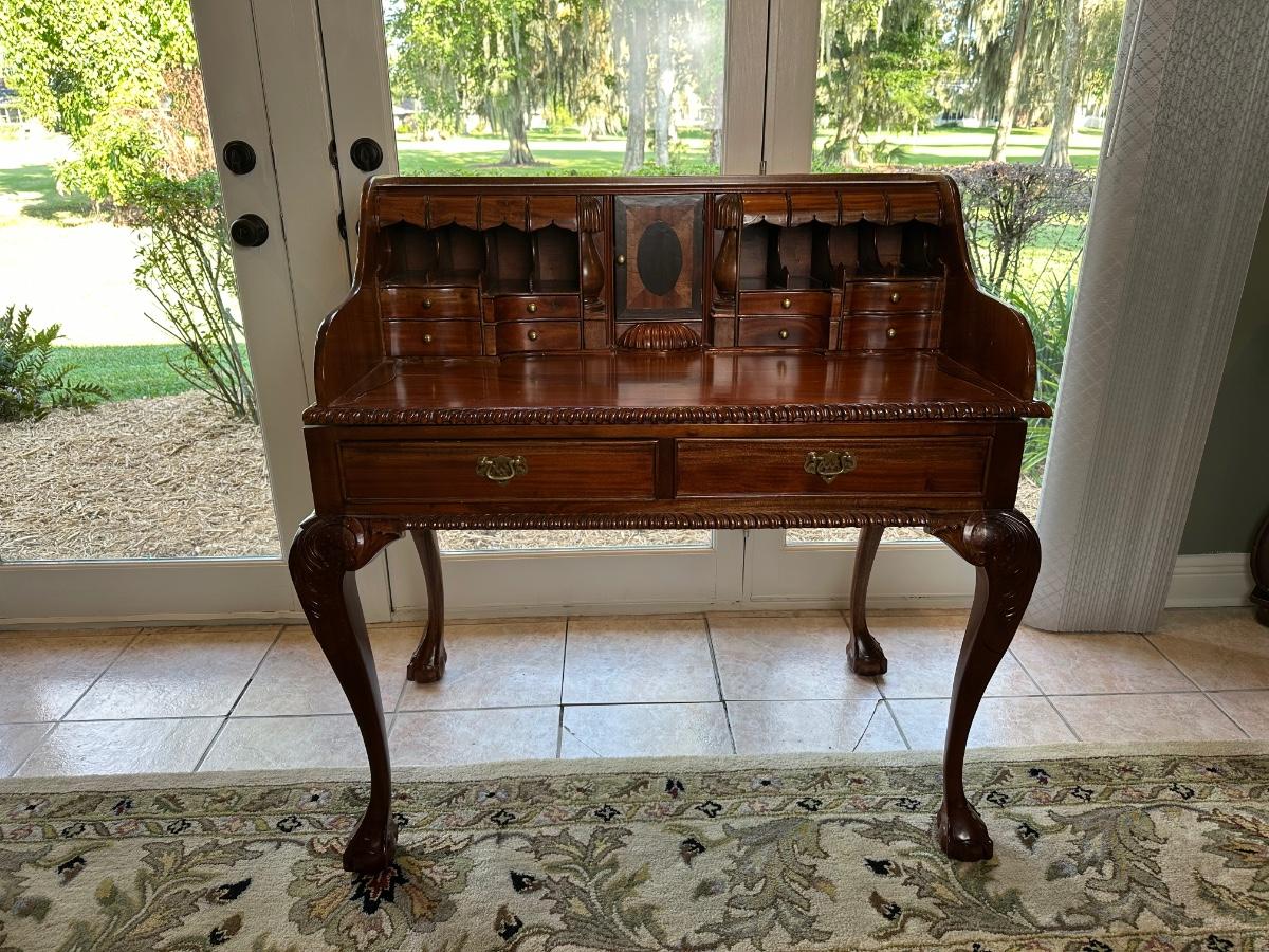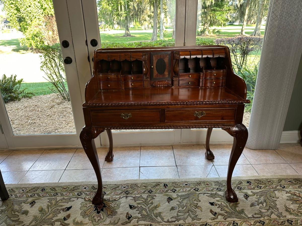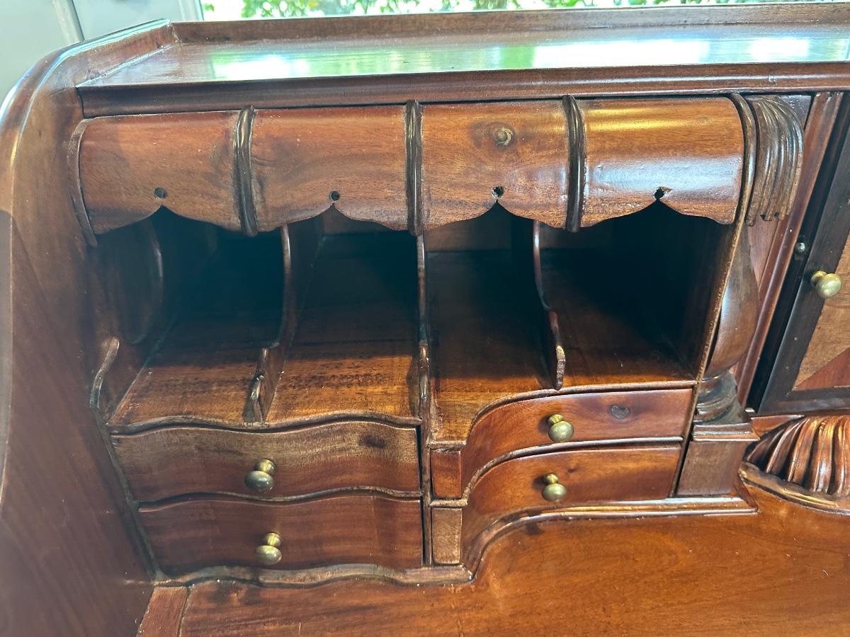Elegant mahogany desk featuring a carved rope-edge border. The upper section includes multiple small drawers and pigeonholes for organizing stationery. Two full-width drawers below provide additional storage. Beautiful craftsmanship throughout with rich warm finish and brass hardware.