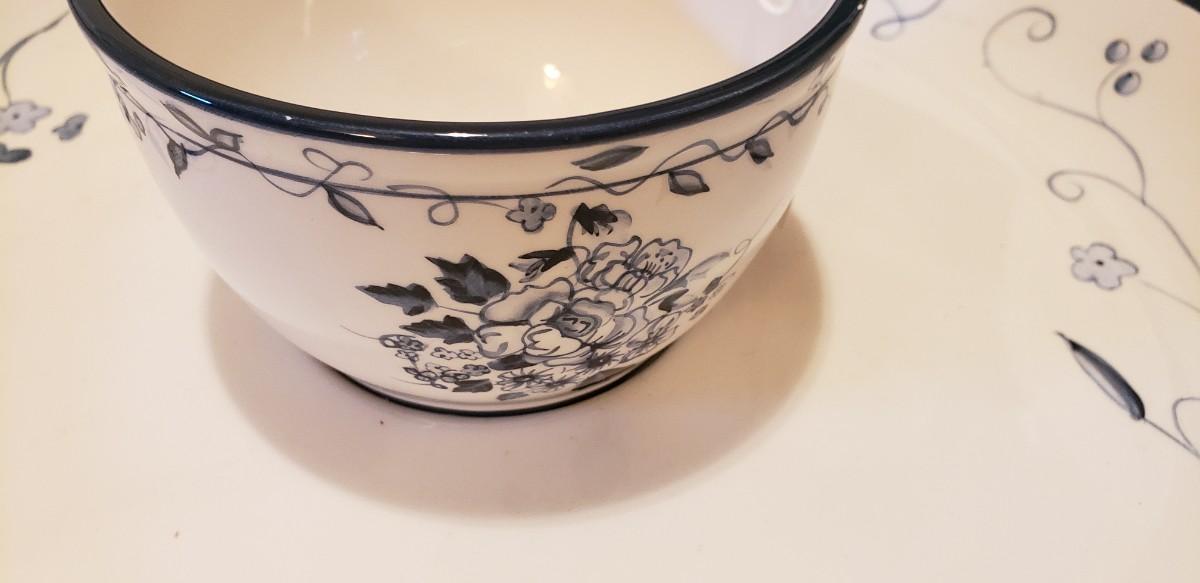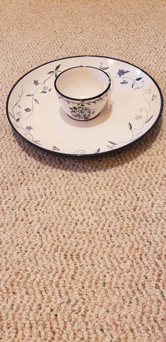 13" diameter ceramic chips & dip set. Bowl is attached. Beautiful farmhouse blue & white in color. No chips