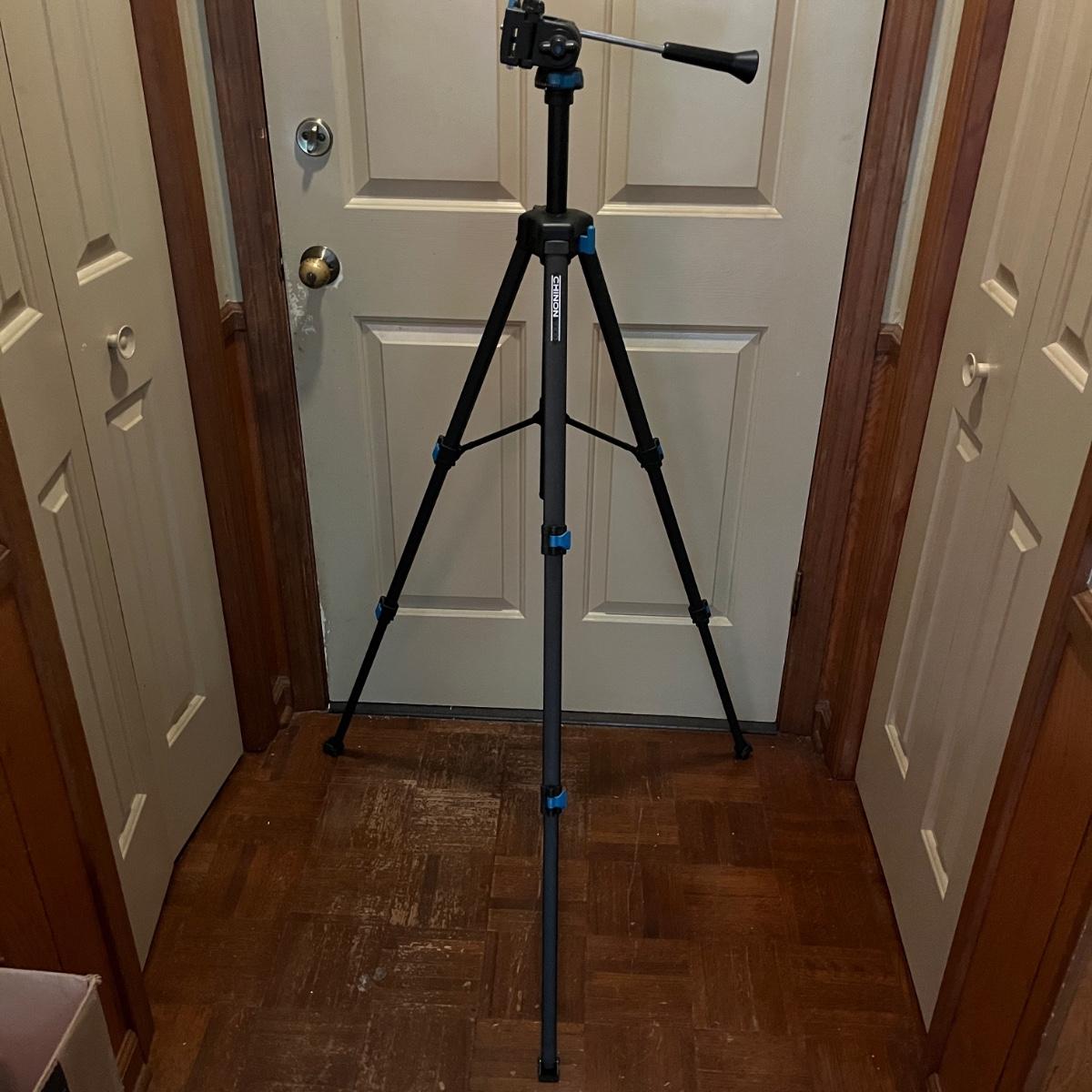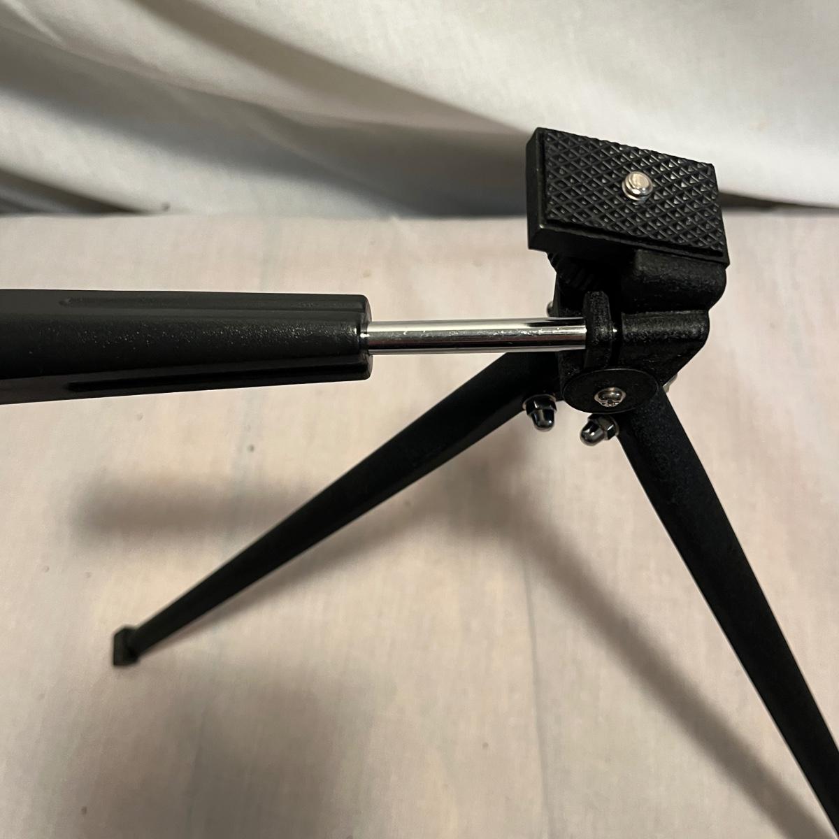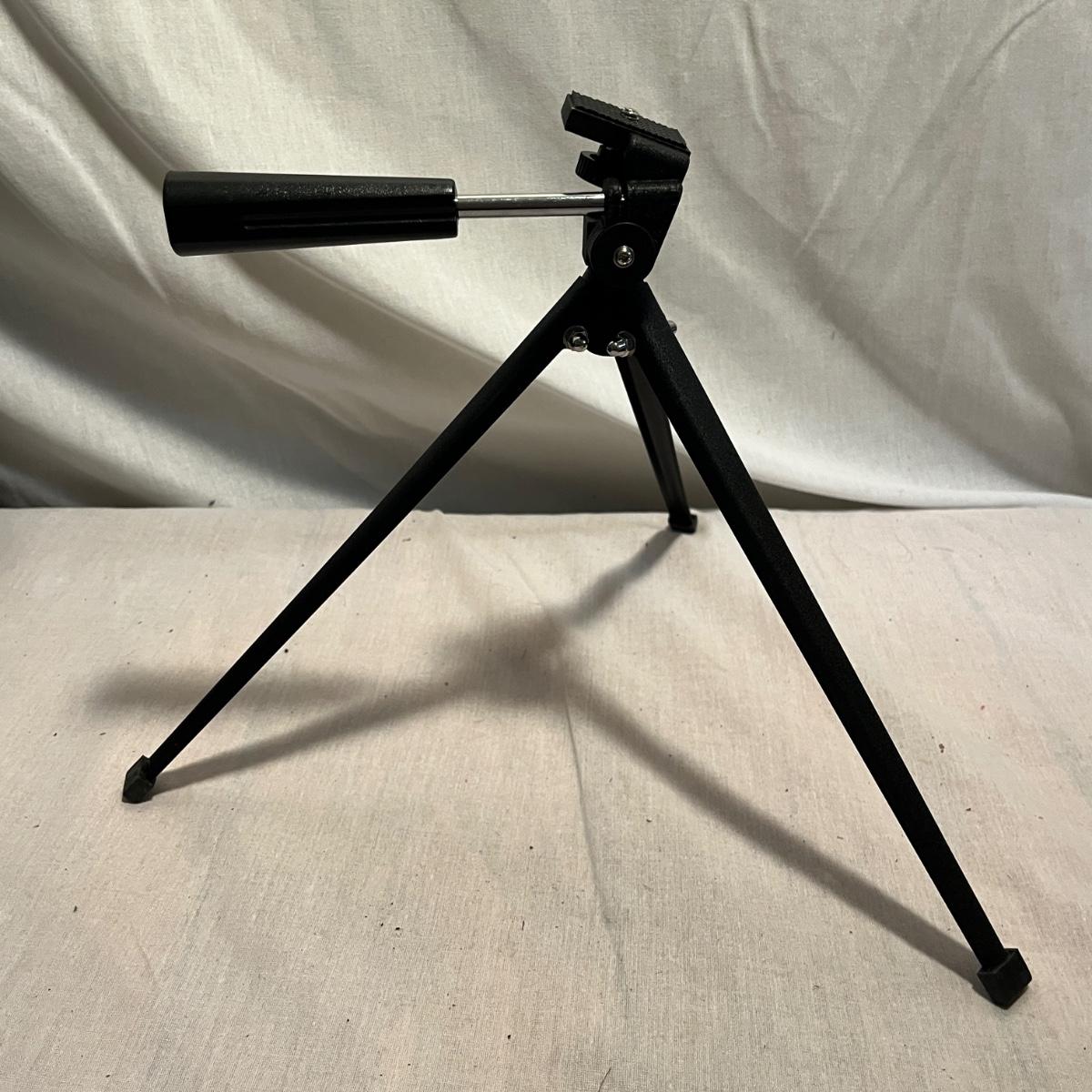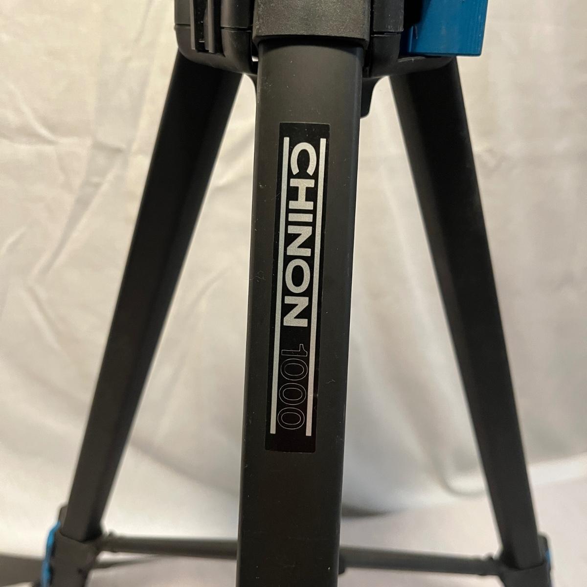 Lot includes a Chinon 1000 telescoping tripod, NIB Dynex mini tripod and an unmarked metal tripod. Chinon tripod measures 32”D x 54”H when extended.