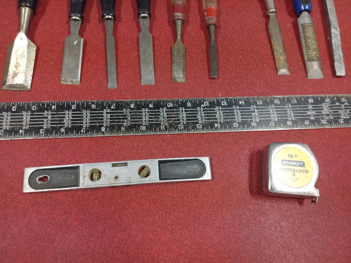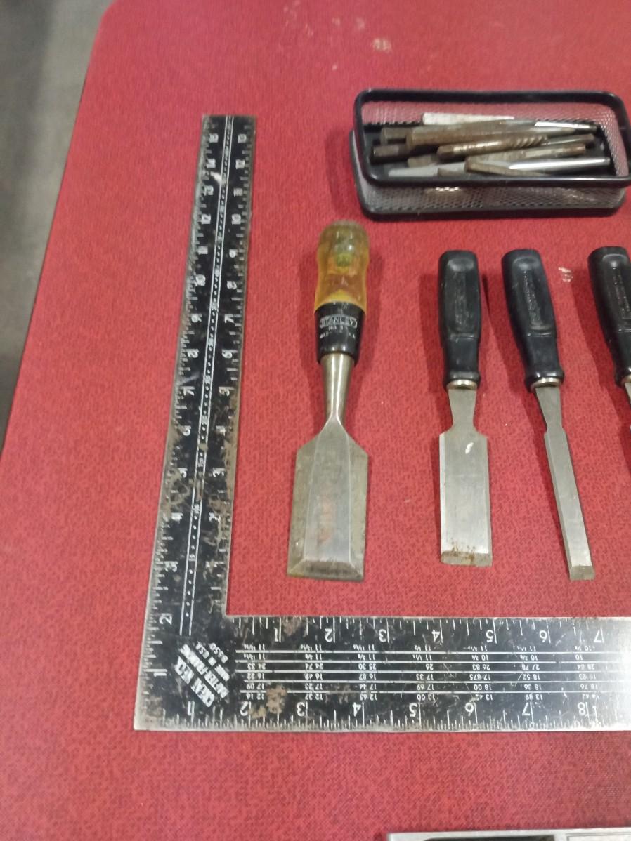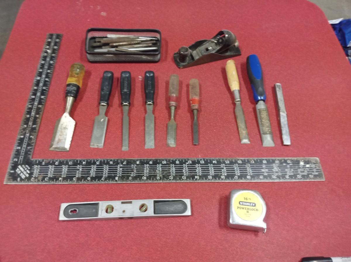 CHISELS, CARPENTERS SQUARE, PLANE AND MORE