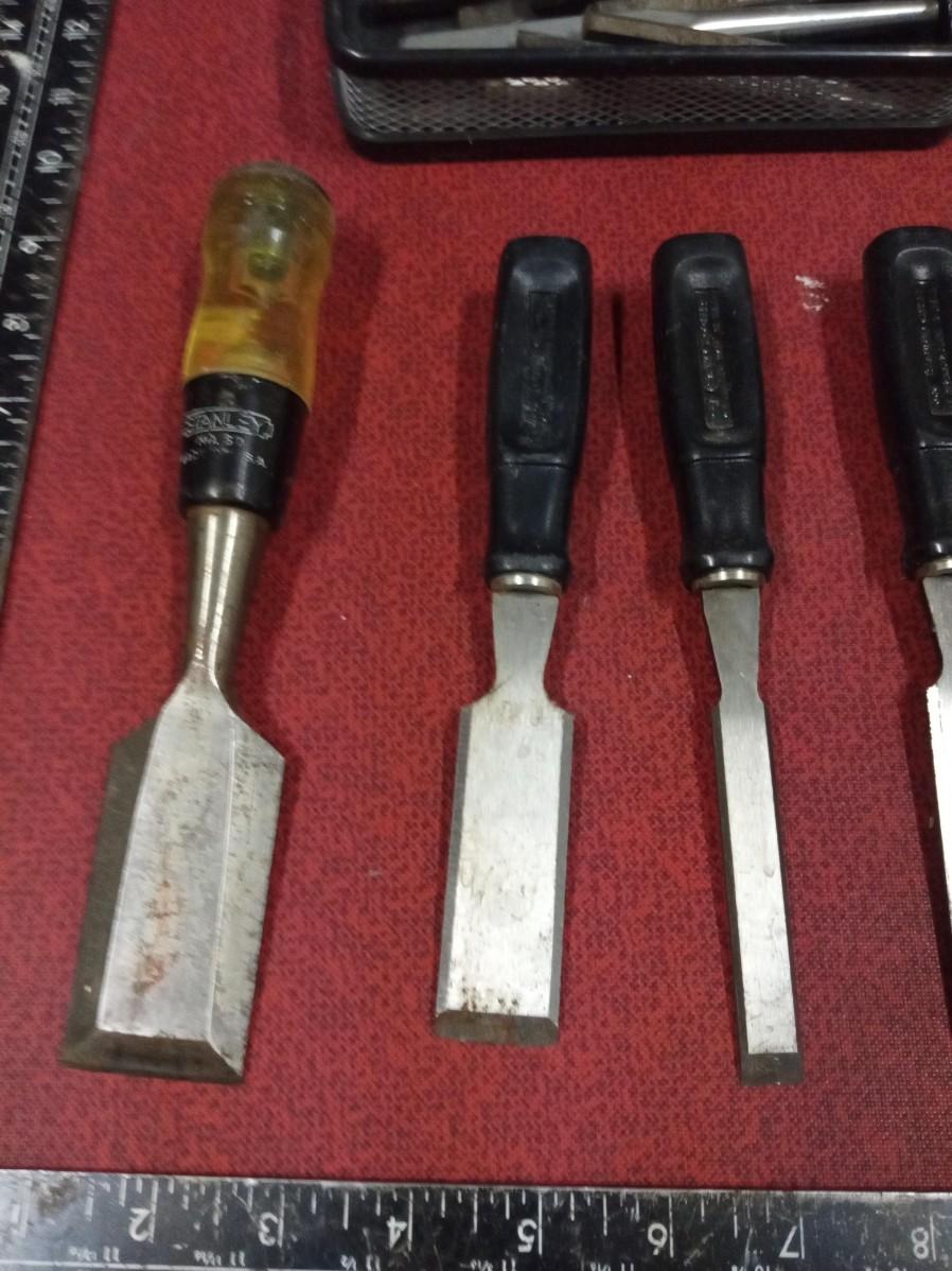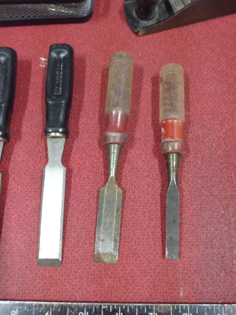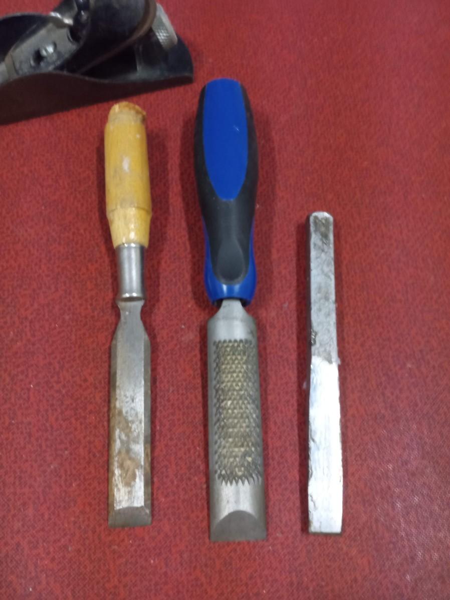 CHISELS, CARPENTERS SQUARE, PLANE AND MORE