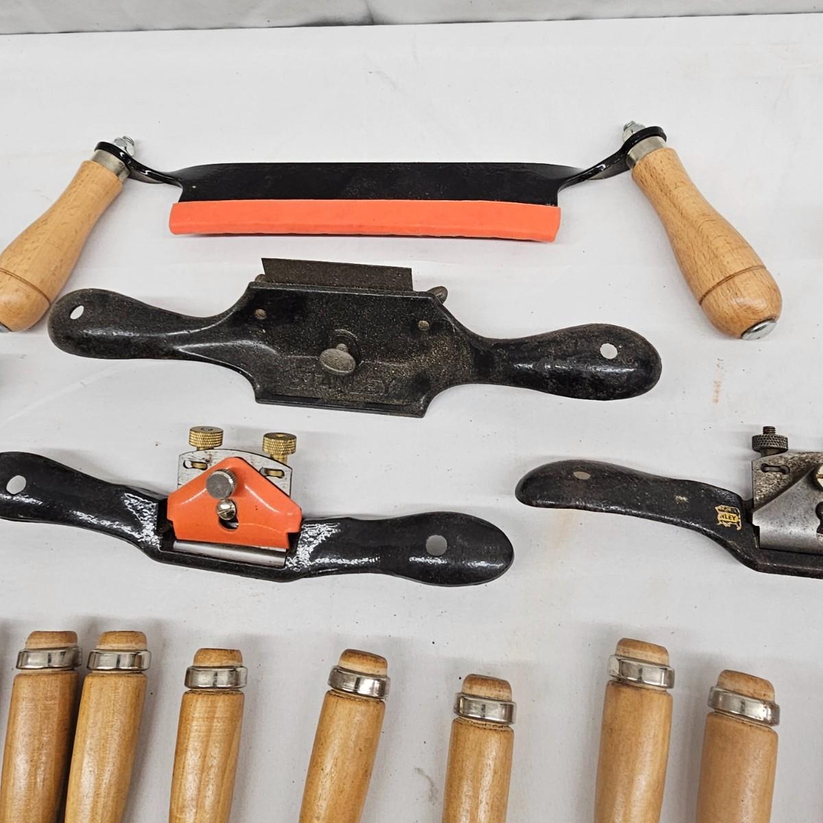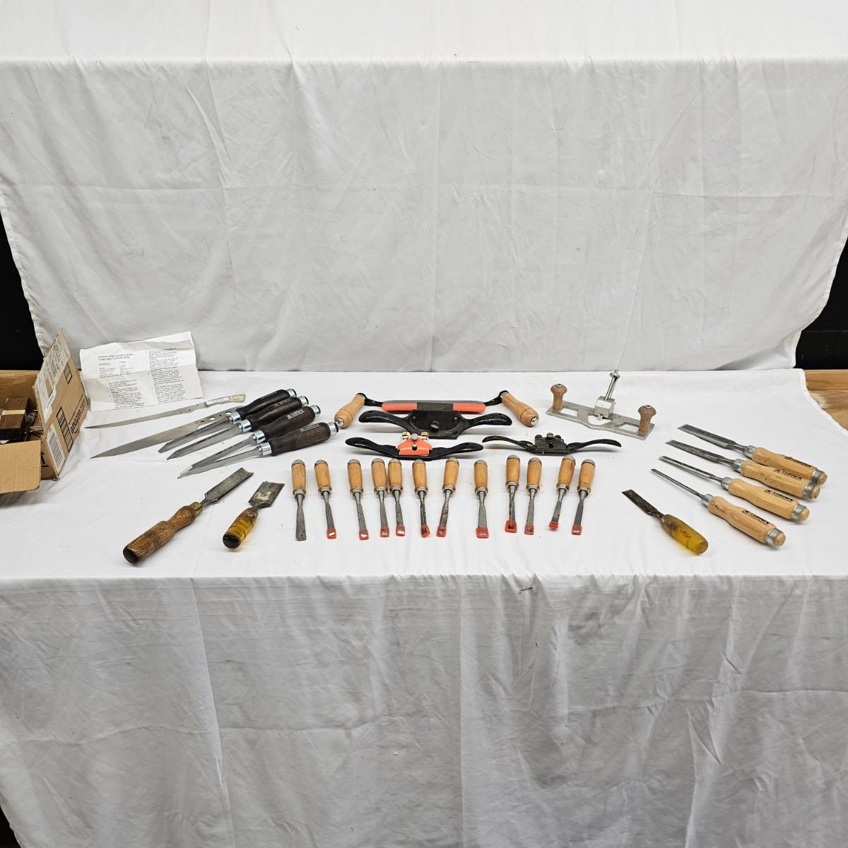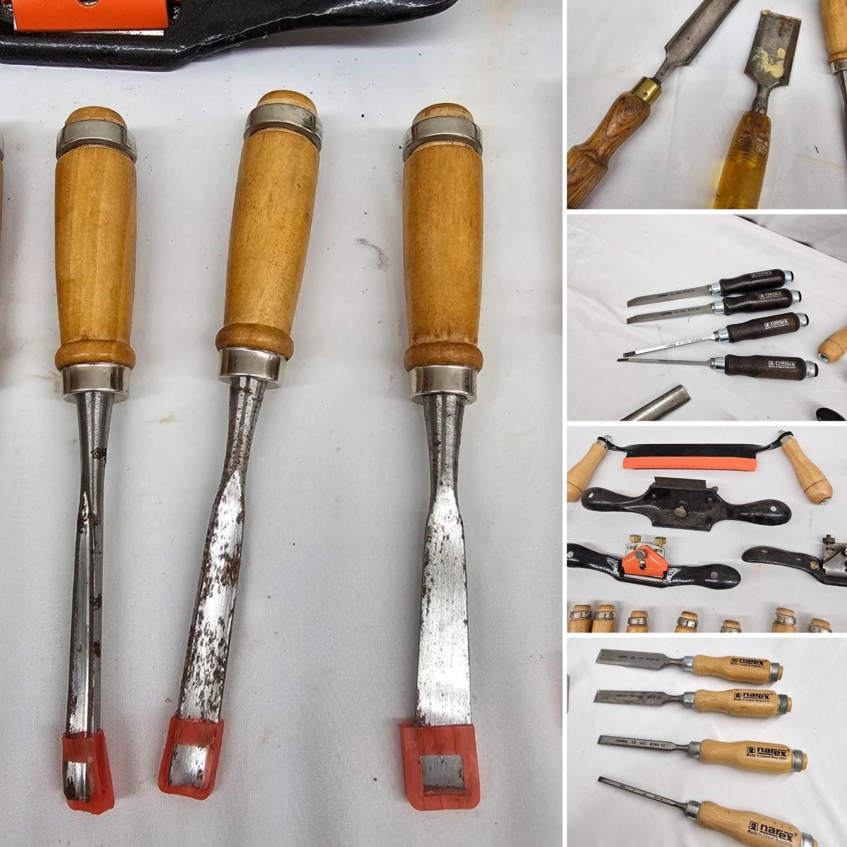 A set of 12 carving chisels, three Stanley spokeshaves and an assortment of Narex brand wood chisels in different sizes. Some miscellaneous smaller chisels and also a do it yourself knife making kit with blades, handle and instructions. See photos for details. Shipping available.