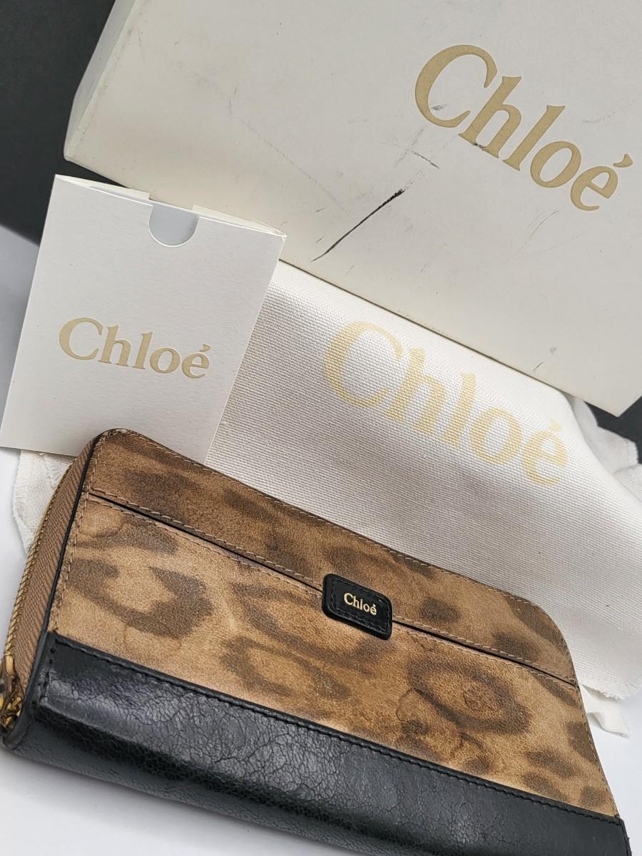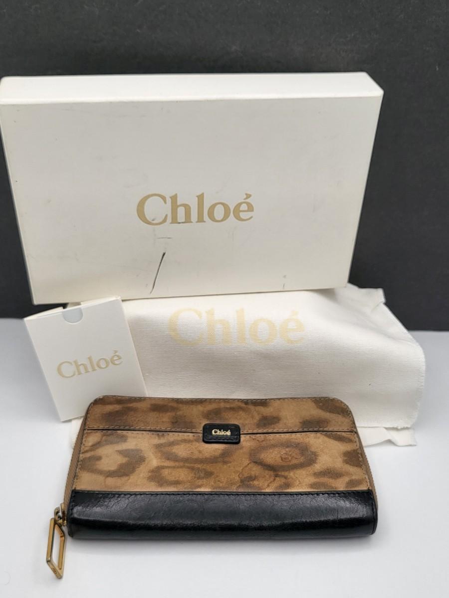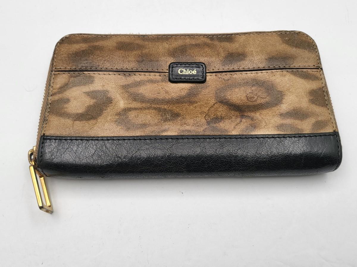 Authentic Chloe, brown animal print 3/4 zip around leather wallet. Comes with box and dust bag sleeve. Wallet measures 7.5" x 4". COA card. Good pre-owned condition.
