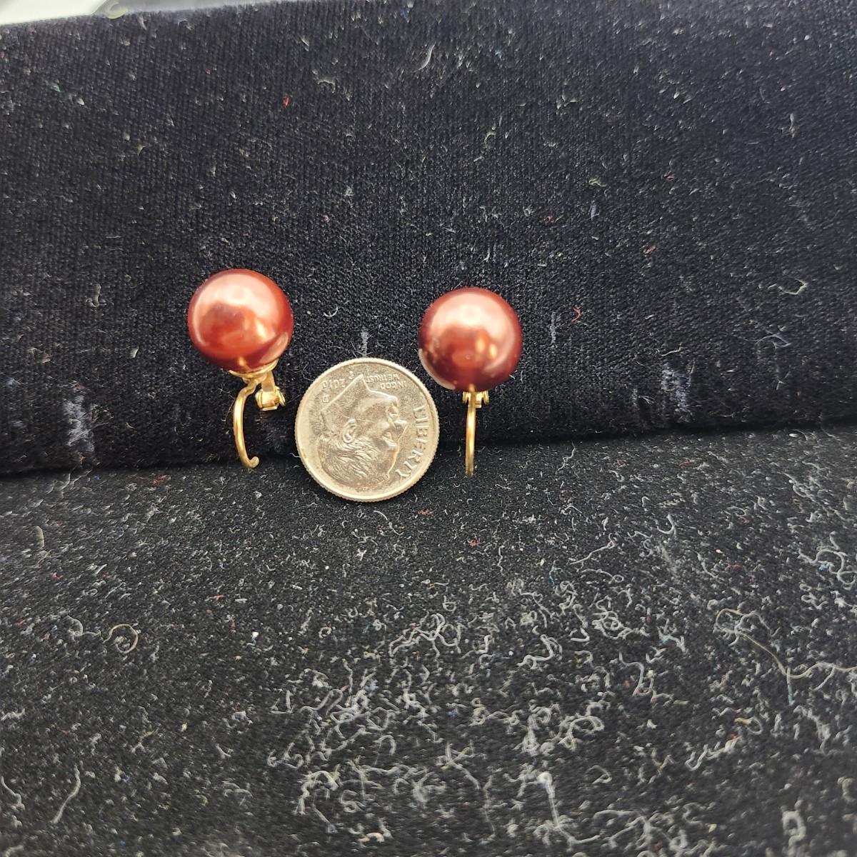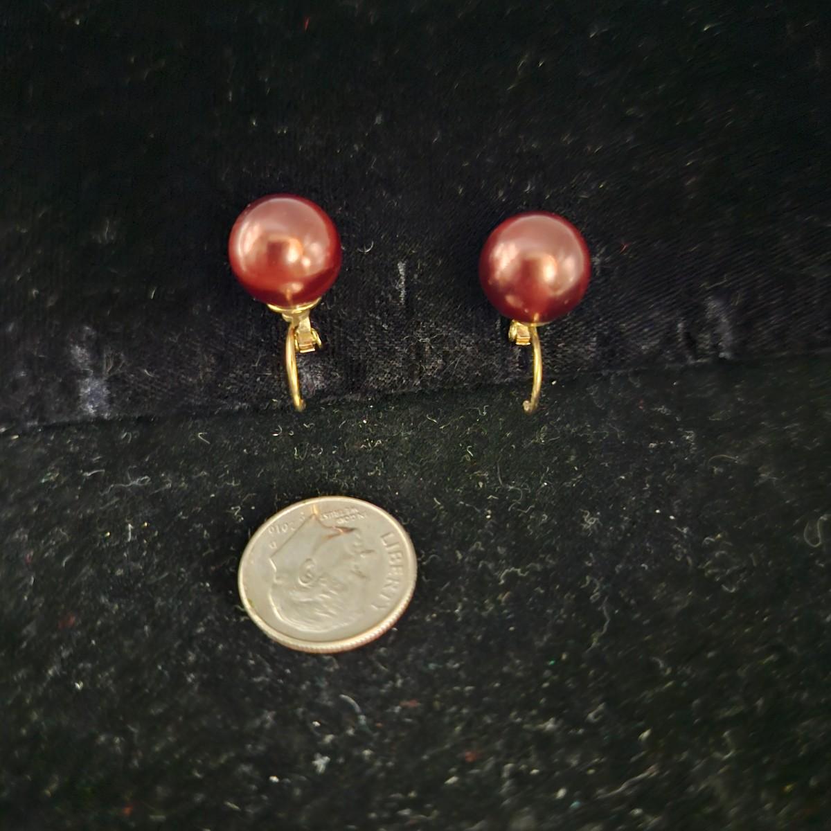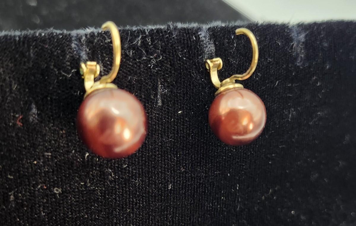 These are well matched South Sea Pearls, with a bronze chocolate coloring. 10K gold mounts. Great luster.