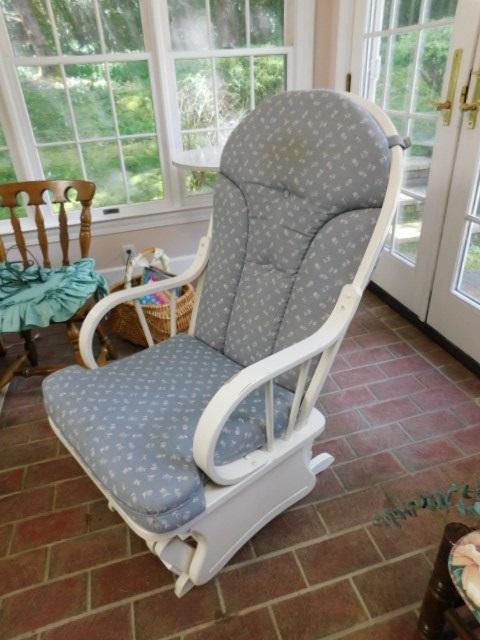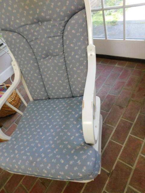 Choice One Glider Rocker with Upholstered Cushions paint is worn on the arm rests as shown