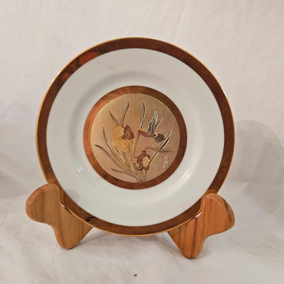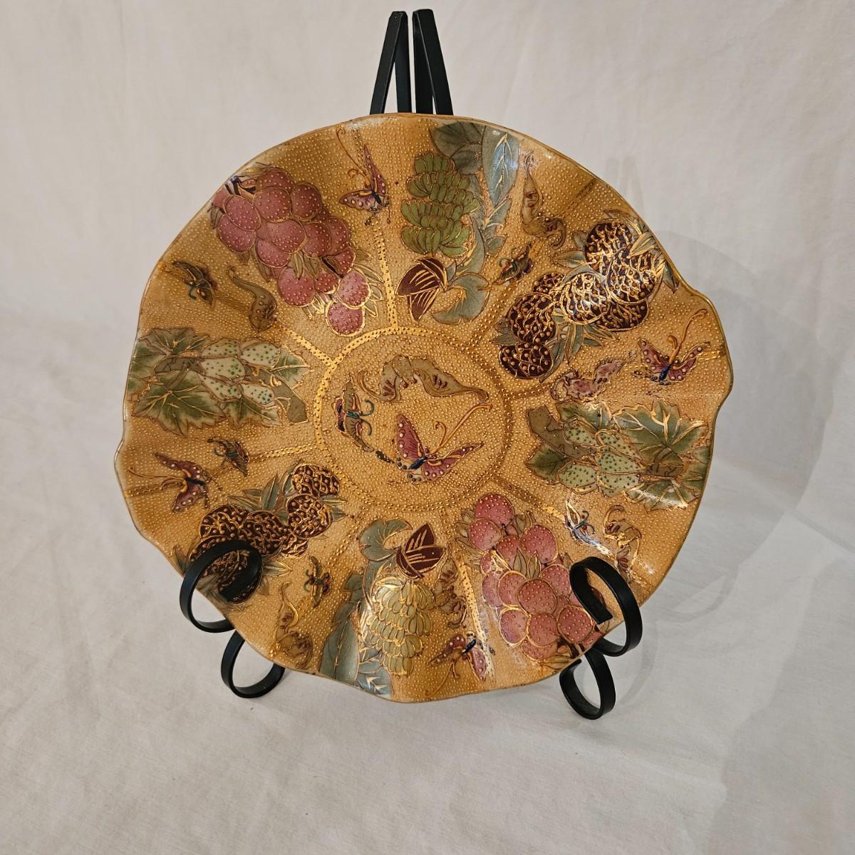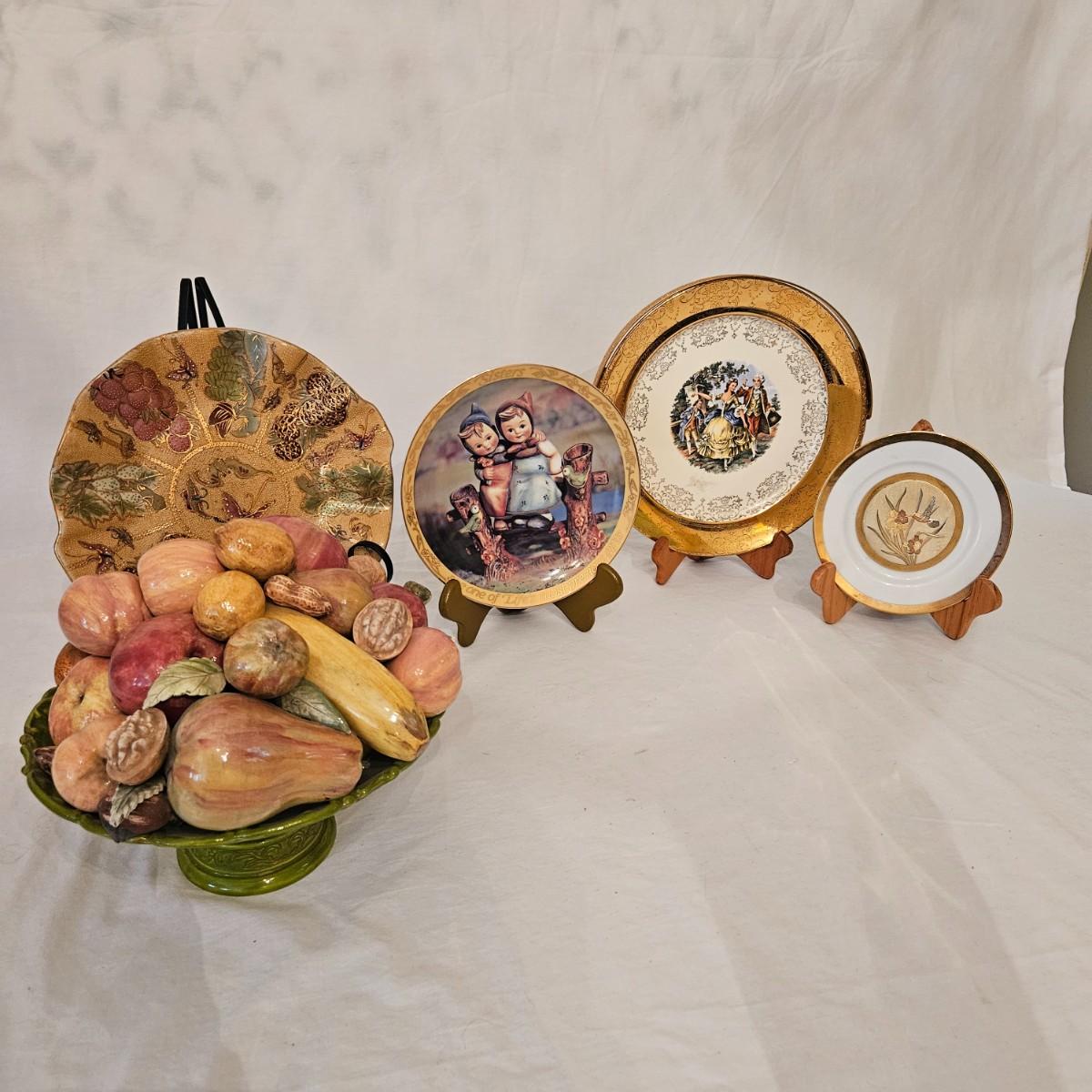 An assortment of decorative plates, easels and ceramic fruit. The plates include manufacturers such as Hummel, Chokin and Sabin. All four plates includes an easel. Also included is a ceramic fruit bowl that measures approximately 11"D x 9.5"H. Shipping available