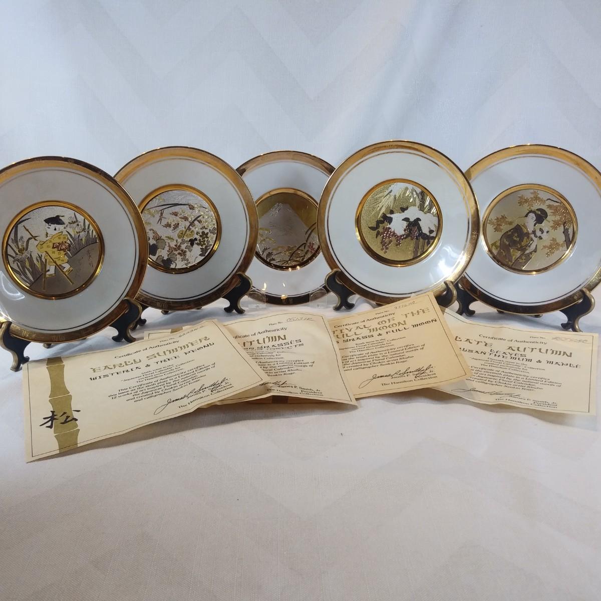 This auction lot is for Chokin Ware Plates - Lot B. This is a set of 5 plates from the Limited Edition of the 12 Works of Art from the Japanese Floral Calendar, produced for the Hamilton Collection. The Chokin artist is Shuko. The plates measure about 6-inches in diameter and all have boxes. This grouping includes numbers 7, 9, 10, 11, & 12. Plates 6, 9, 10, & 12 have their certificates.