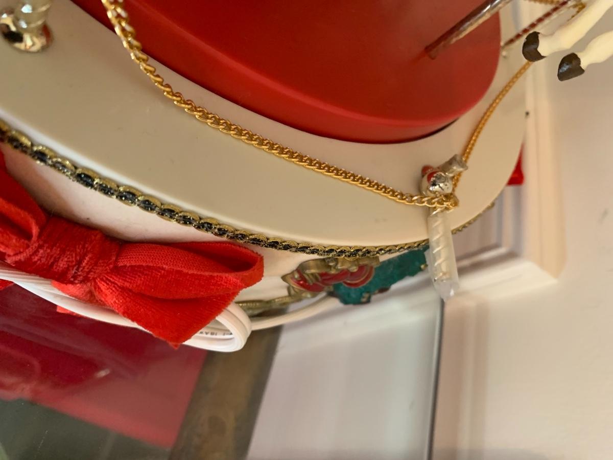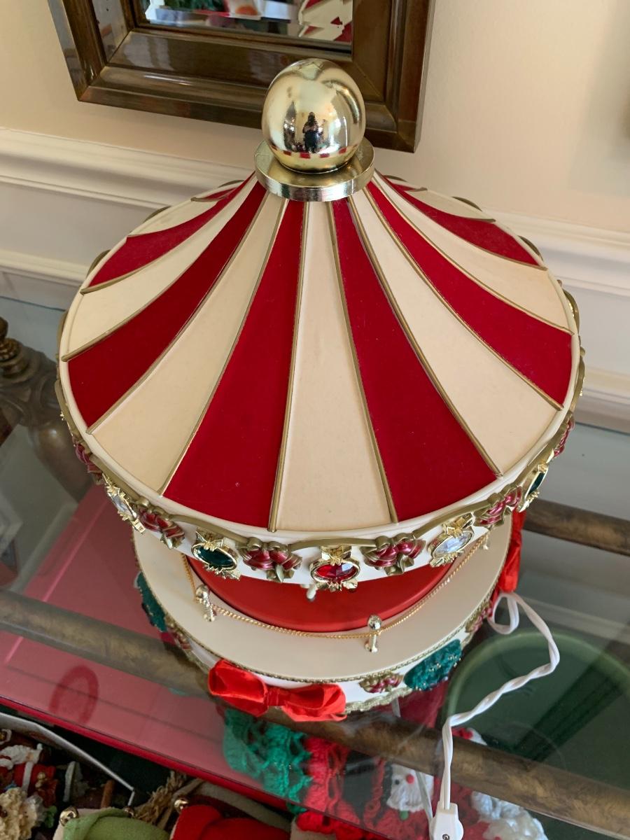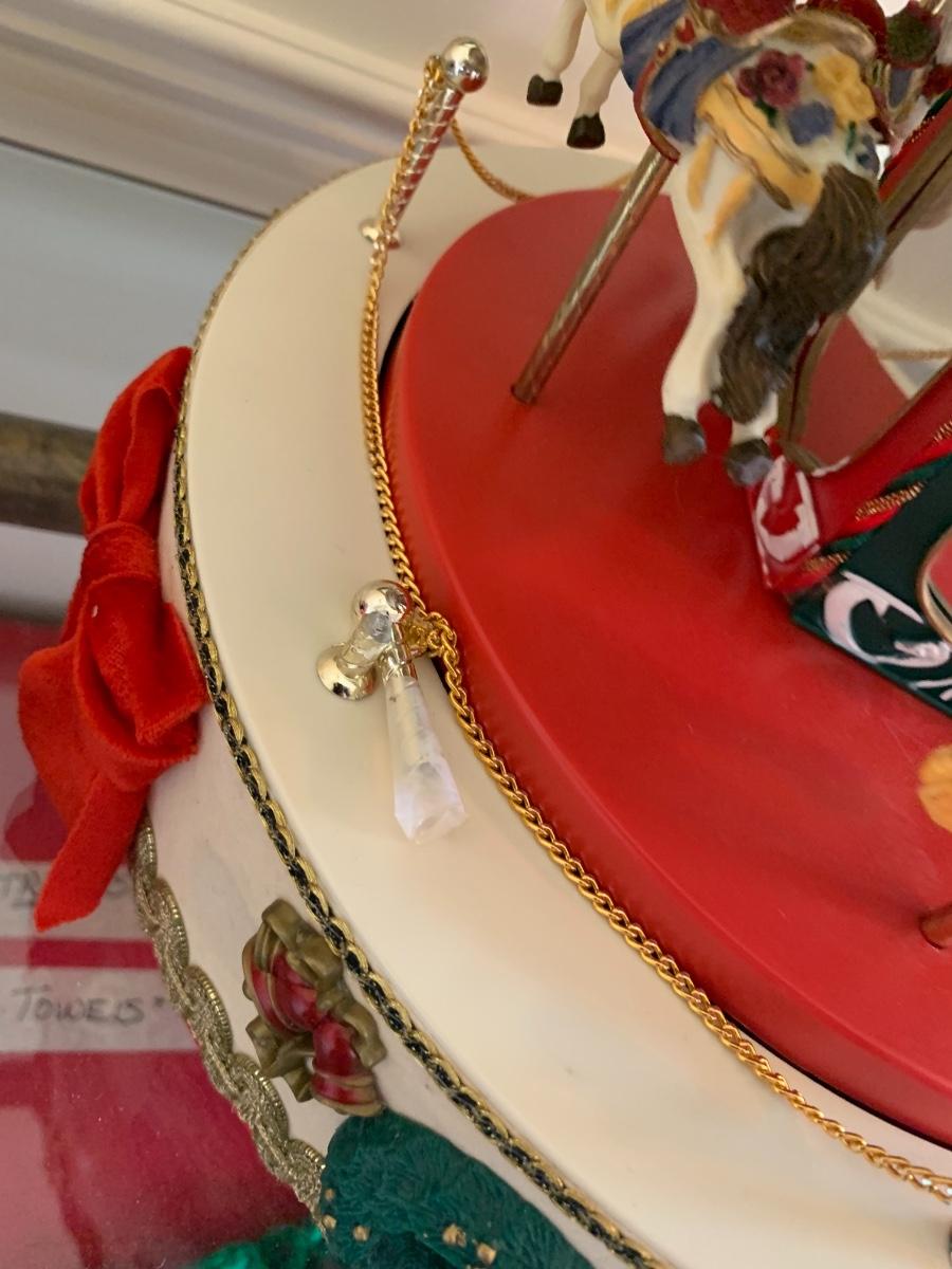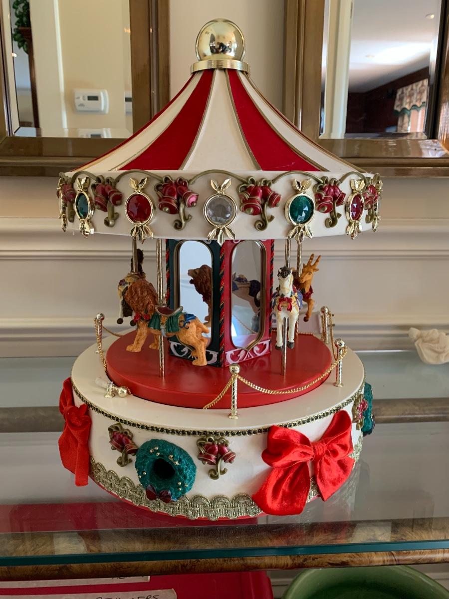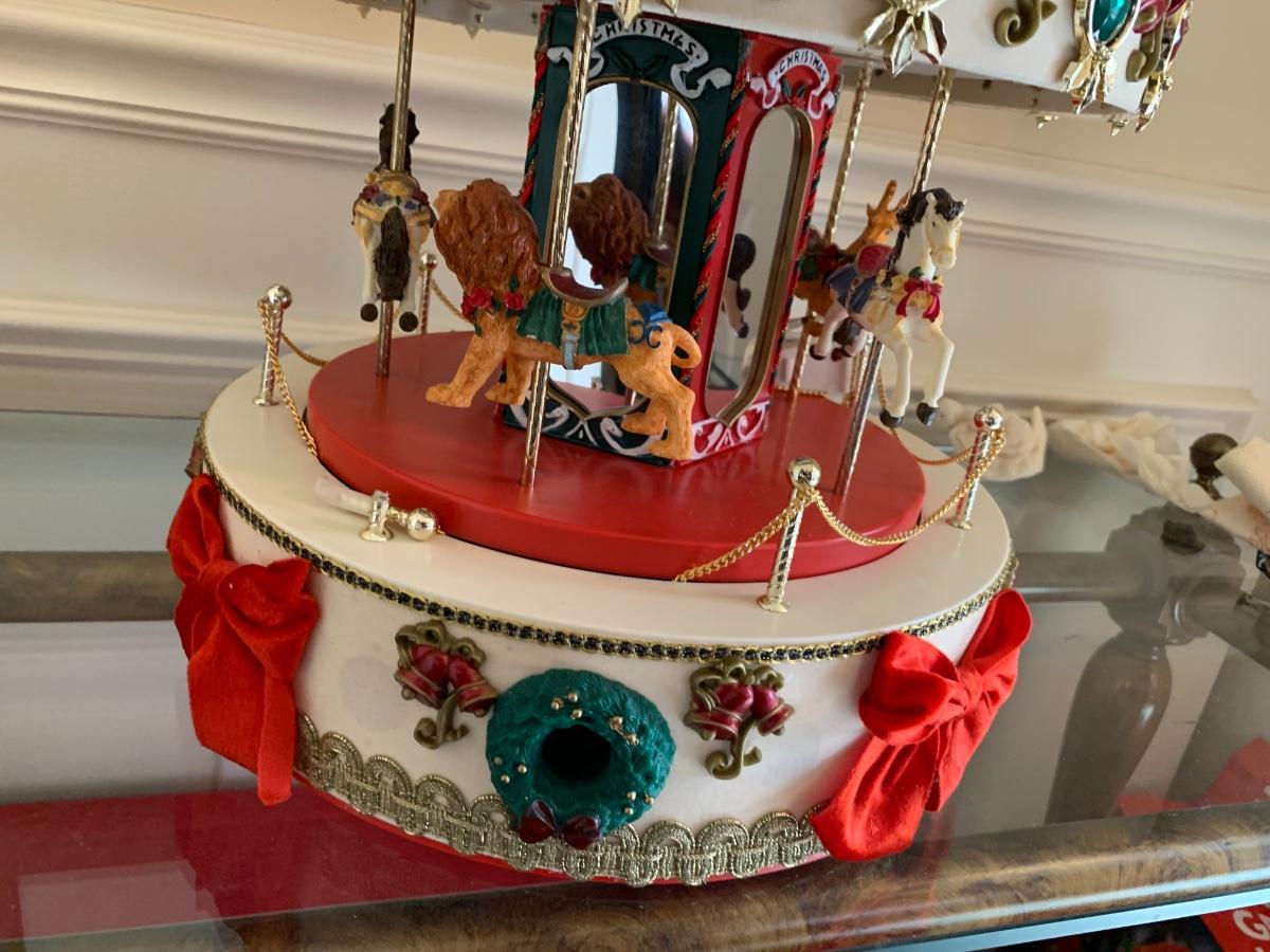 Electroni caraousel. Plays a variety of tunes. Does turn if you give it a push. Some poles are broken.