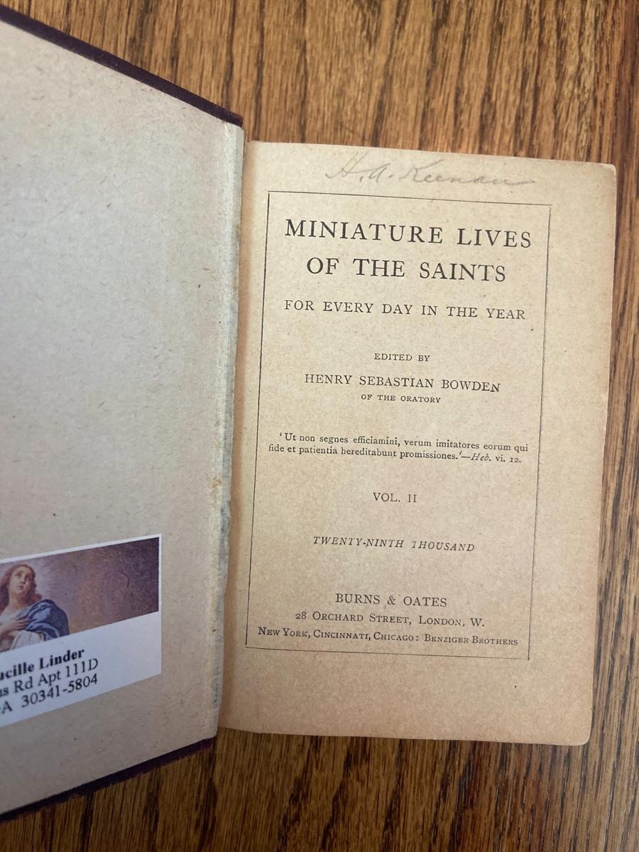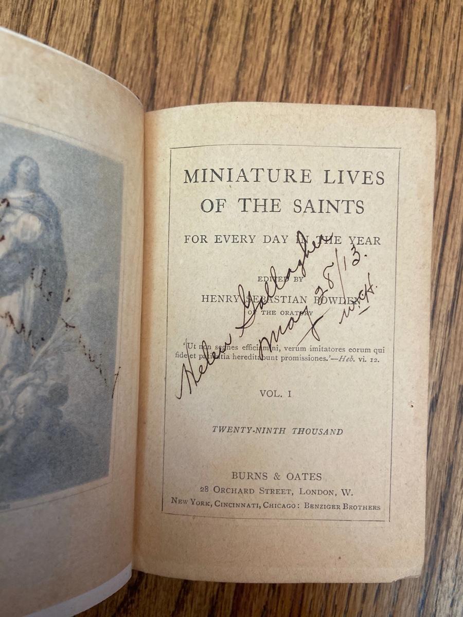 Miniature Lives Of The Saints for Every Day of the Year Edited by Henry Sebastian Bowden. Published by Burns And Oates. Volume one (1877) and Volume two (1892) brown hardcover,