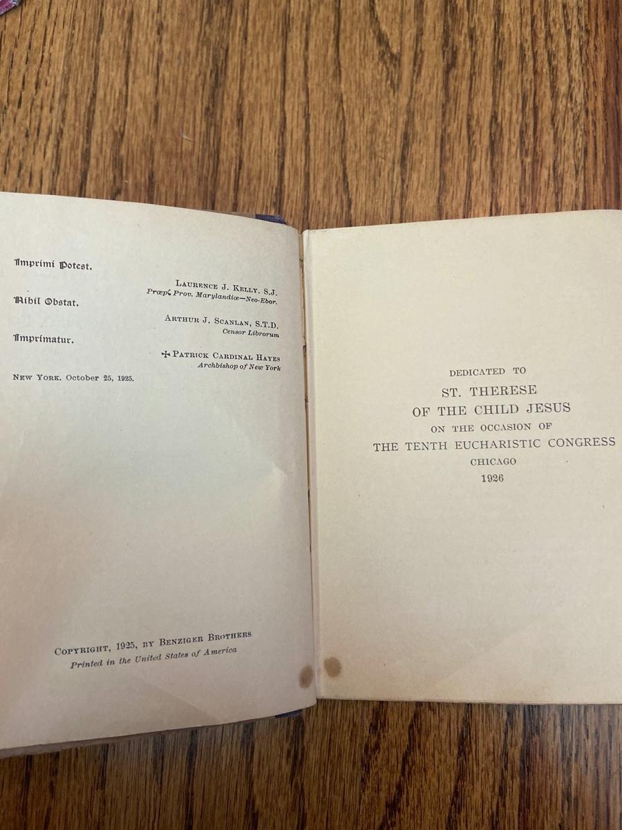 The Little Flower and the Blessed Sacrament by Rev. Joesph Husslein, S.J (1925), published by the Benziger Brothers. Tan Hardcover.