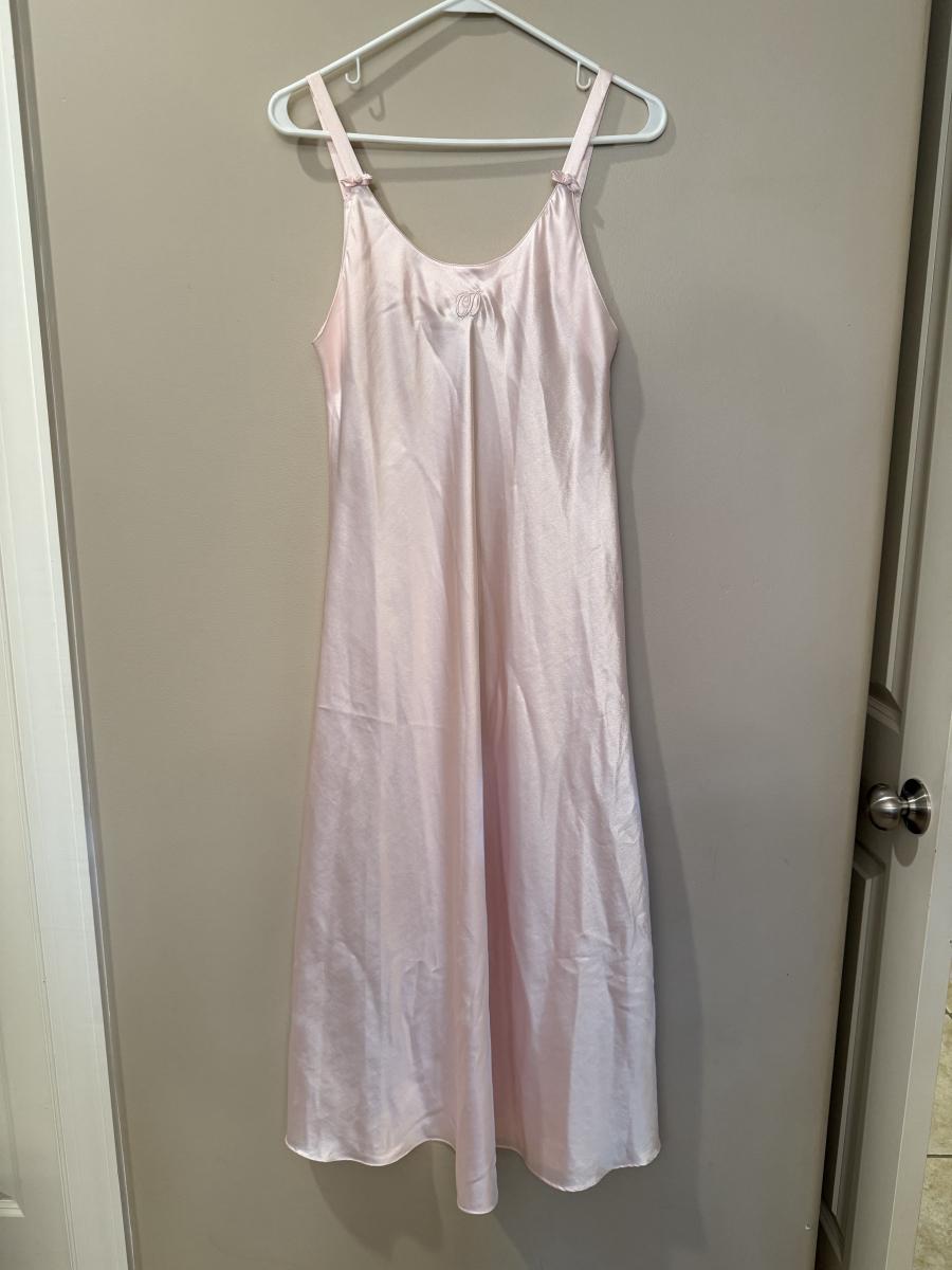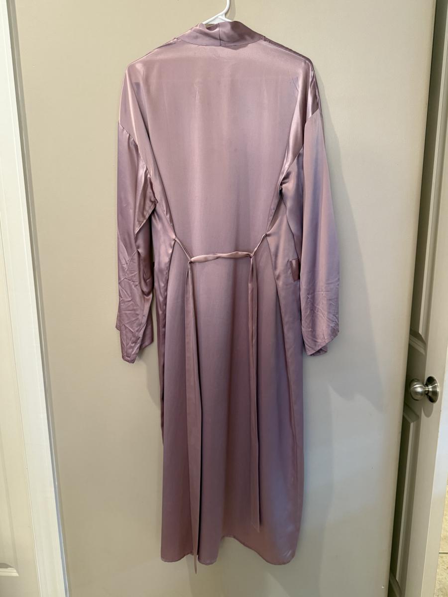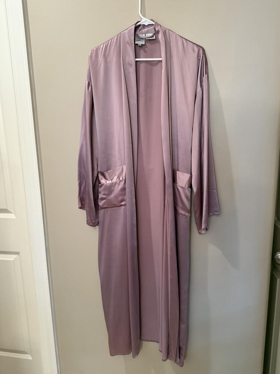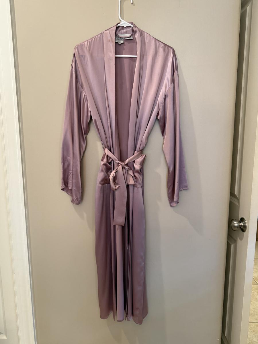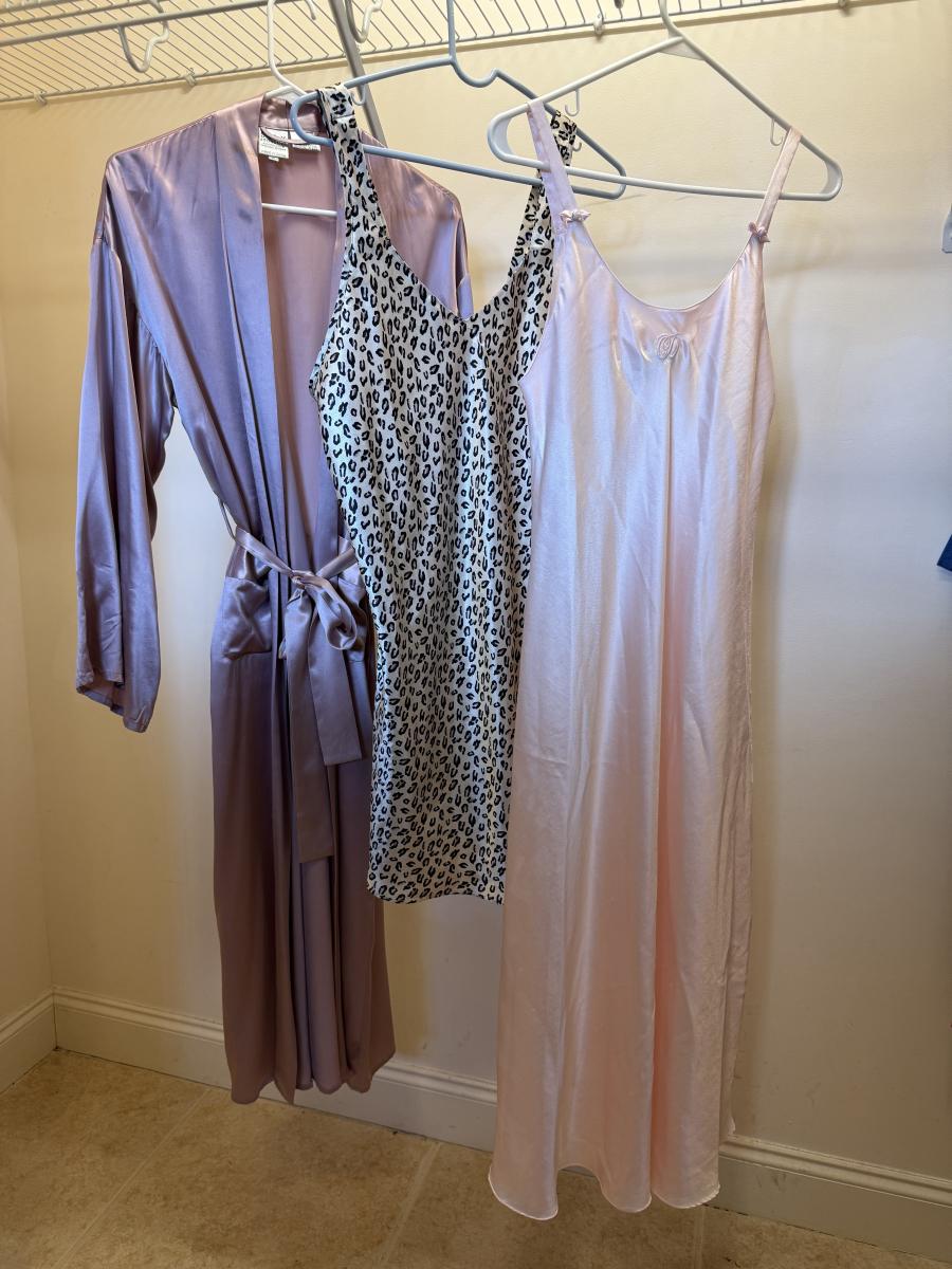 Three silky nighttime garments. The Christian Dior nightgown is a baby pink color and size small. It is 19” from pit to pit and about 50” long. The Kim Rogers cheetah print nightgown is size medium. The mauve colored Silk Collection 100% silk robe is a size medium. It has some stains that appear to be mostly cleanable. Unsure what the white substance is.