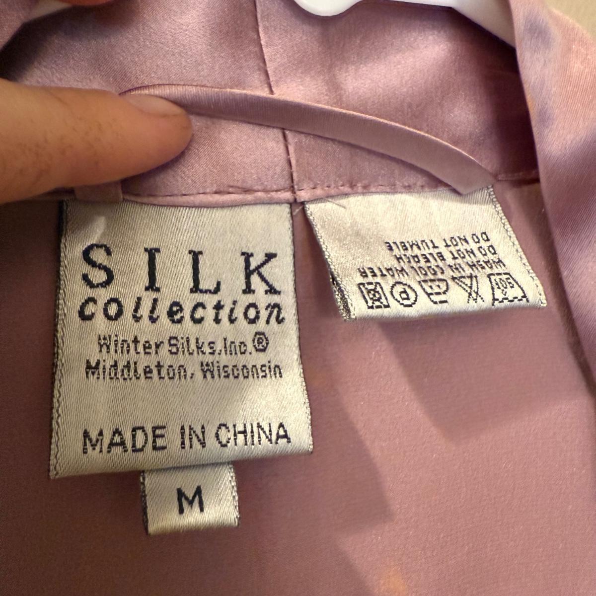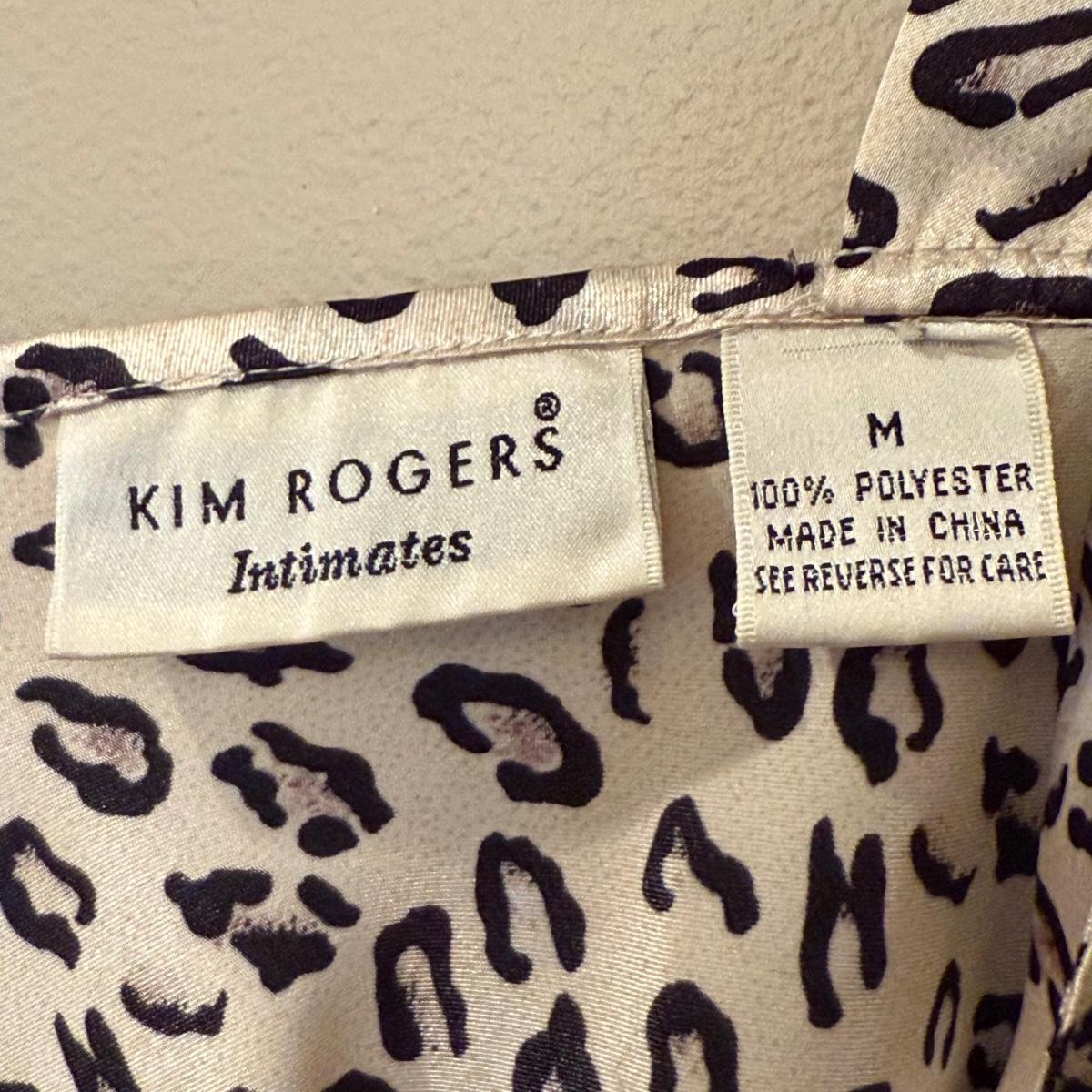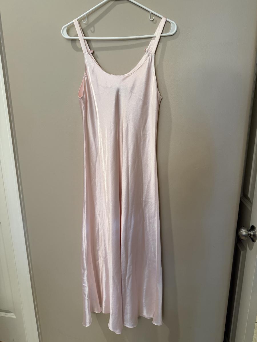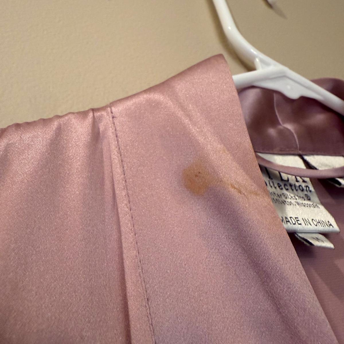Three silky nighttime garments. The Christian Dior nightgown is a baby pink color and size small. It is 19” from pit to pit and about 50” long. The Kim Rogers cheetah print nightgown is size medium. The mauve colored Silk Collection 100% silk robe is a size medium. It has some stains that appear to be mostly cleanable. Unsure what the white substance is.