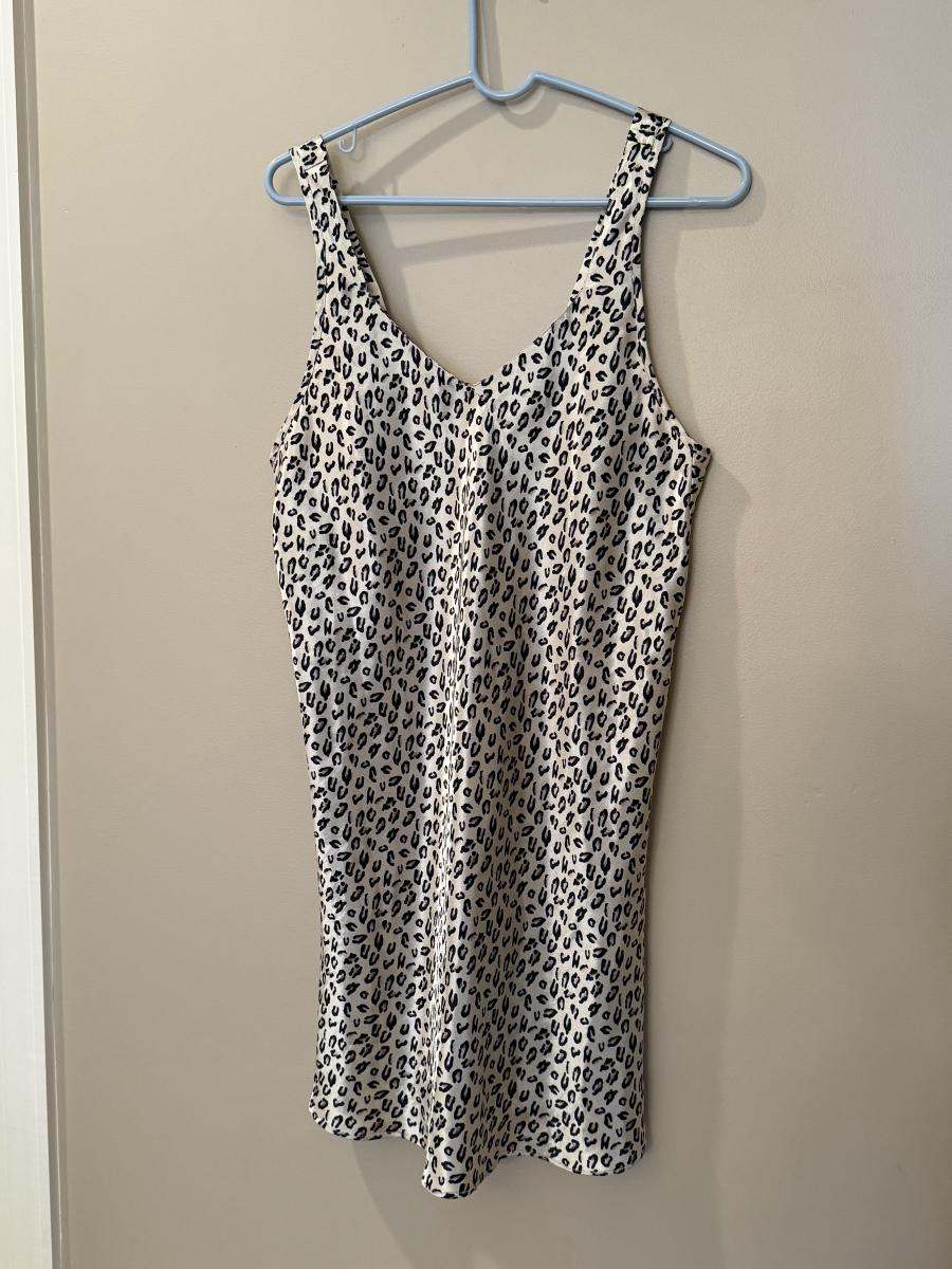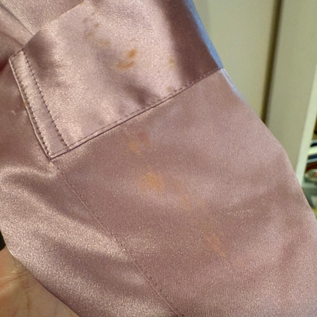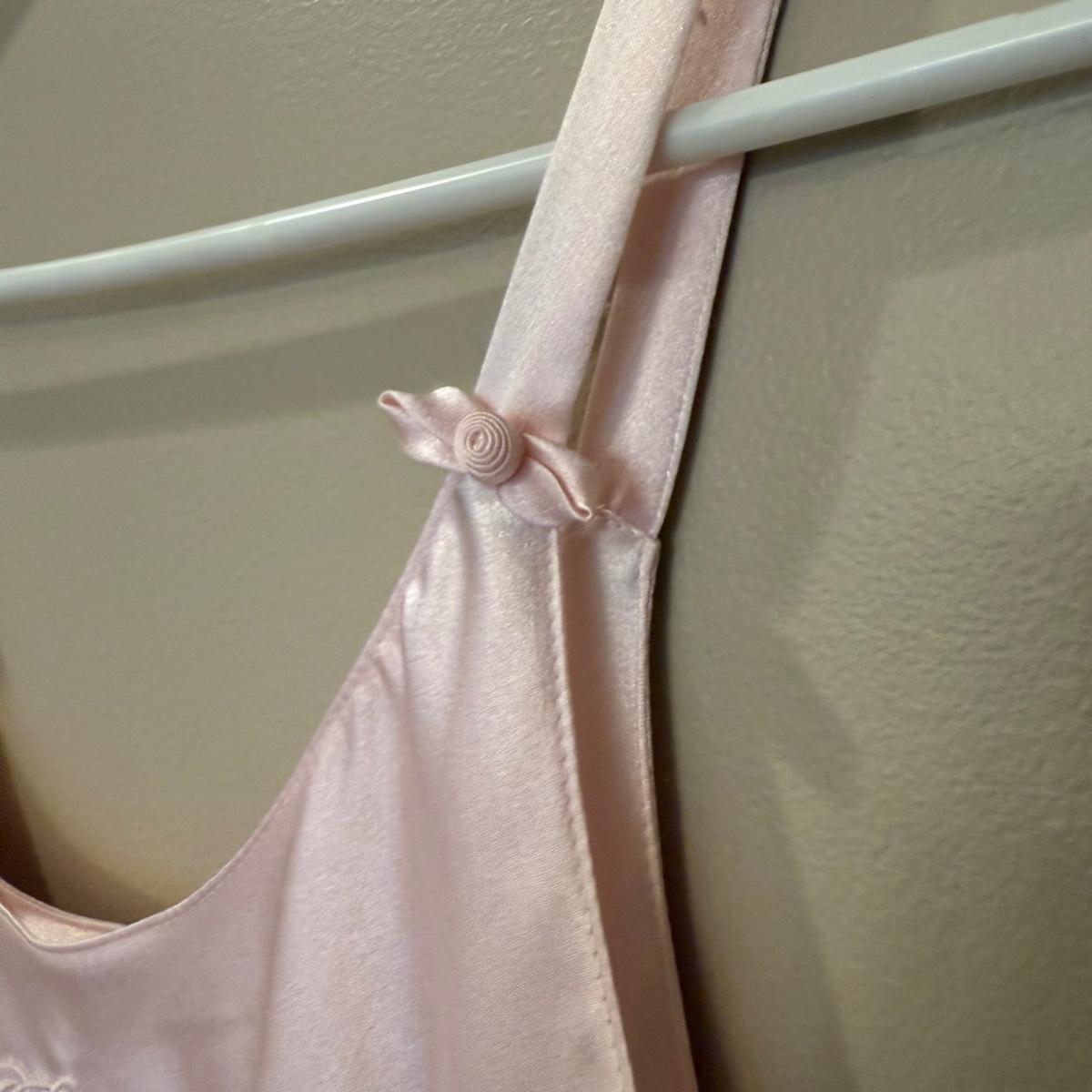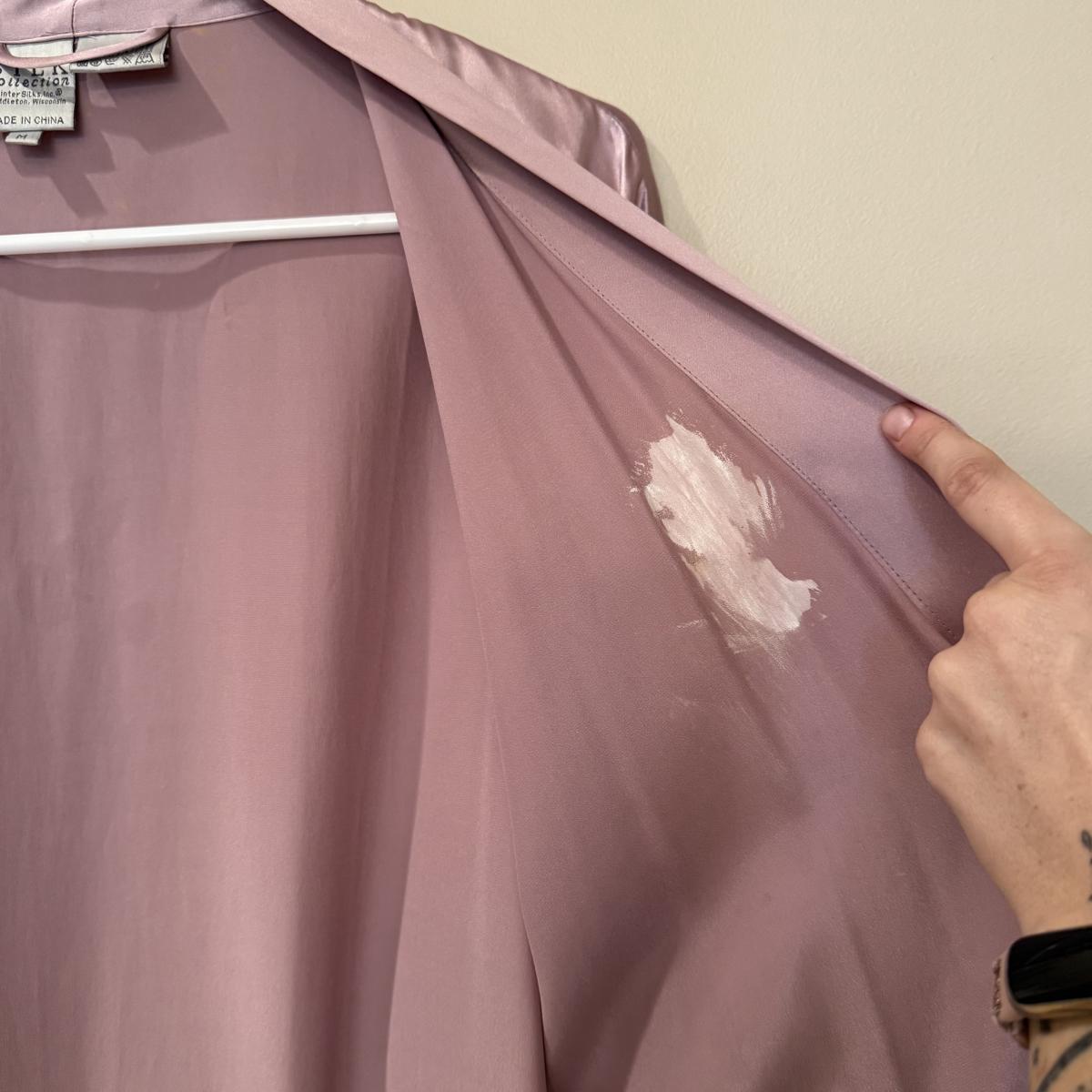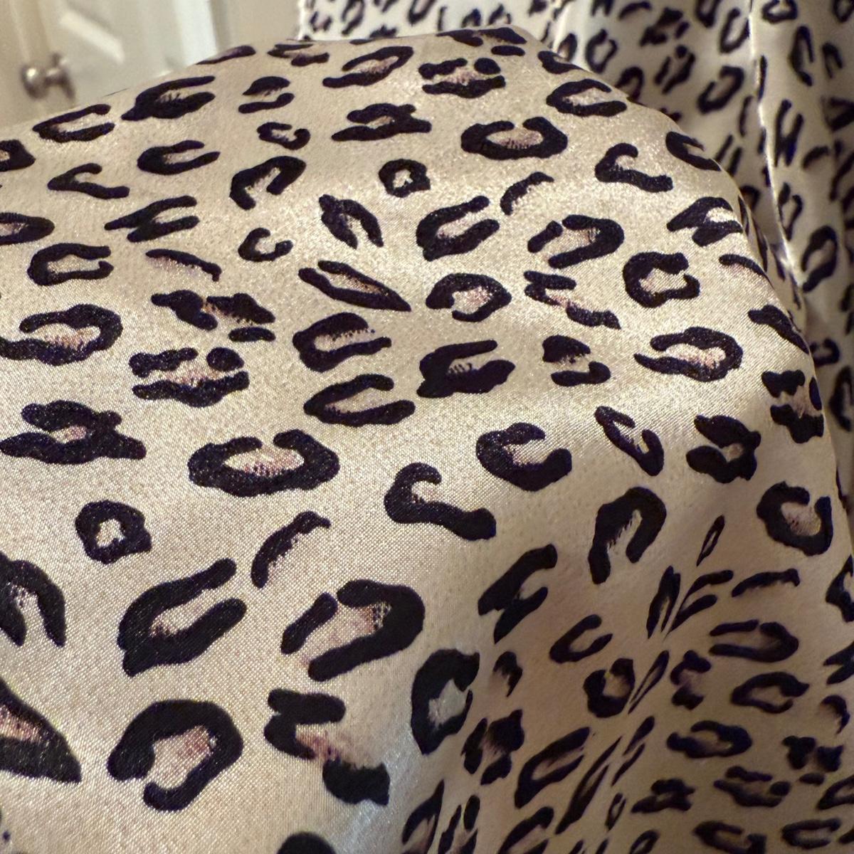 Three silky nighttime garments. The Christian Dior nightgown is a baby pink color and size small. It is 19” from pit to pit and about 50” long. The Kim Rogers cheetah print nightgown is size medium. The mauve colored Silk Collection 100% silk robe is a size medium. It has some stains that appear to be mostly cleanable. Unsure what the white substance is.