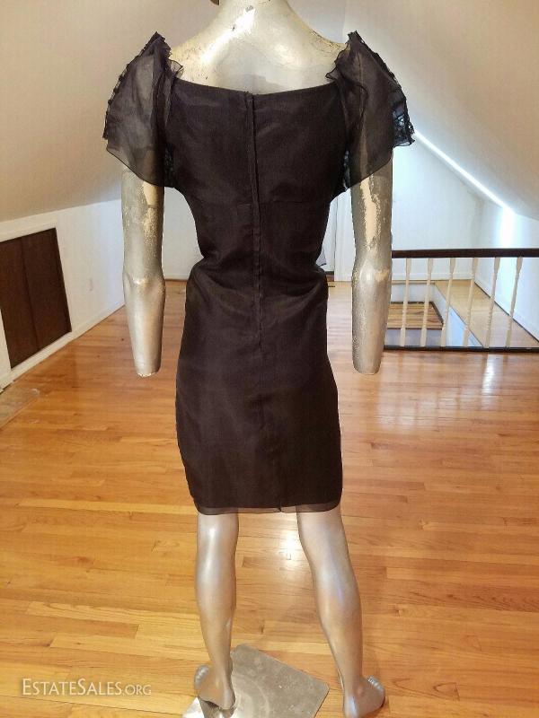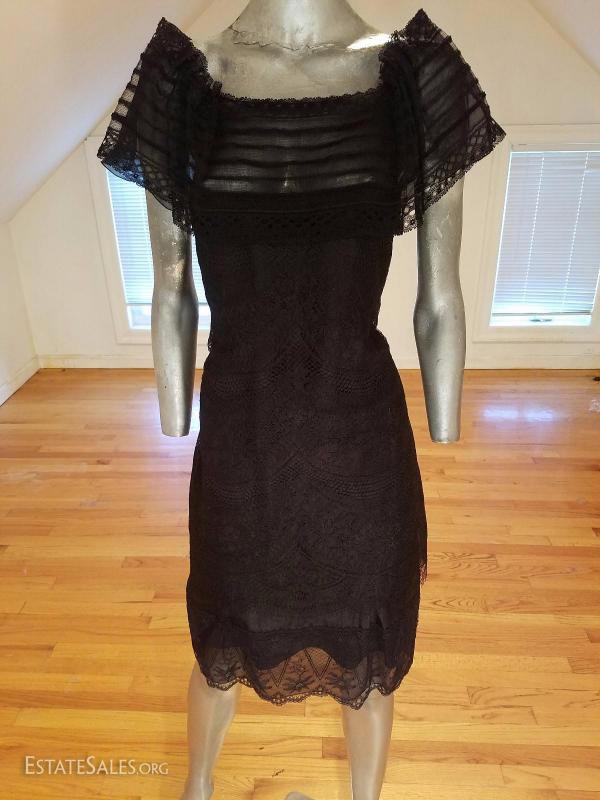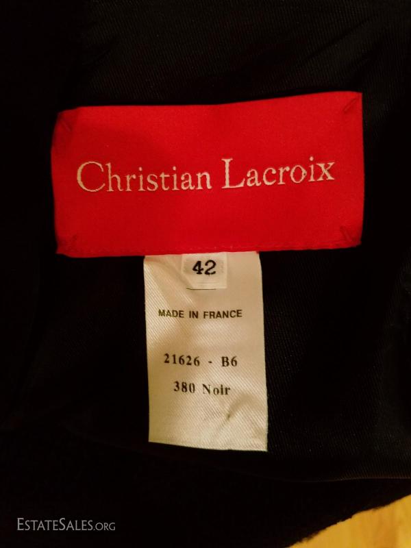 Iconic runway dress by Iconic couture designer Christian Lacroix Chantilly lace layered with silk organza backing, Poet gathered neckline with the lace and organza plus ribbons. True Couture and was used only for a runway show in Toulouse, France.A collector's dream a one of a kind.