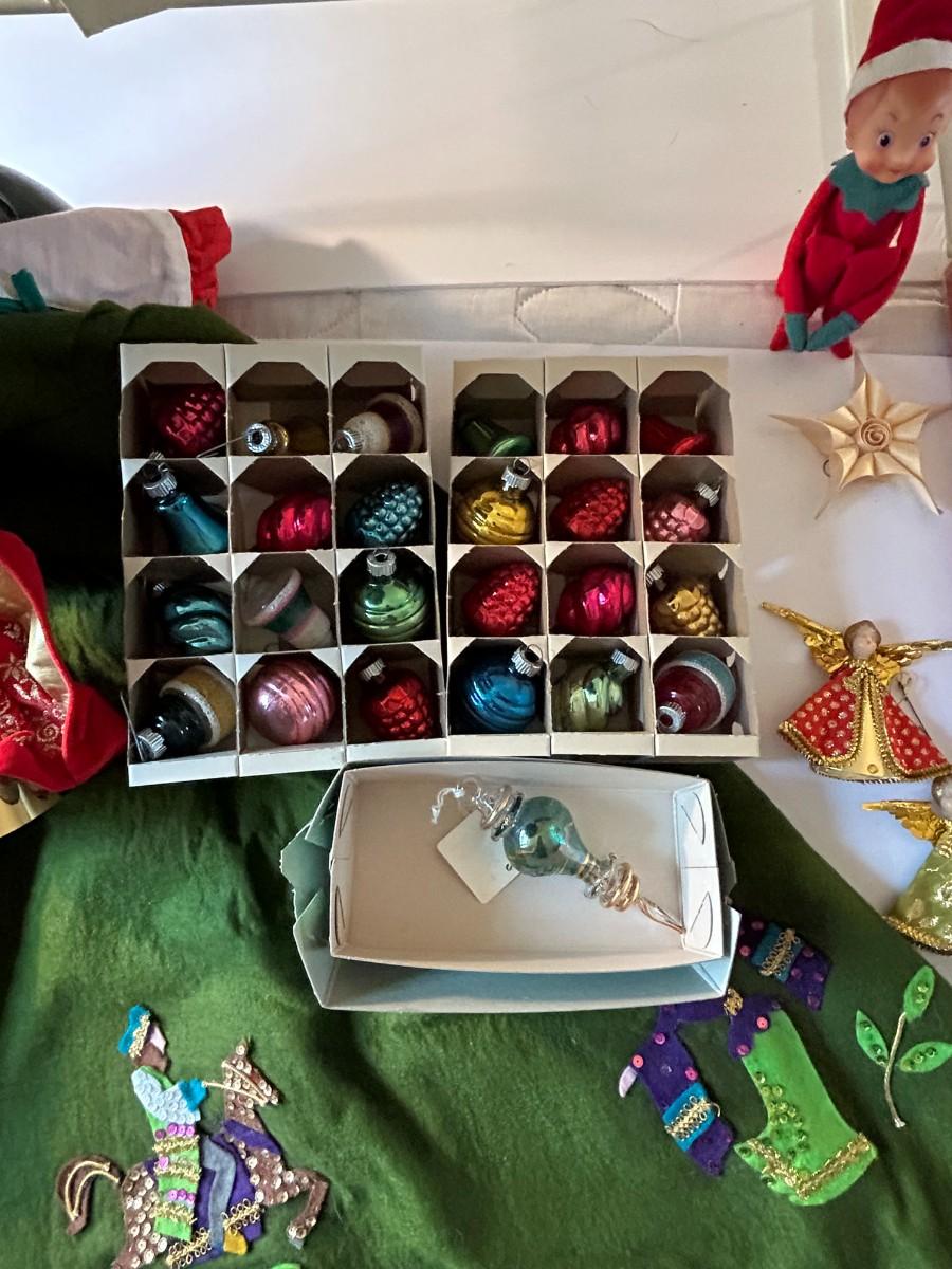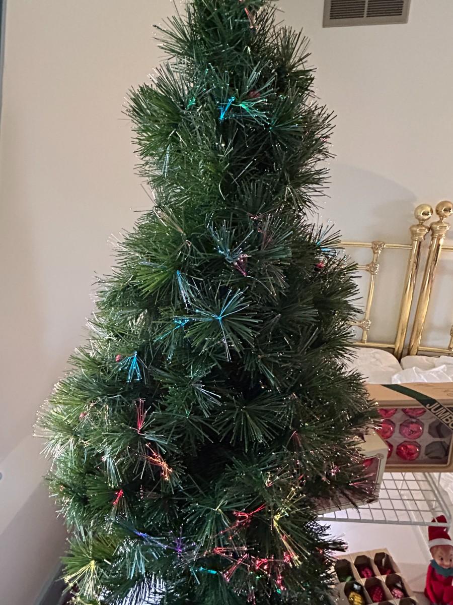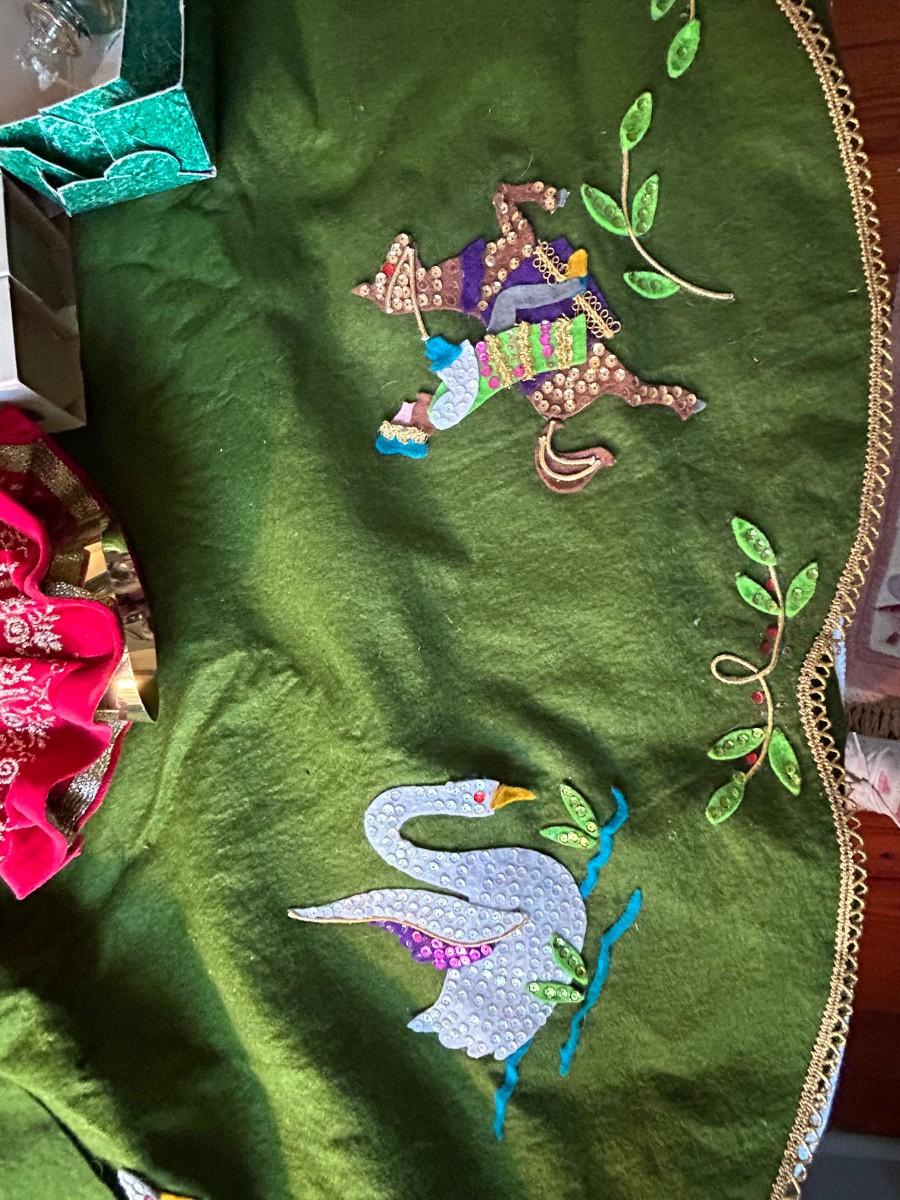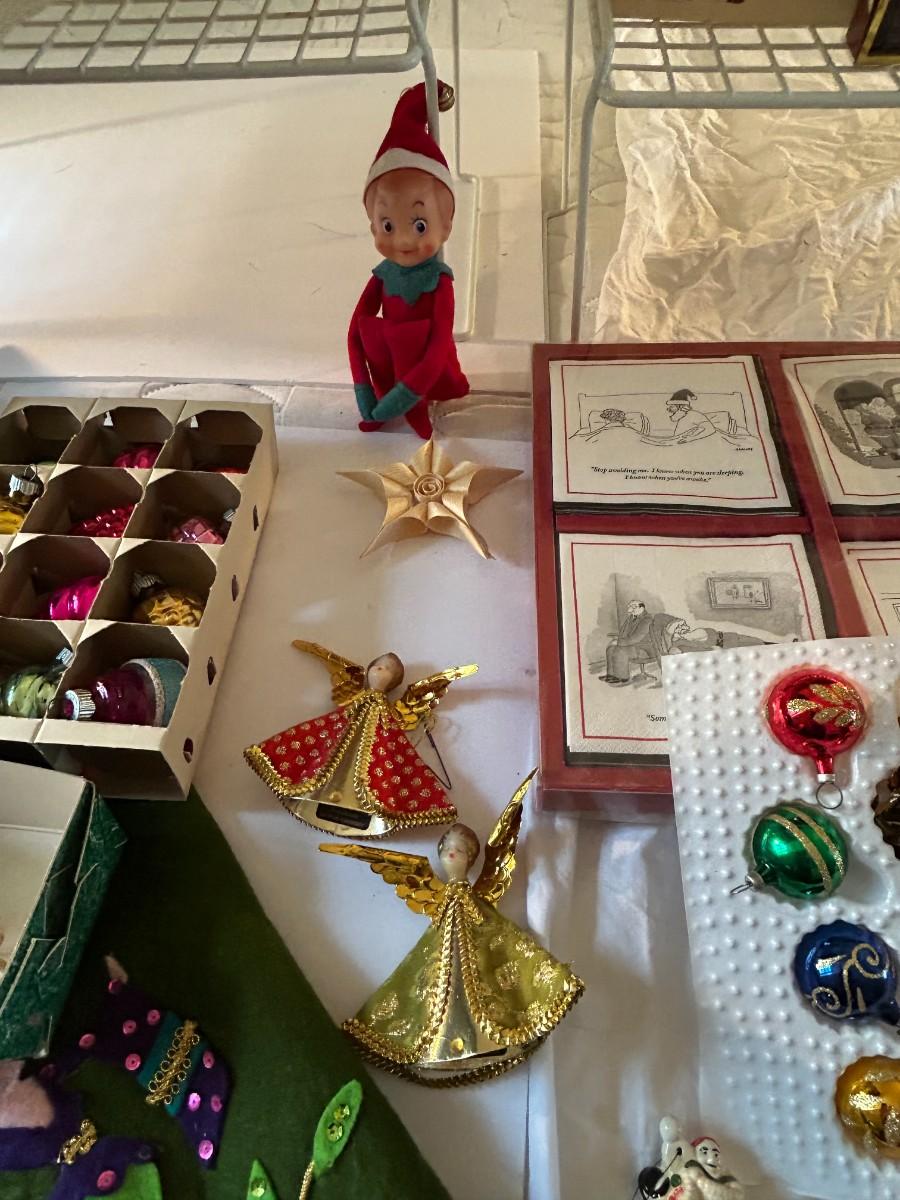 Rotating fiber optic tree, handmade tree skirt telling story of the Twelve Days of Christmas, ornaments, silly napkins and your very own original "Elf on the Shelf",