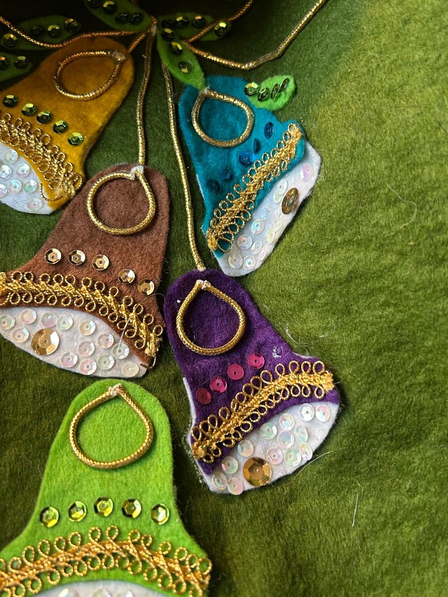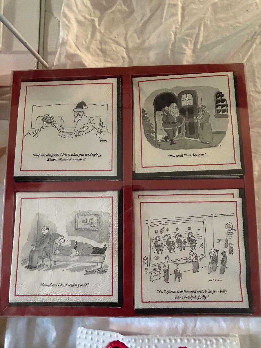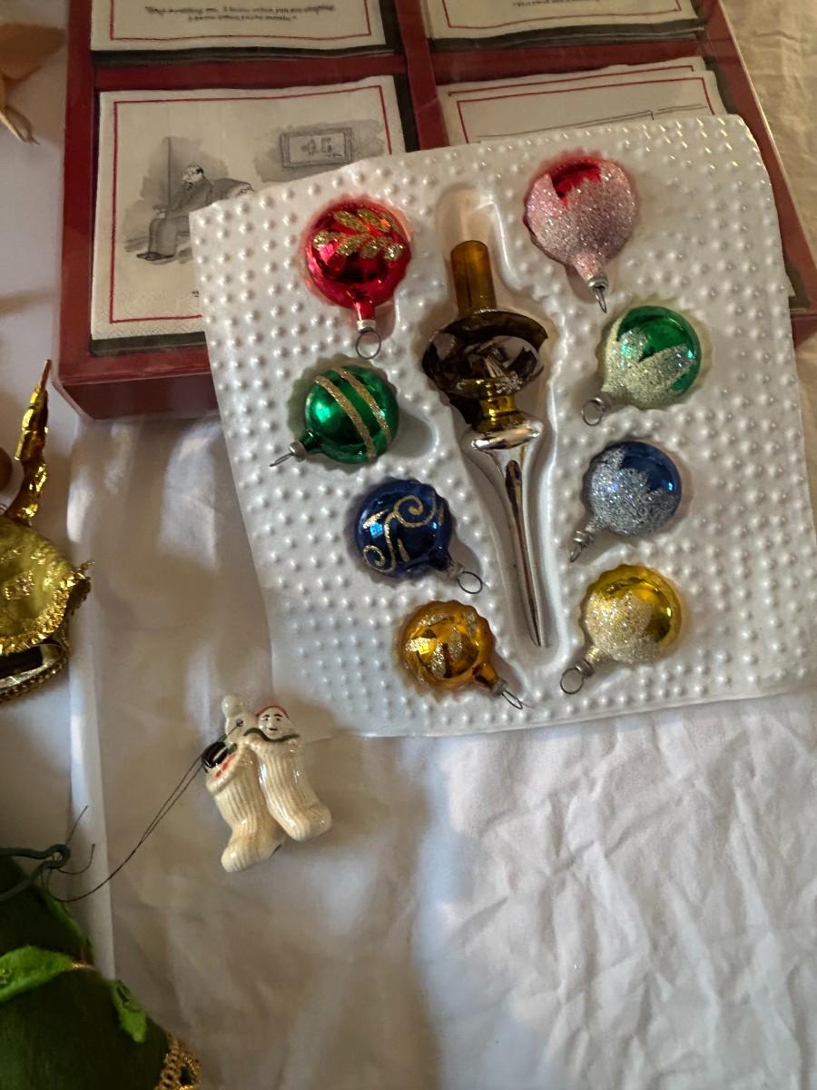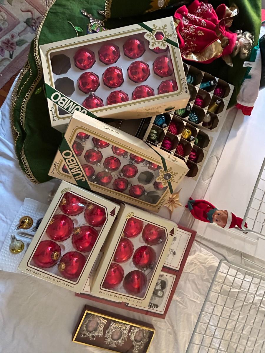 Rotating fiber optic tree, handmade tree skirt telling story of the Twelve Days of Christmas, ornaments, silly napkins and your very own original "Elf on the Shelf",