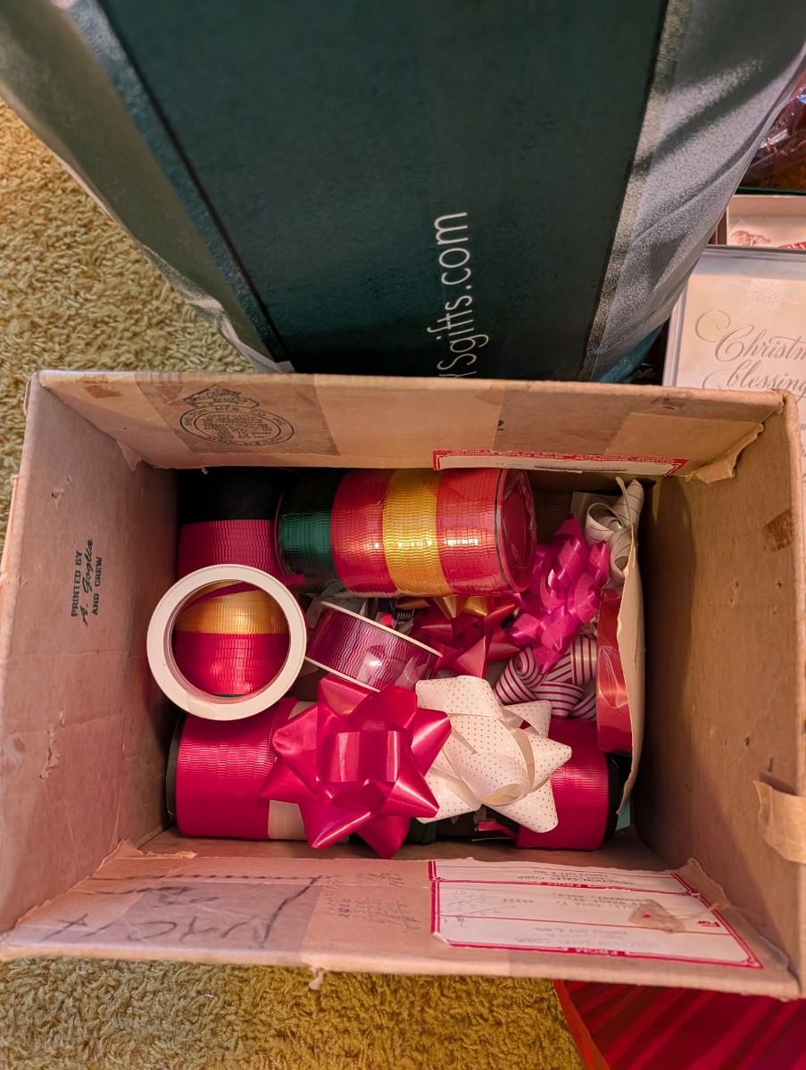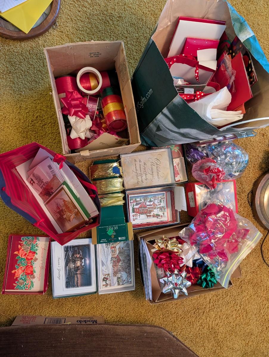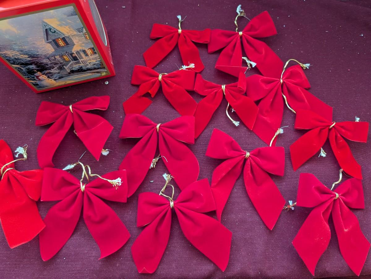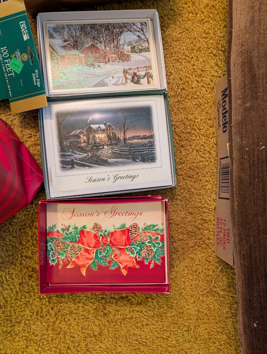 Christmas for packages, vintage red velvet bows vintage Merry Christmas box with snowman Christmas cards some Christmas ribbon.