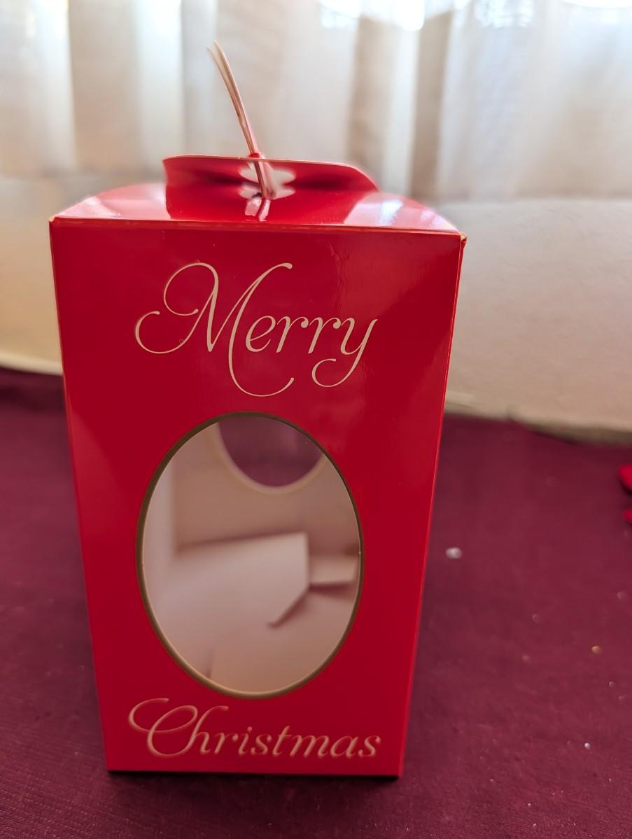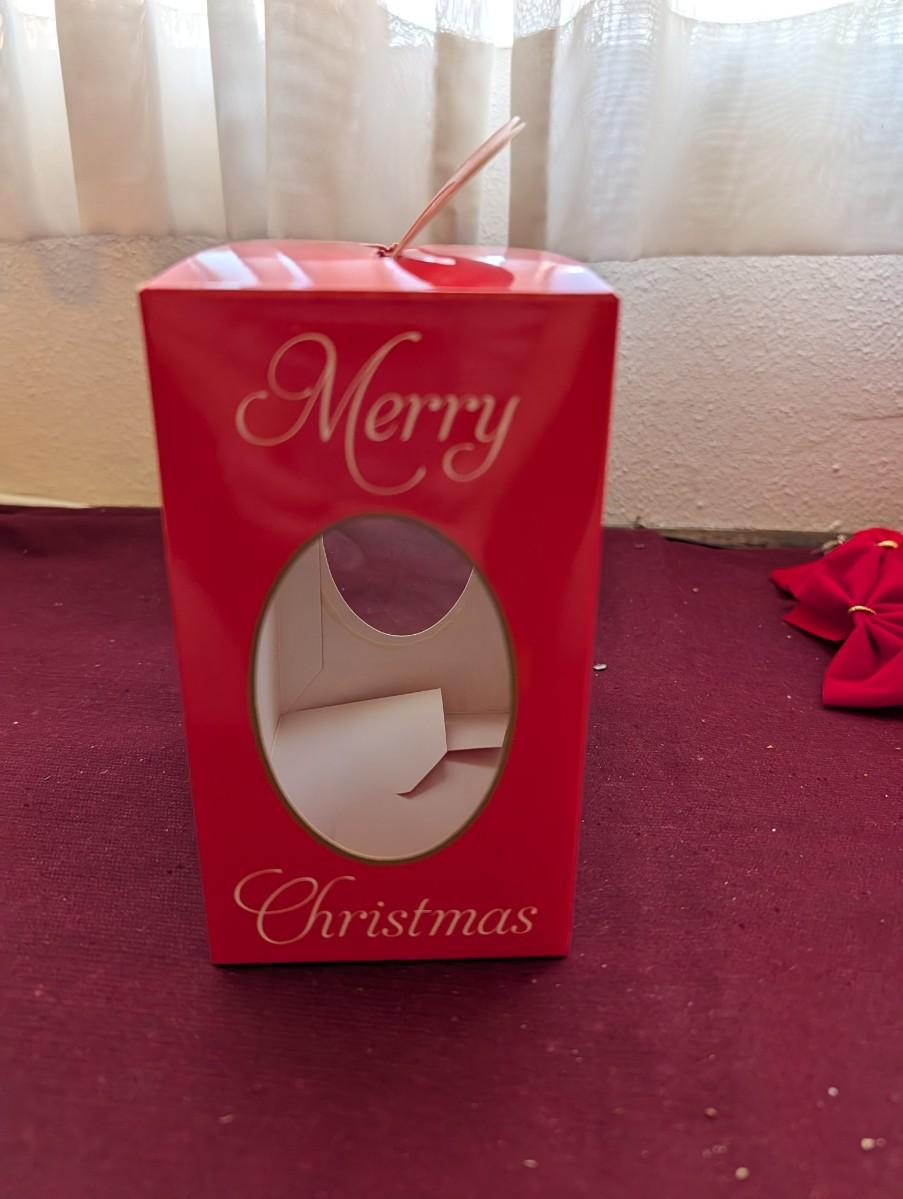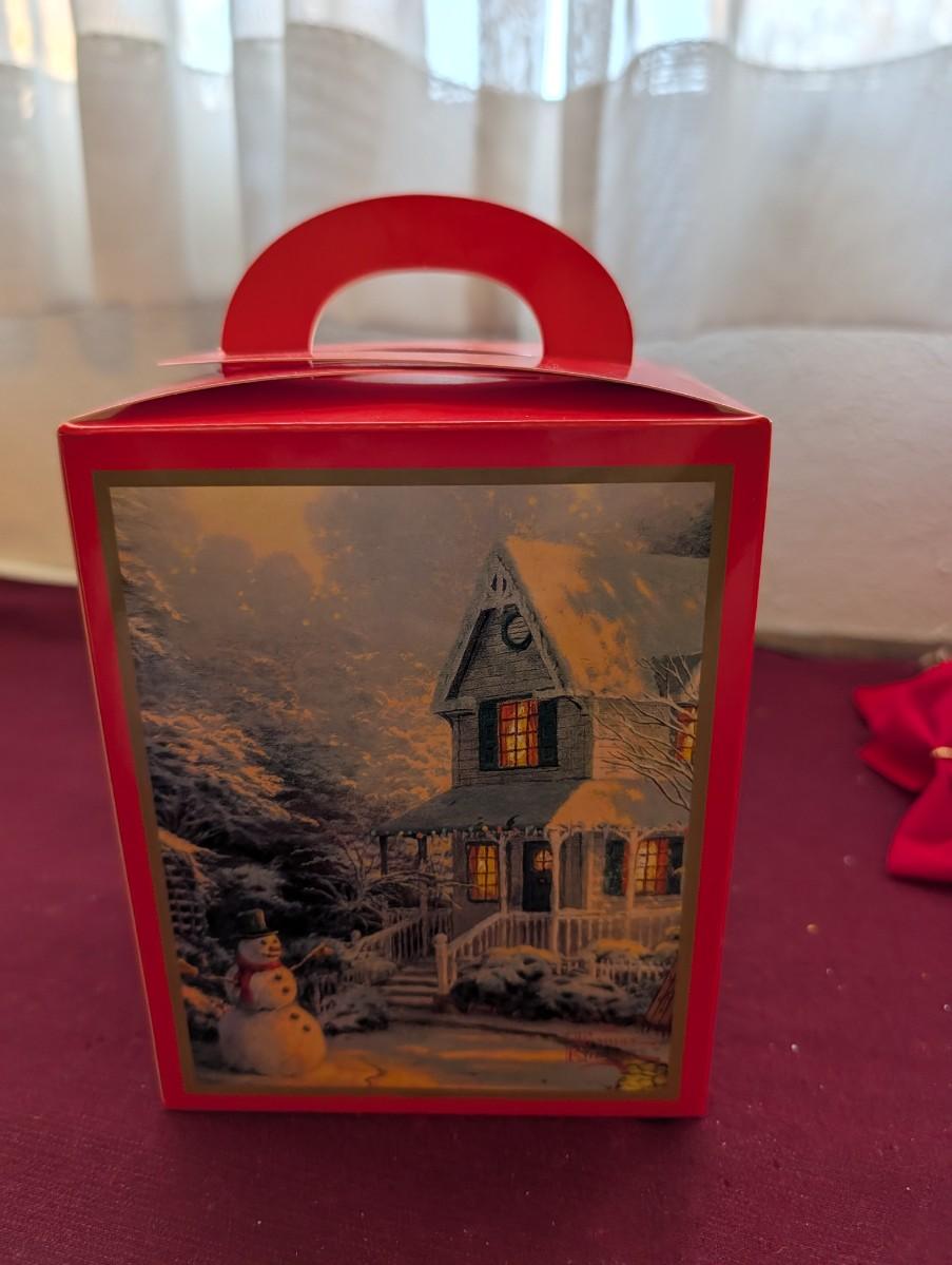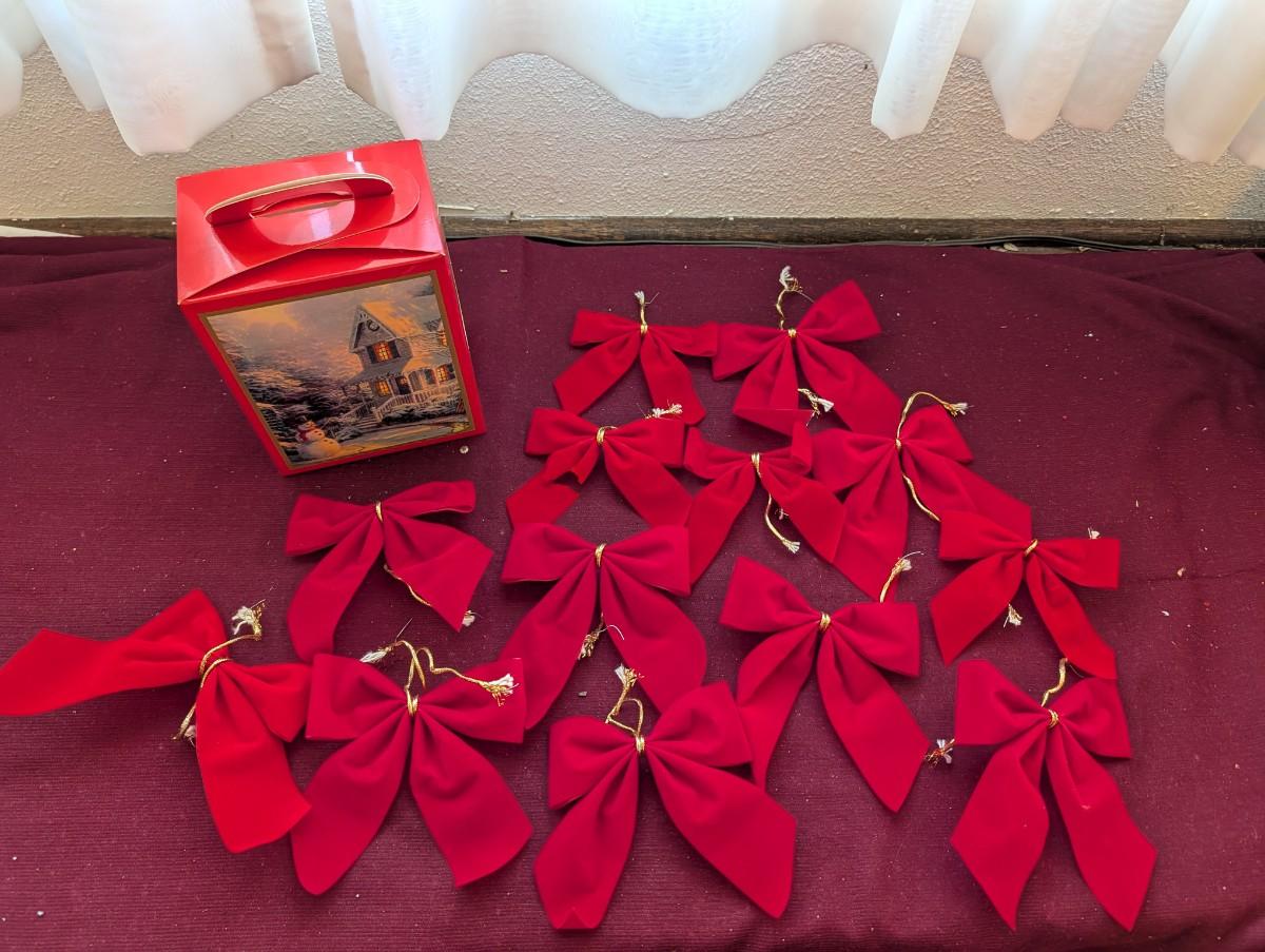 Christmas for packages, vintage red velvet bows vintage Merry Christmas box with snowman Christmas cards some Christmas ribbon.