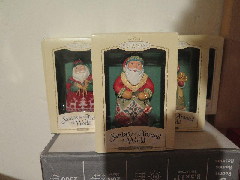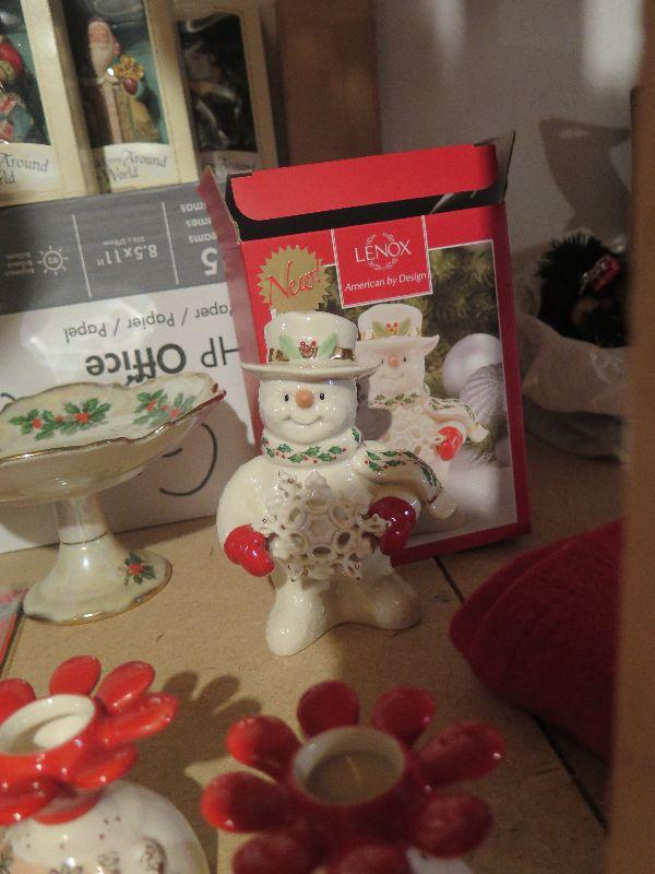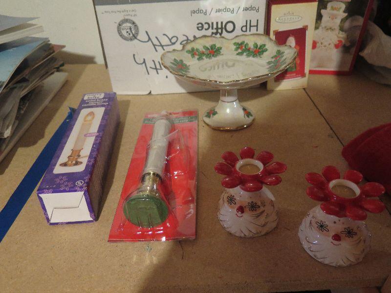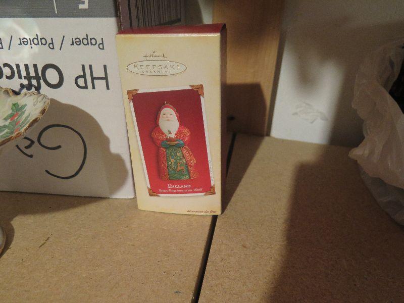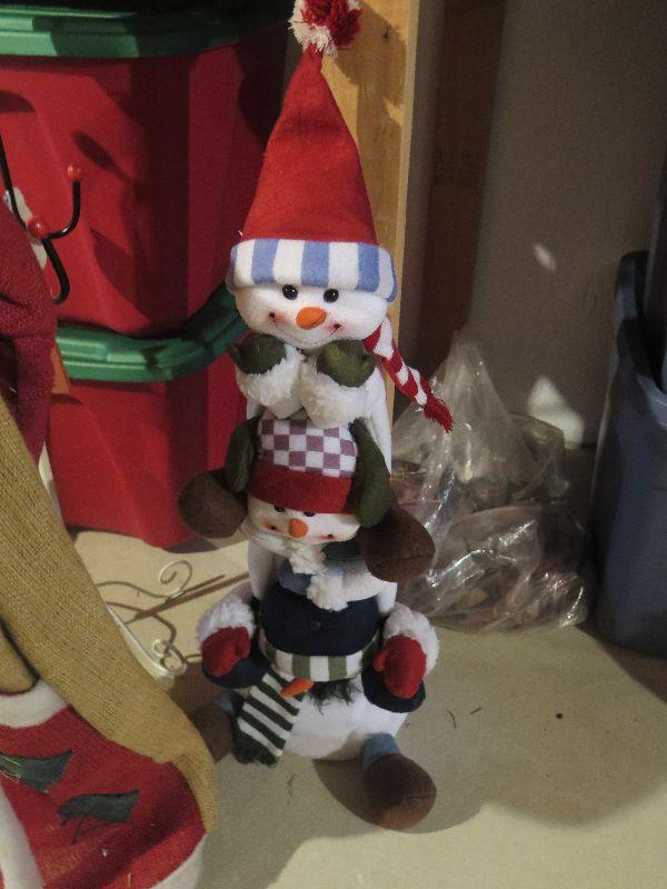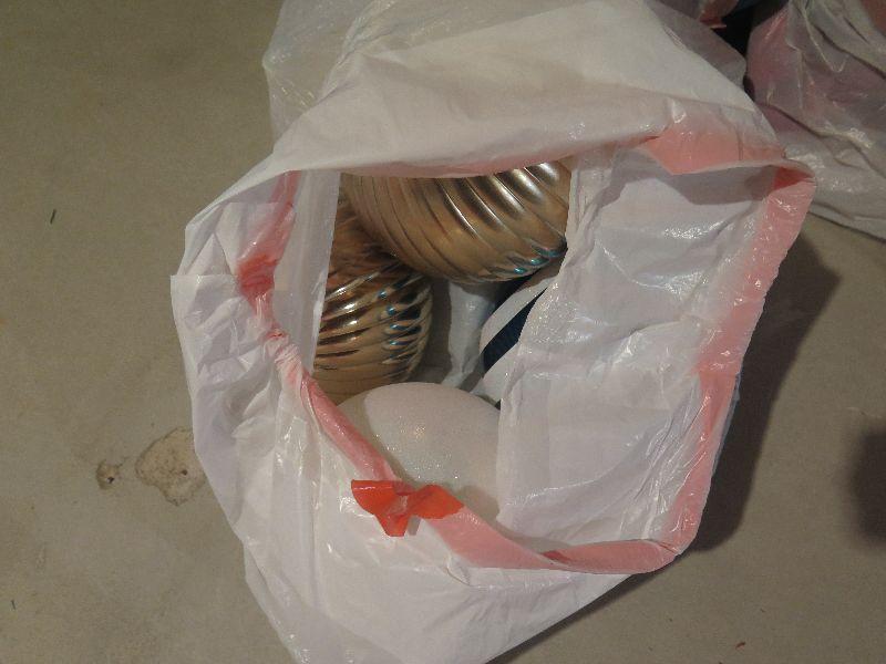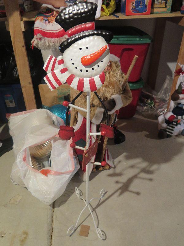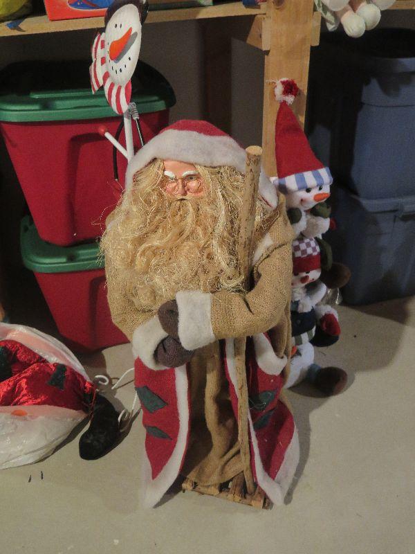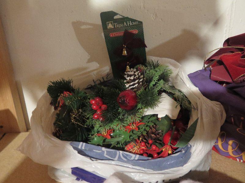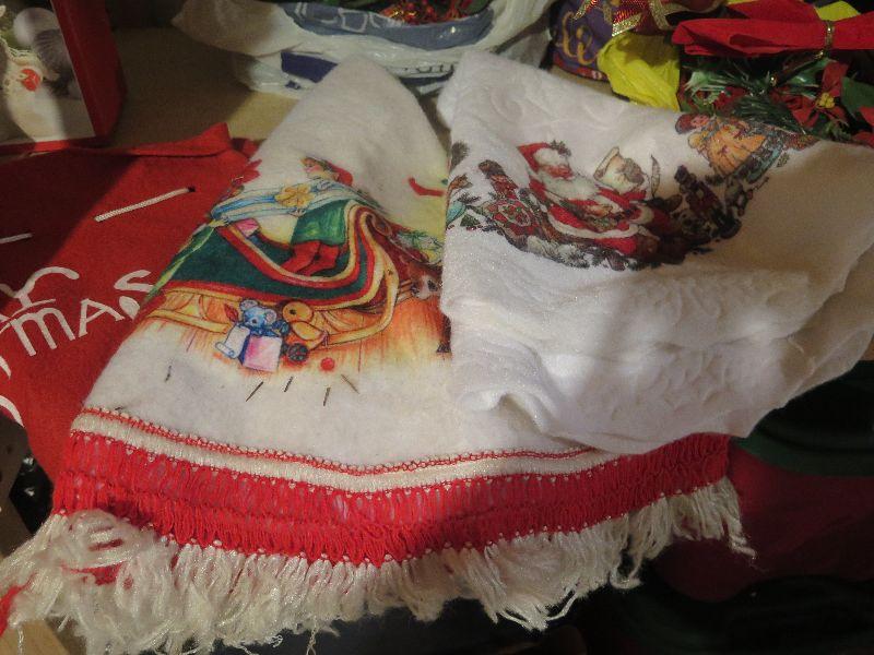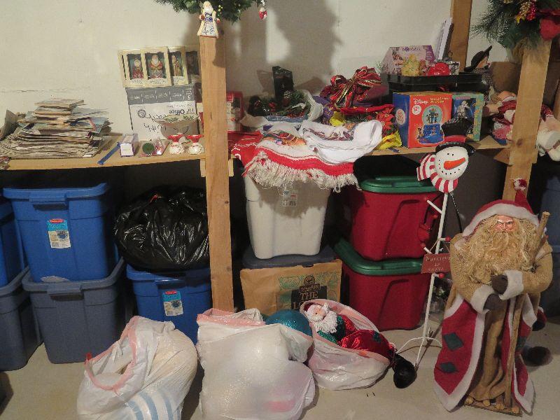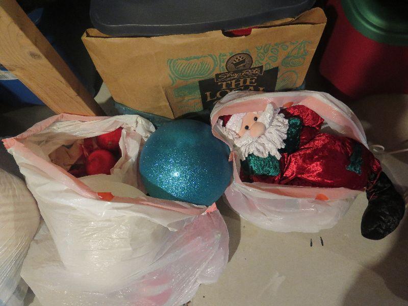 Santa Claus, tree skirts, extra large tree ornaments, bows, and more. Does not include items in totes. Bring box to move from basement.