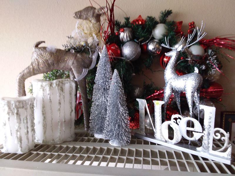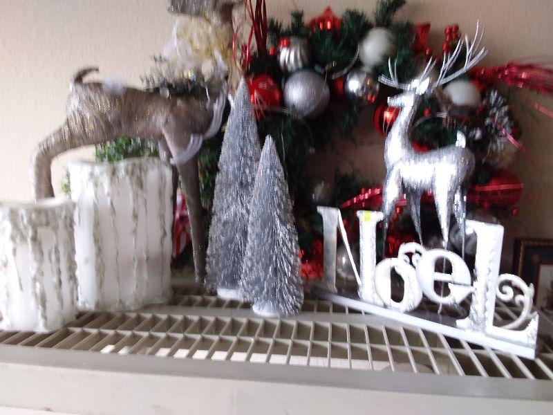 2 large reindeer, 2 candles, 2 trees, noel sign and wreath