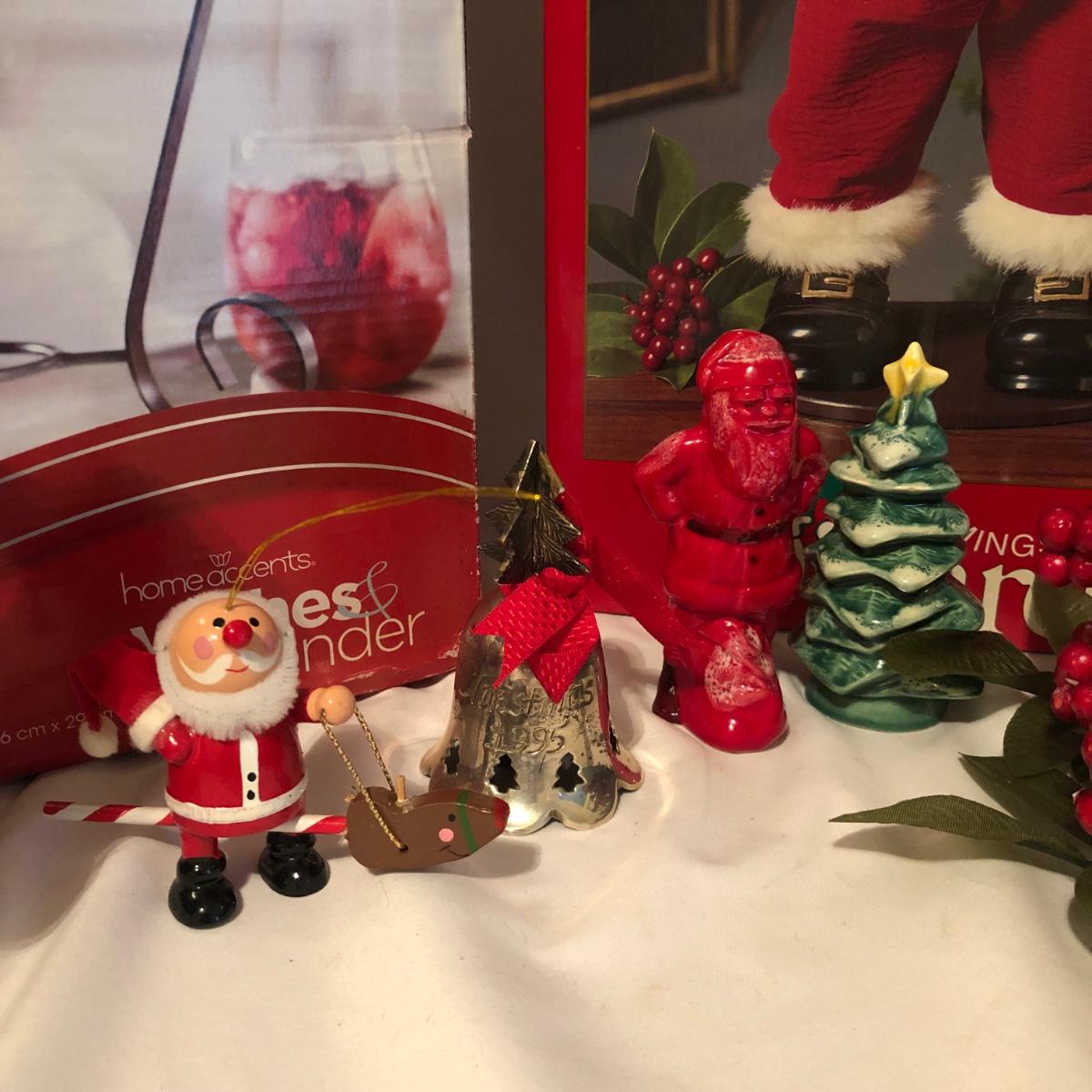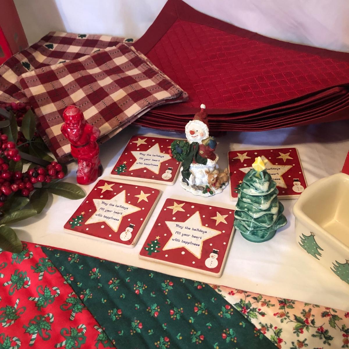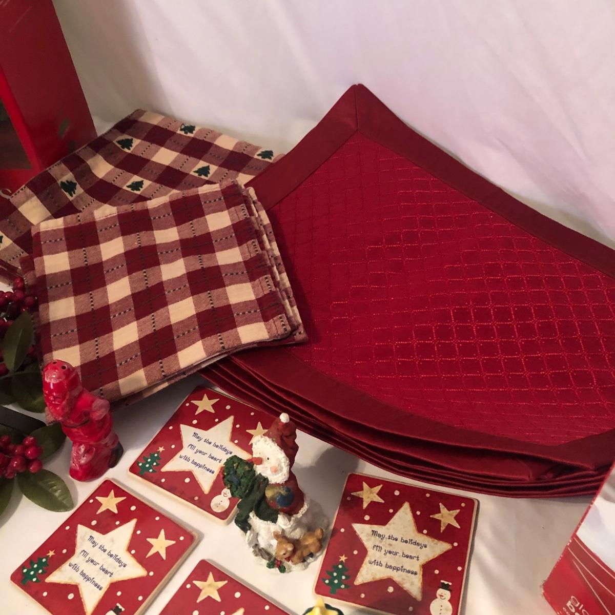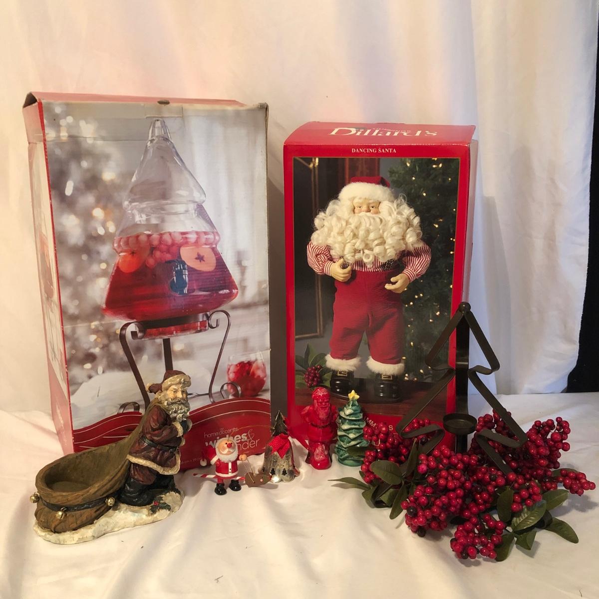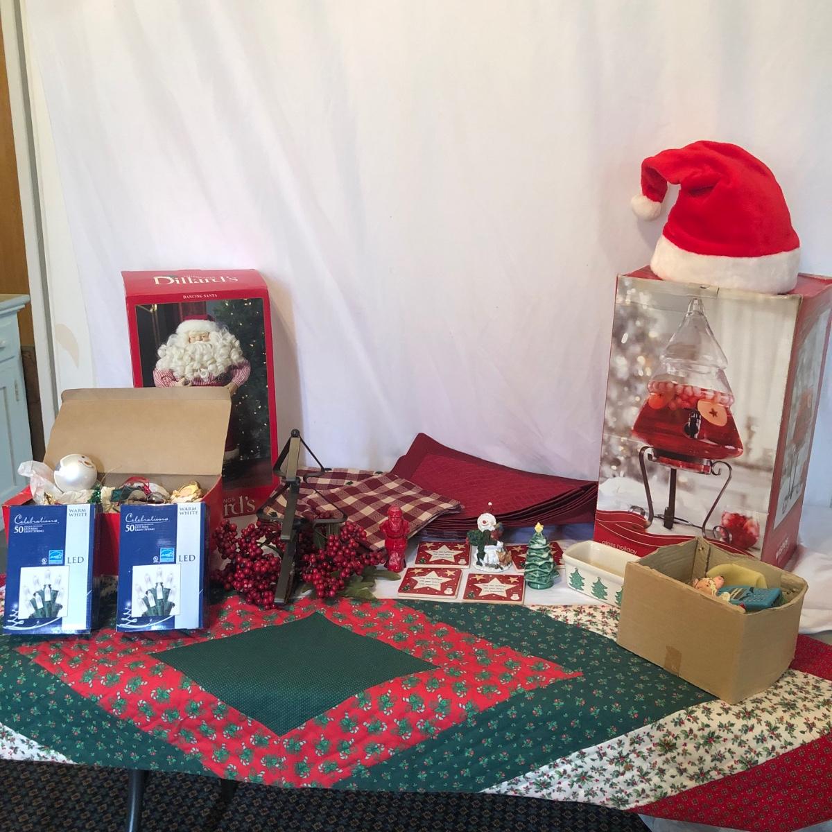 This Christmas collection in the plastic tub has a little bit of everything for decorating the table and home for Christmas. The assortment in the tub includes Santa hats, white crocheted napkin holders, Christmas glasses, a dancing Santa in box, faux evergreen greenery with holly berries, LED white Christmas lights, tablecloths, placemats & napkins, coasters, ornaments, a Christmas tree punch dispenser, Santa and Tree salt and pepper shakers, and much more. The dancing Santa box measures 10” x 17” x 5.56”. Local pickup only.