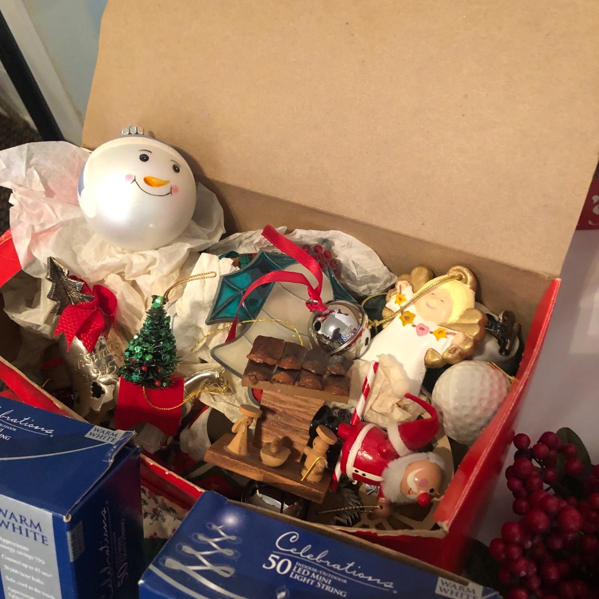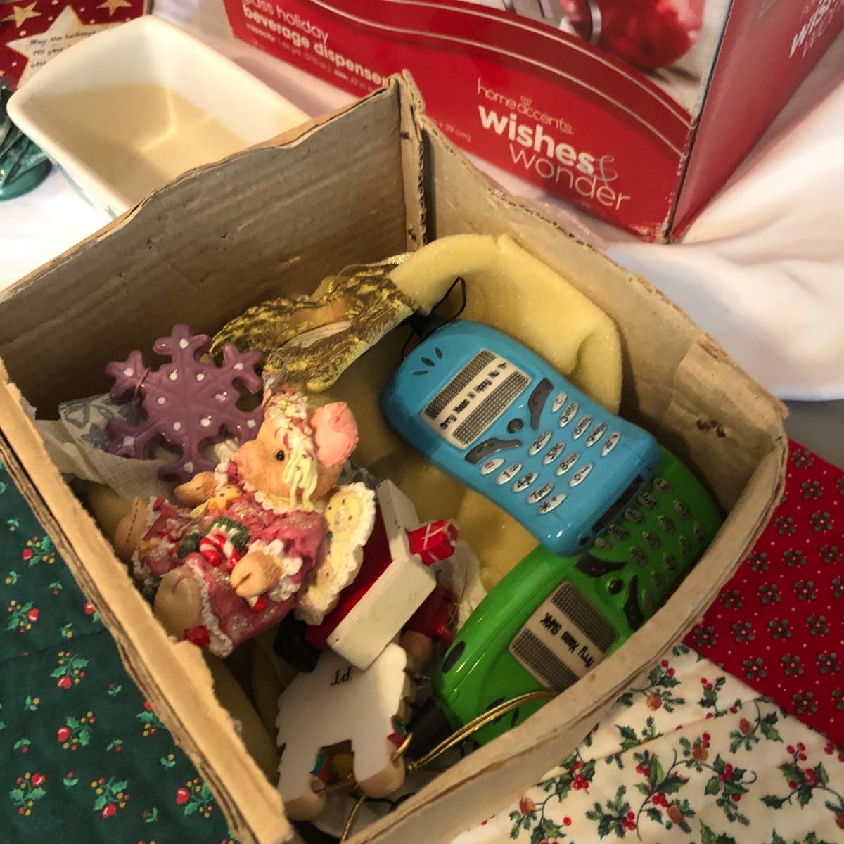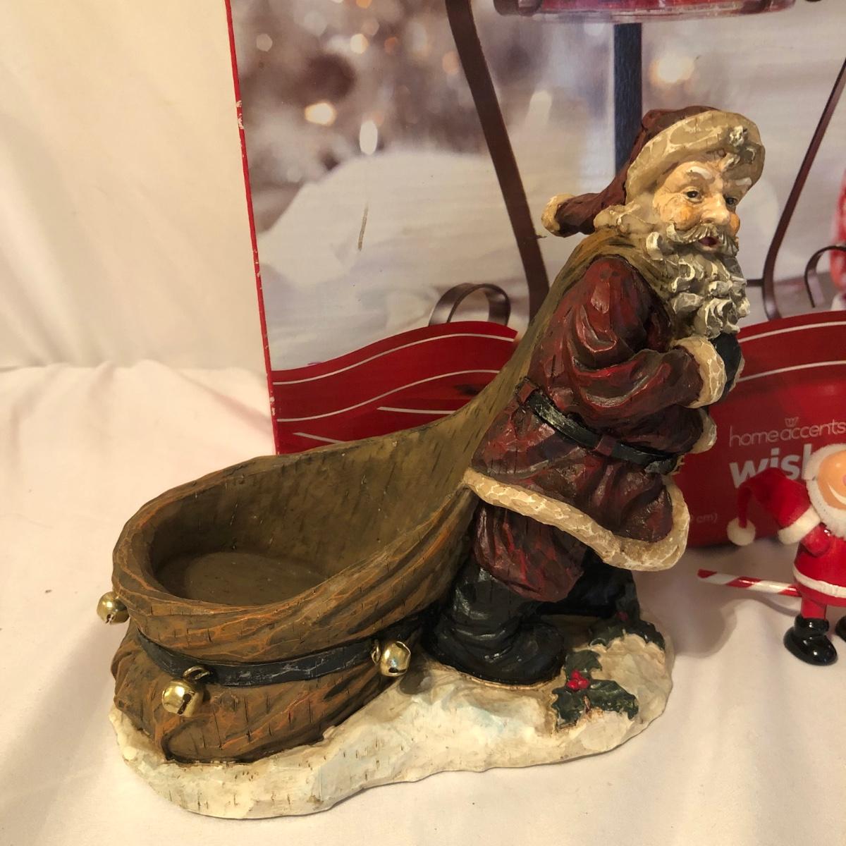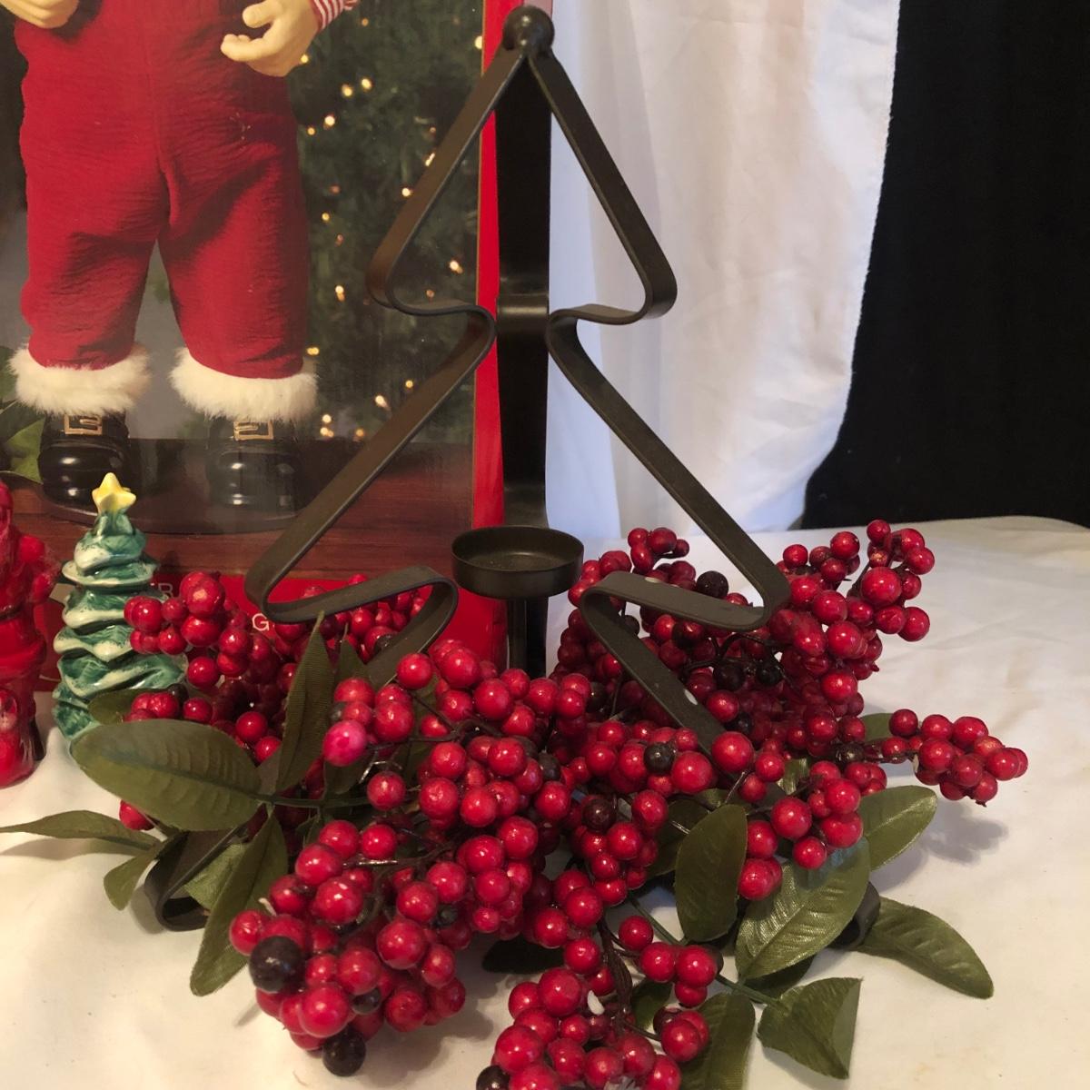 This Christmas collection in the plastic tub has a little bit of everything for decorating the table and home for Christmas. The assortment in the tub includes Santa hats, white crocheted napkin holders, Christmas glasses, a dancing Santa in box, faux evergreen greenery with holly berries, LED white Christmas lights, tablecloths, placemats & napkins, coasters, ornaments, a Christmas tree punch dispenser, Santa and Tree salt and pepper shakers, and much more. The dancing Santa box measures 10” x 17” x 5.56”. Local pickup only.