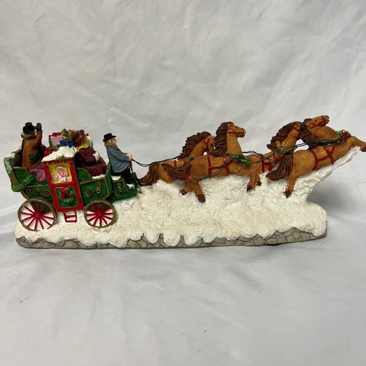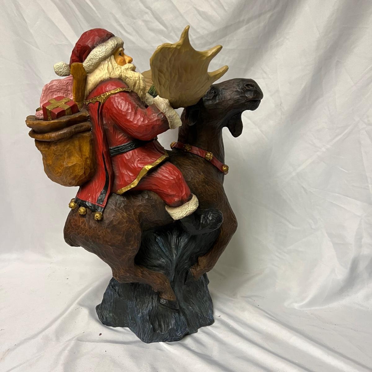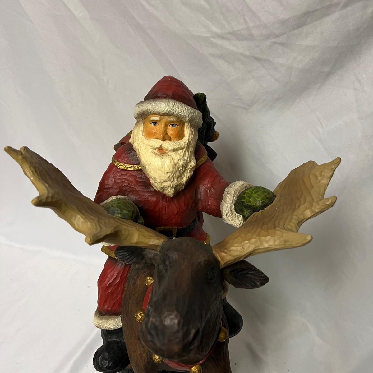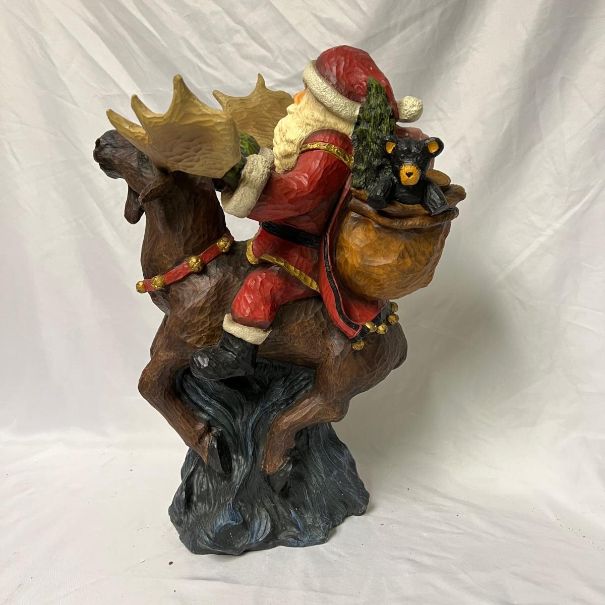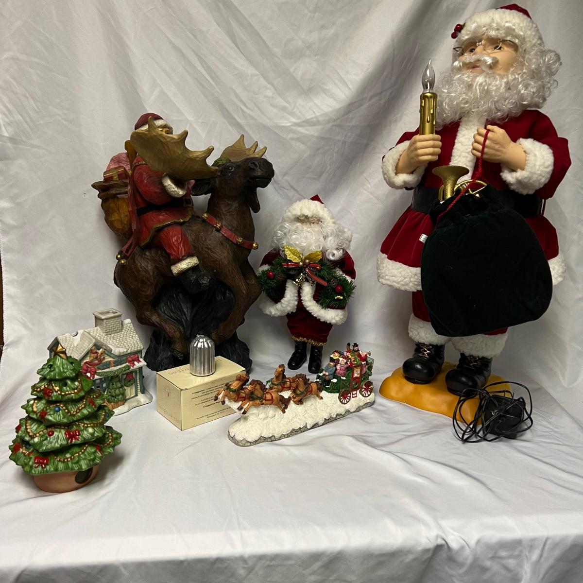 Large electric Santa. Head moves side to side and arms move up and down. His electronics work, the light bulb in hand was burned out. This Santa measures 11” x 7” x 24"H. A wonderful holiday greeter for the front porch. Santa sculpture riding a moose (Rocky Mtn. Reindeer) is detailed and colorful and measures 10.5” x 11.5” x 17"H. Two ceramic (both appear to be porcelain) candle votives. One a three-tier tree measuring 5.5” x 5.5” x 7"H. The house measures 5.5” x 4” x 6"H. The charming ceramic sleigh sculpture lights up and says it is a music box. This could not be tested as the batteries were not operational. Seems just perfect for the mantel and measures 11” x 3” x 4"H.