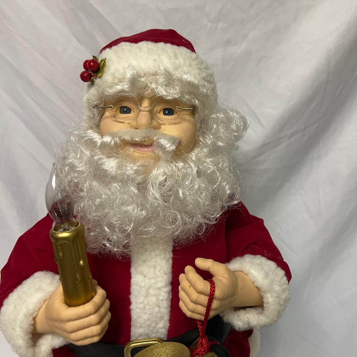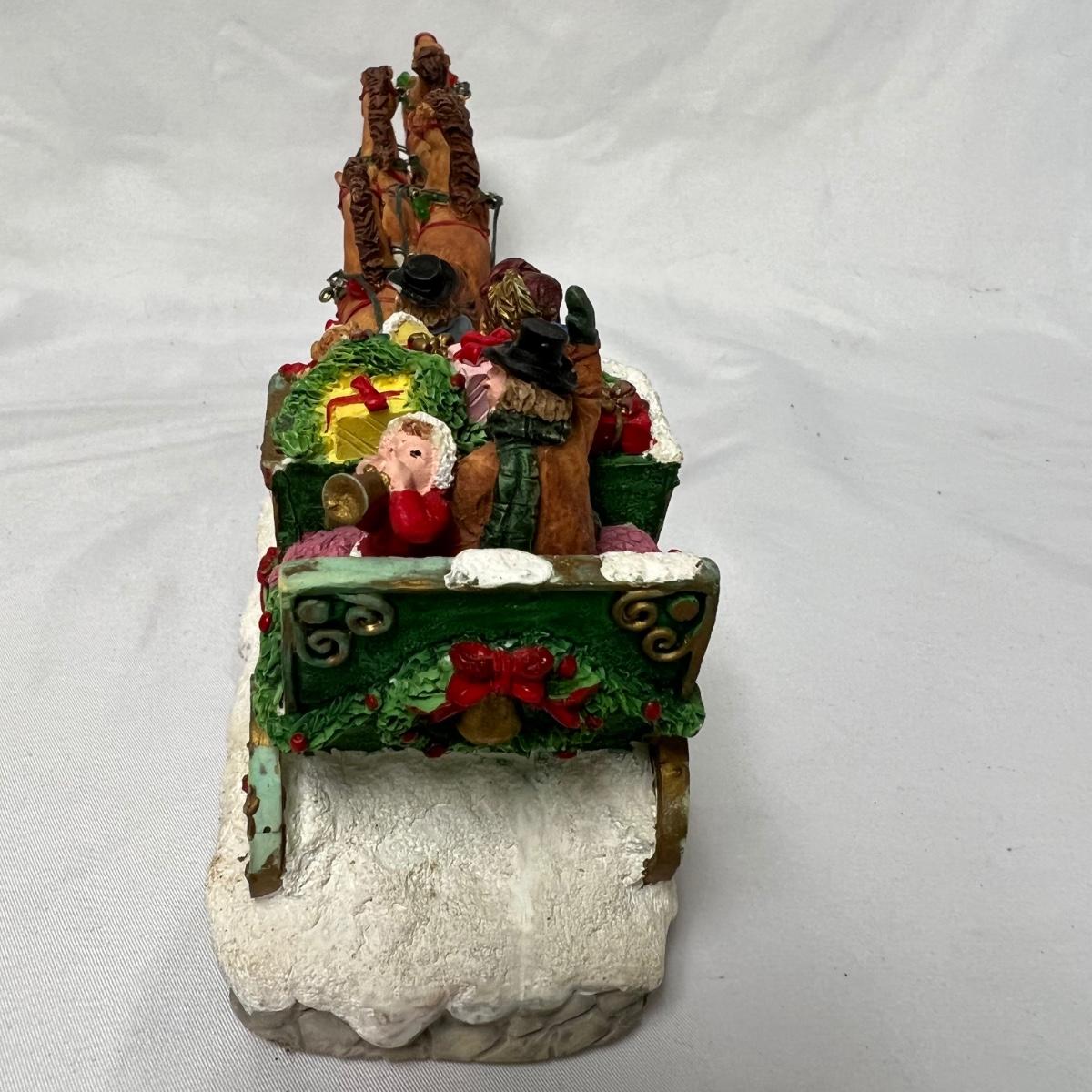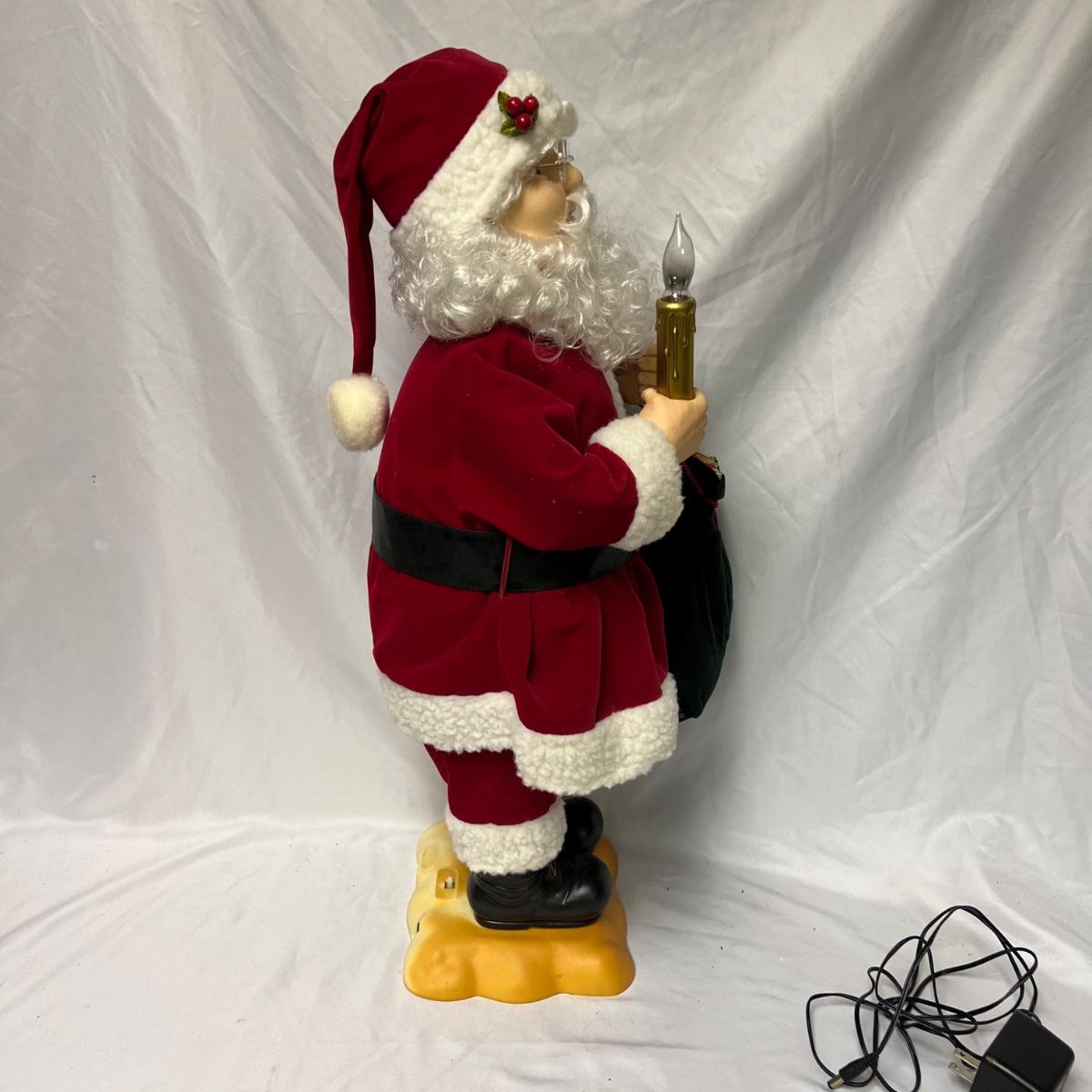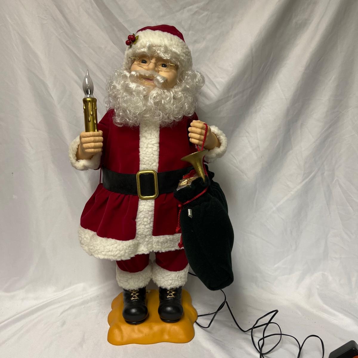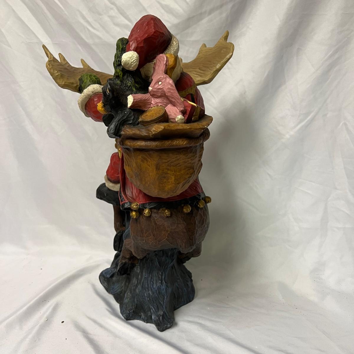 Large electric Santa. Head moves side to side and arms move up and down. His electronics work, the light bulb in hand was burned out. This Santa measures 11” x 7” x 24"H. A wonderful holiday greeter for the front porch. Santa sculpture riding a moose (Rocky Mtn. Reindeer) is detailed and colorful and measures 10.5” x 11.5” x 17"H. Two ceramic (both appear to be porcelain) candle votives. One a three-tier tree measuring 5.5” x 5.5” x 7"H. The house measures 5.5” x 4” x 6"H. The charming ceramic sleigh sculpture lights up and says it is a music box. This could not be tested as the batteries were not operational. Seems just perfect for the mantel and measures 11” x 3” x 4"H.