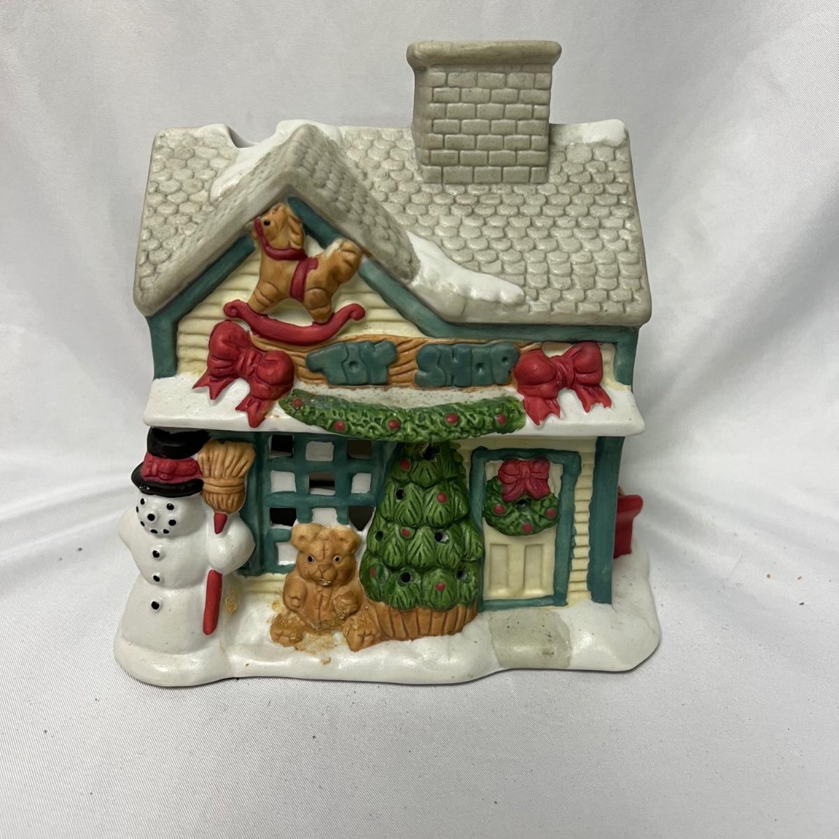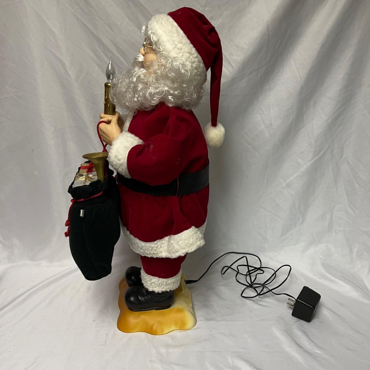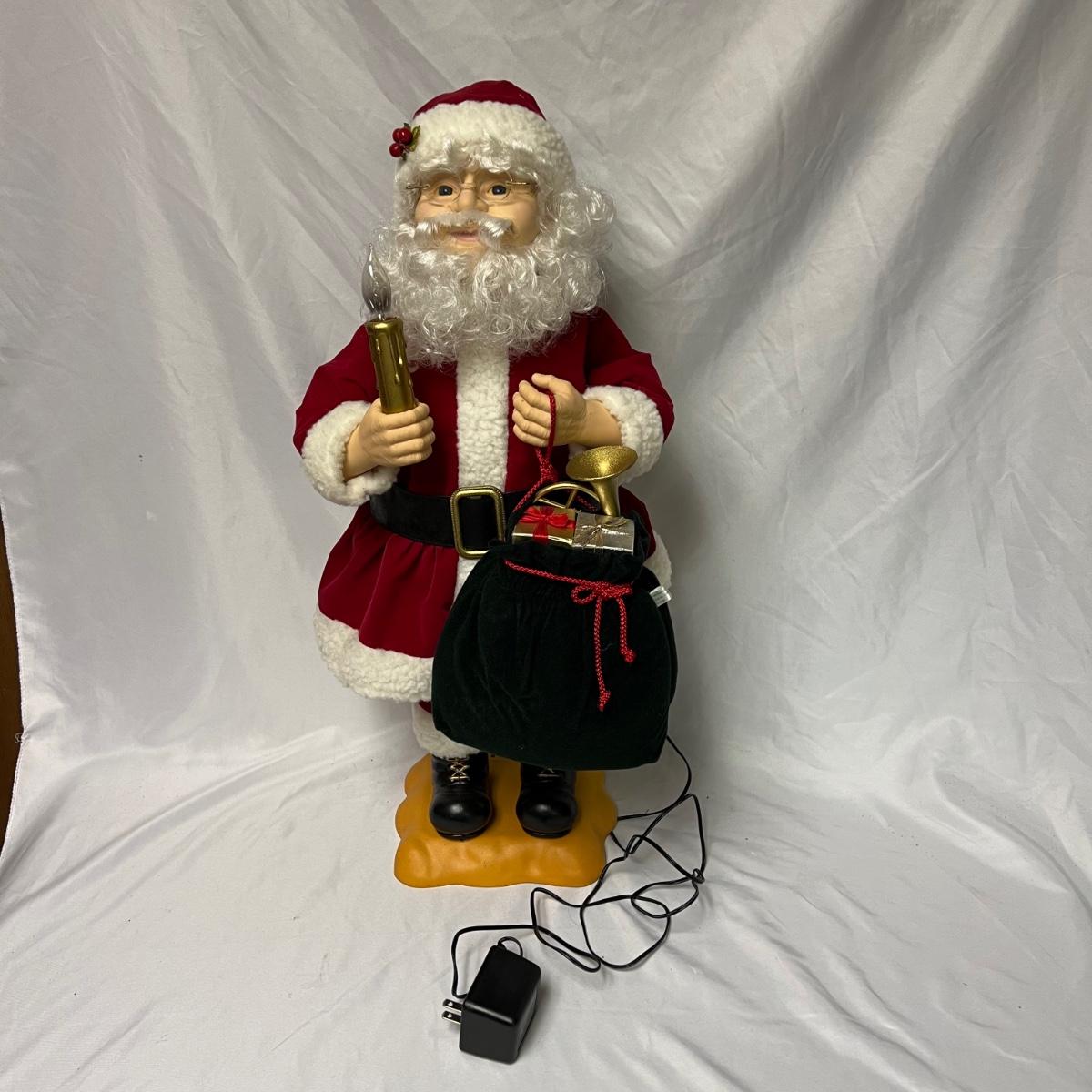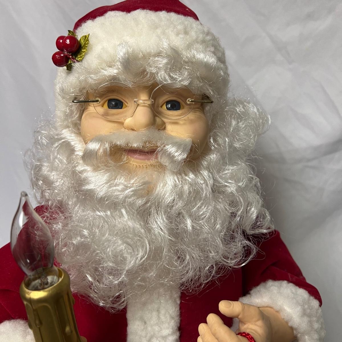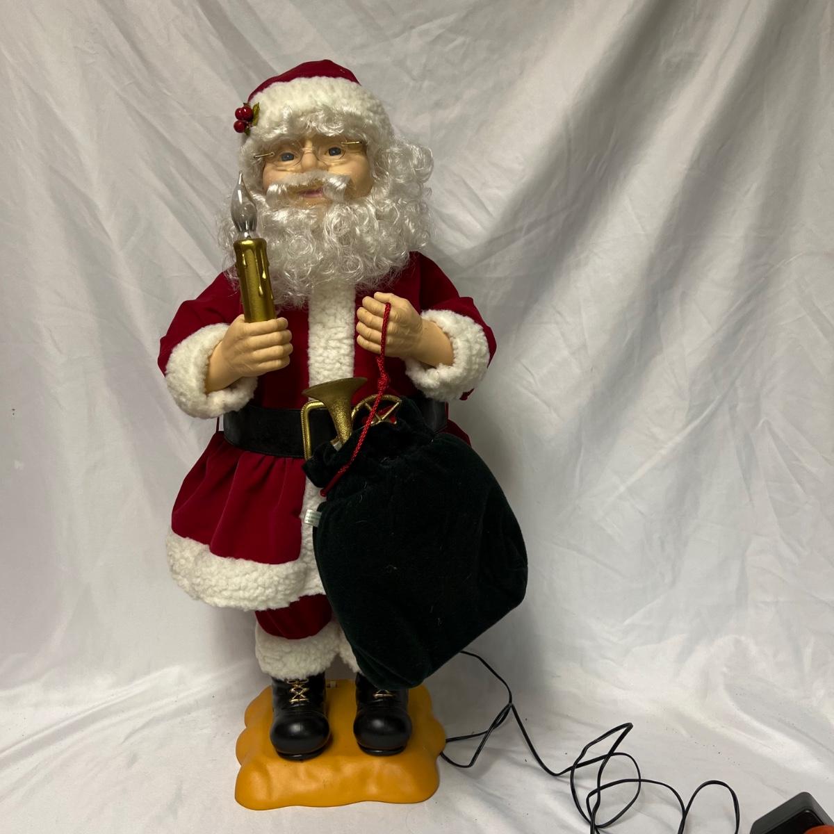 Large electric Santa. Head moves side to side and arms move up and down. His electronics work, the light bulb in hand was burned out. This Santa measures 11” x 7” x 24"H. A wonderful holiday greeter for the front porch. Santa sculpture riding a moose (Rocky Mtn. Reindeer) is detailed and colorful and measures 10.5” x 11.5” x 17"H. Two ceramic (both appear to be porcelain) candle votives. One a three-tier tree measuring 5.5” x 5.5” x 7"H. The house measures 5.5” x 4” x 6"H. The charming ceramic sleigh sculpture lights up and says it is a music box. This could not be tested as the batteries were not operational. Seems just perfect for the mantel and measures 11” x 3” x 4"H.