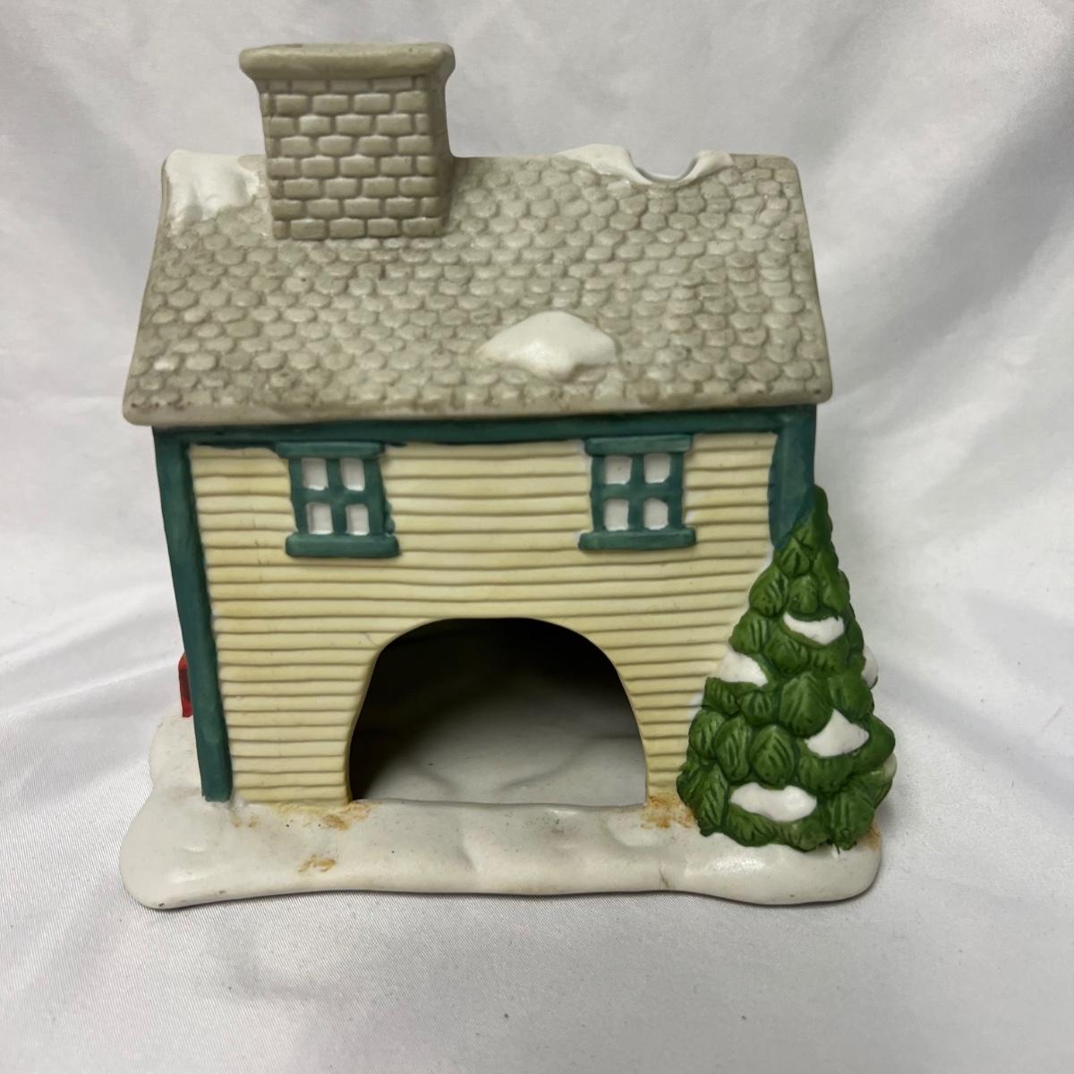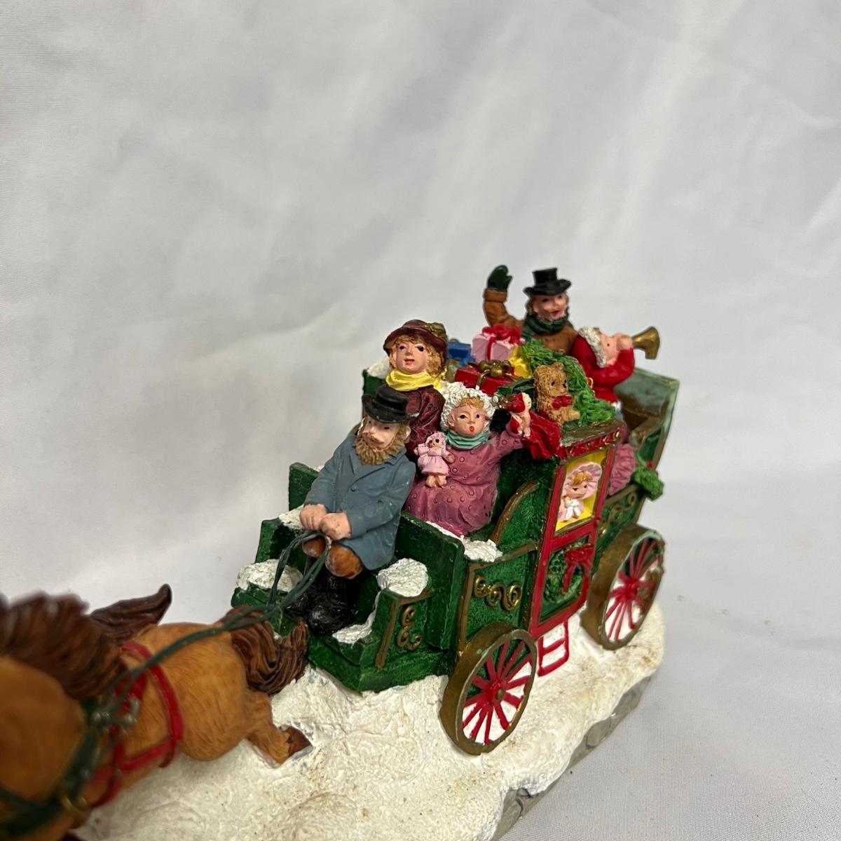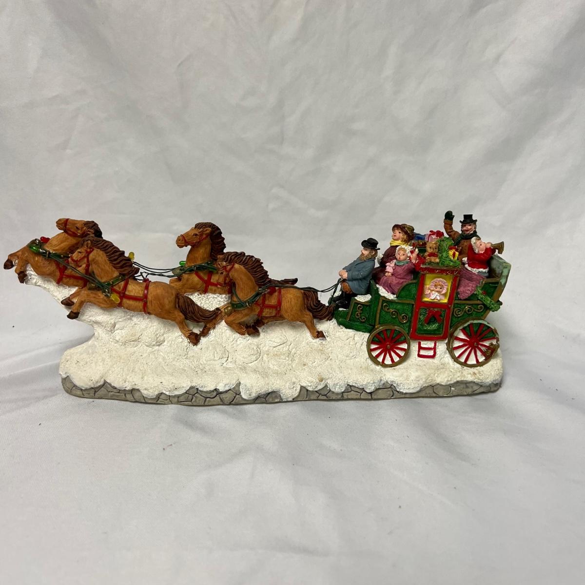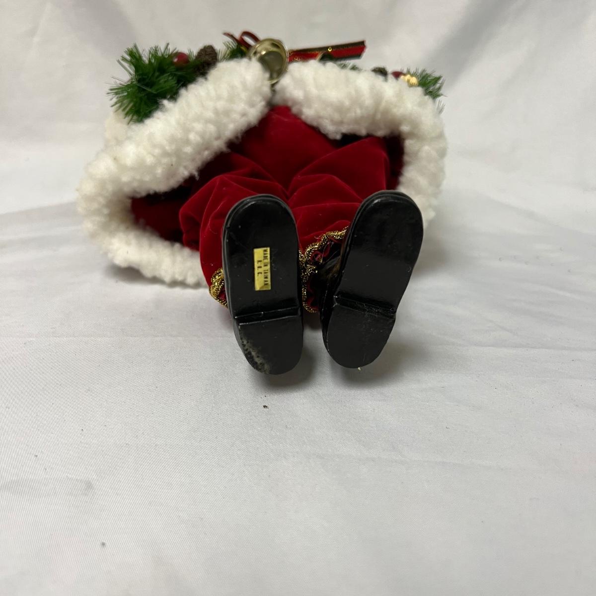 Large electric Santa. Head moves side to side and arms move up and down. His electronics work, the light bulb in hand was burned out. This Santa measures 11” x 7” x 24"H. A wonderful holiday greeter for the front porch. Santa sculpture riding a moose (Rocky Mtn. Reindeer) is detailed and colorful and measures 10.5” x 11.5” x 17"H. Two ceramic (both appear to be porcelain) candle votives. One a three-tier tree measuring 5.5” x 5.5” x 7"H. The house measures 5.5” x 4” x 6"H. The charming ceramic sleigh sculpture lights up and says it is a music box. This could not be tested as the batteries were not operational. Seems just perfect for the mantel and measures 11” x 3” x 4"H.