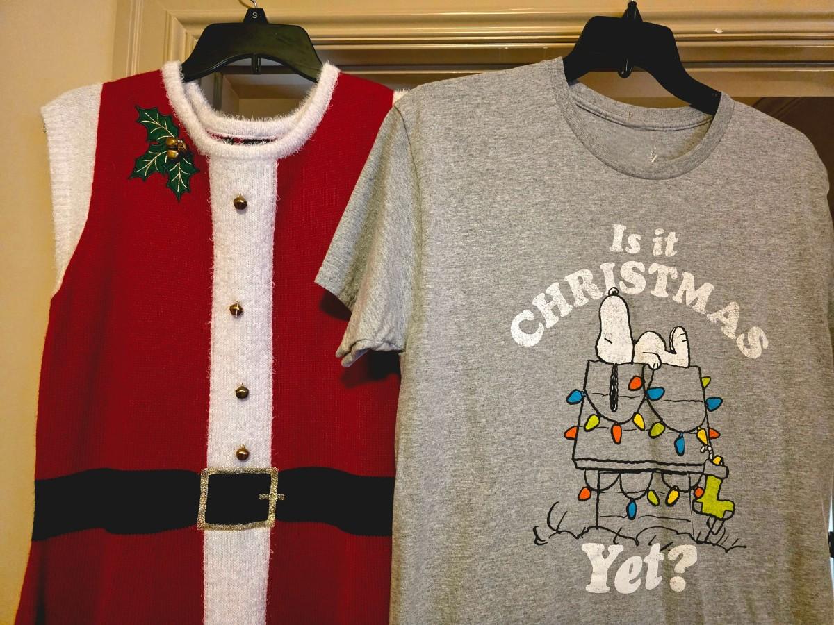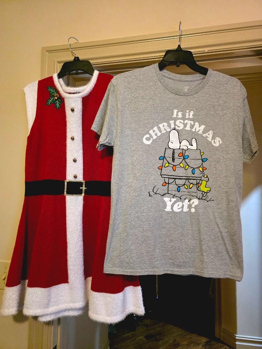 Christmas Apparel includes 1 sweater dress size M and 1 Peanuts t-shirt size L