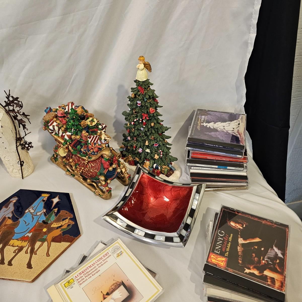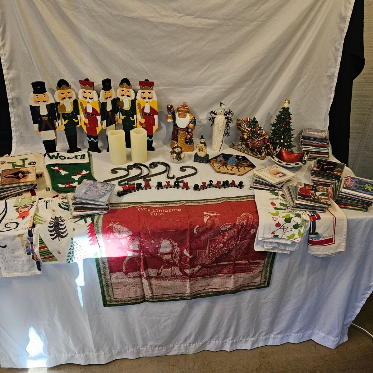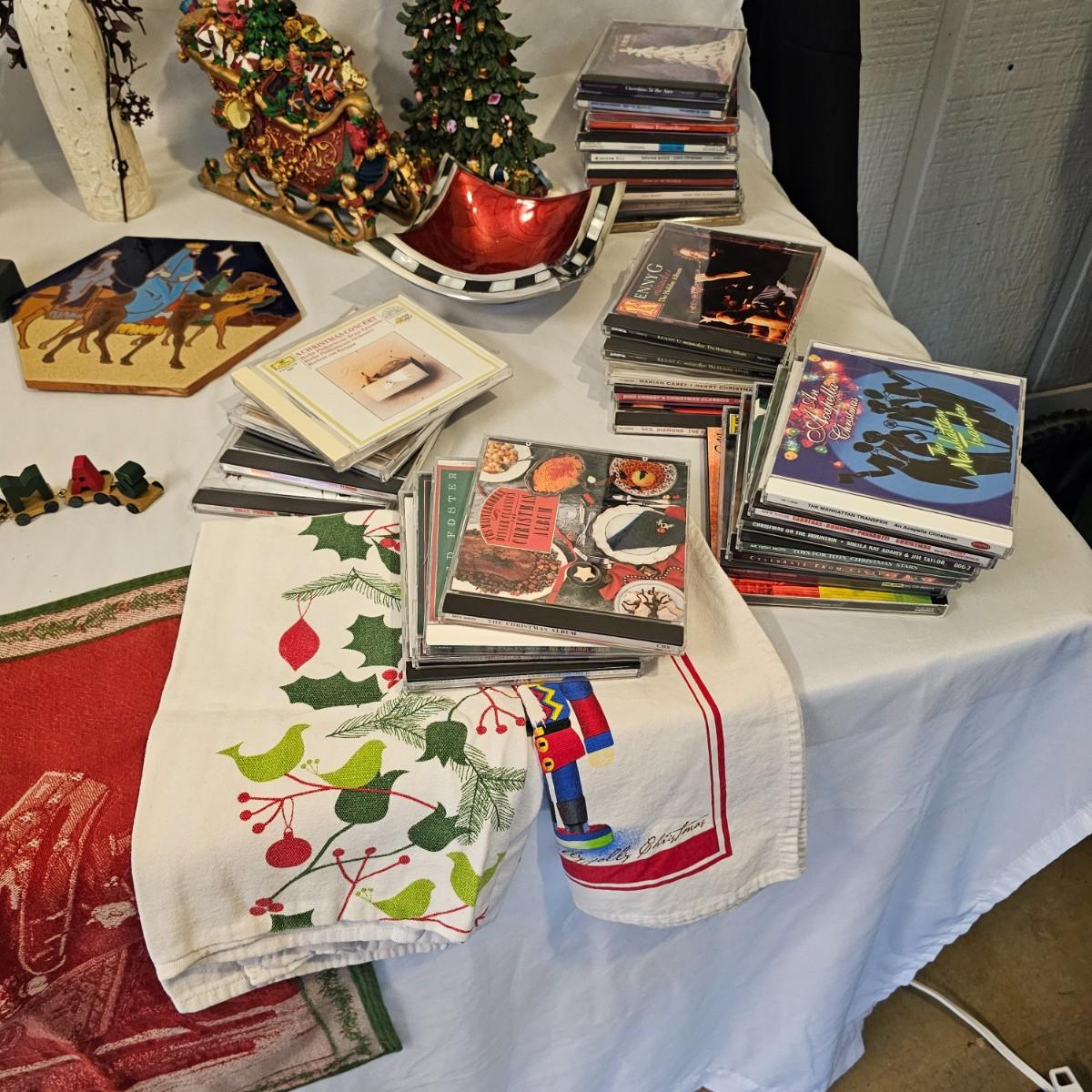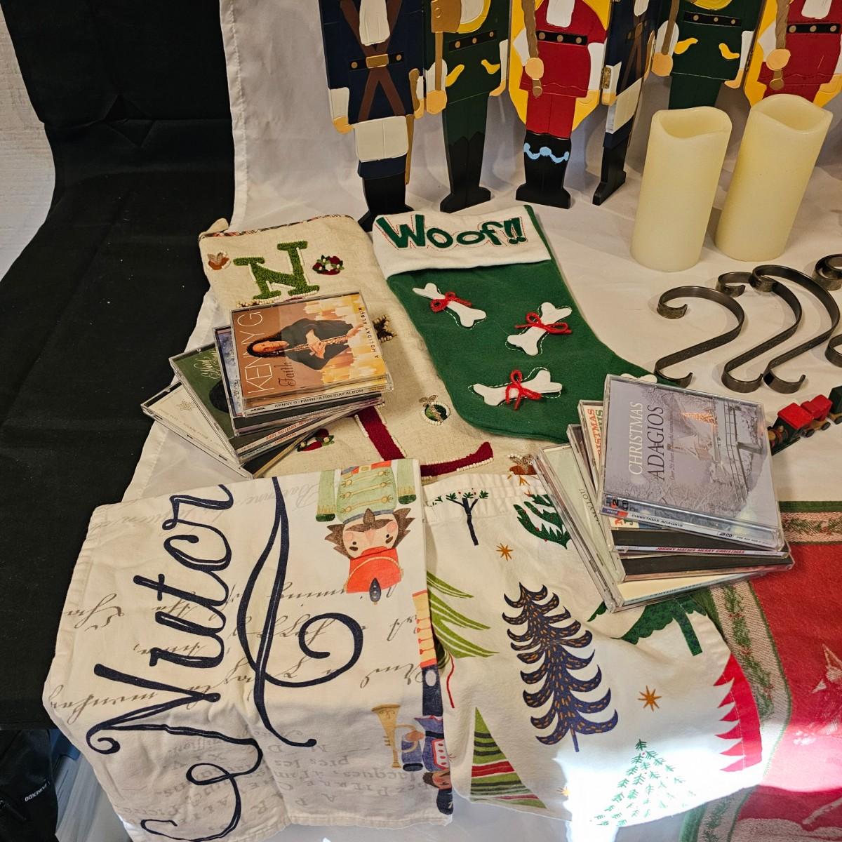 Festive table decorations, towels, stockings, more. Folding nutcracker screen is 24" x 14"H. DeLorme towel is 21" x 27". Also includes six metal stocking hangers and two flameless battery operated candles that turned on when tested. A wide selection of Christmas CDs by favorite artists: Kenny G, Mannheim Steamroller, Andy Williams, more. Over 35 titles included. See photos for details. Local pickup only.