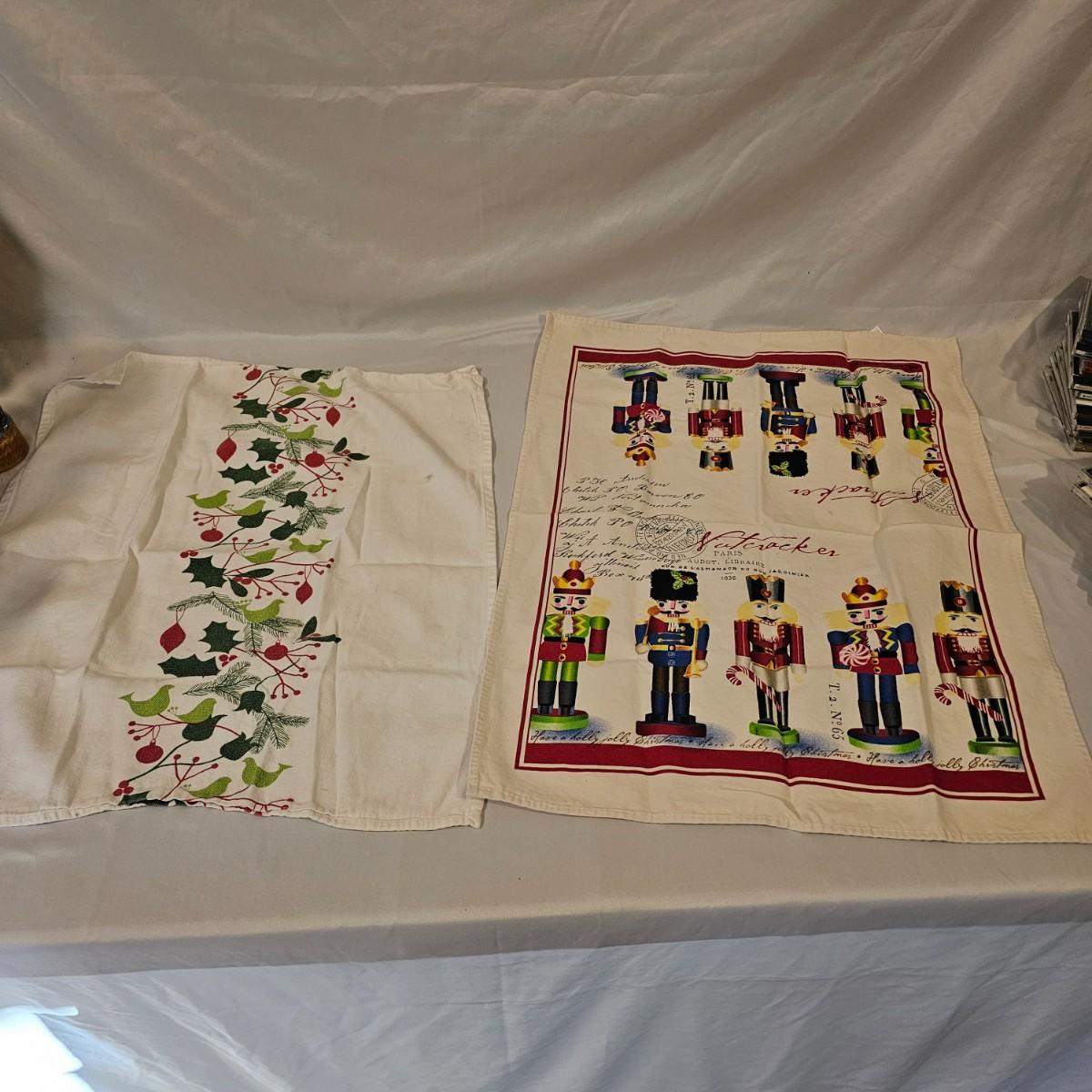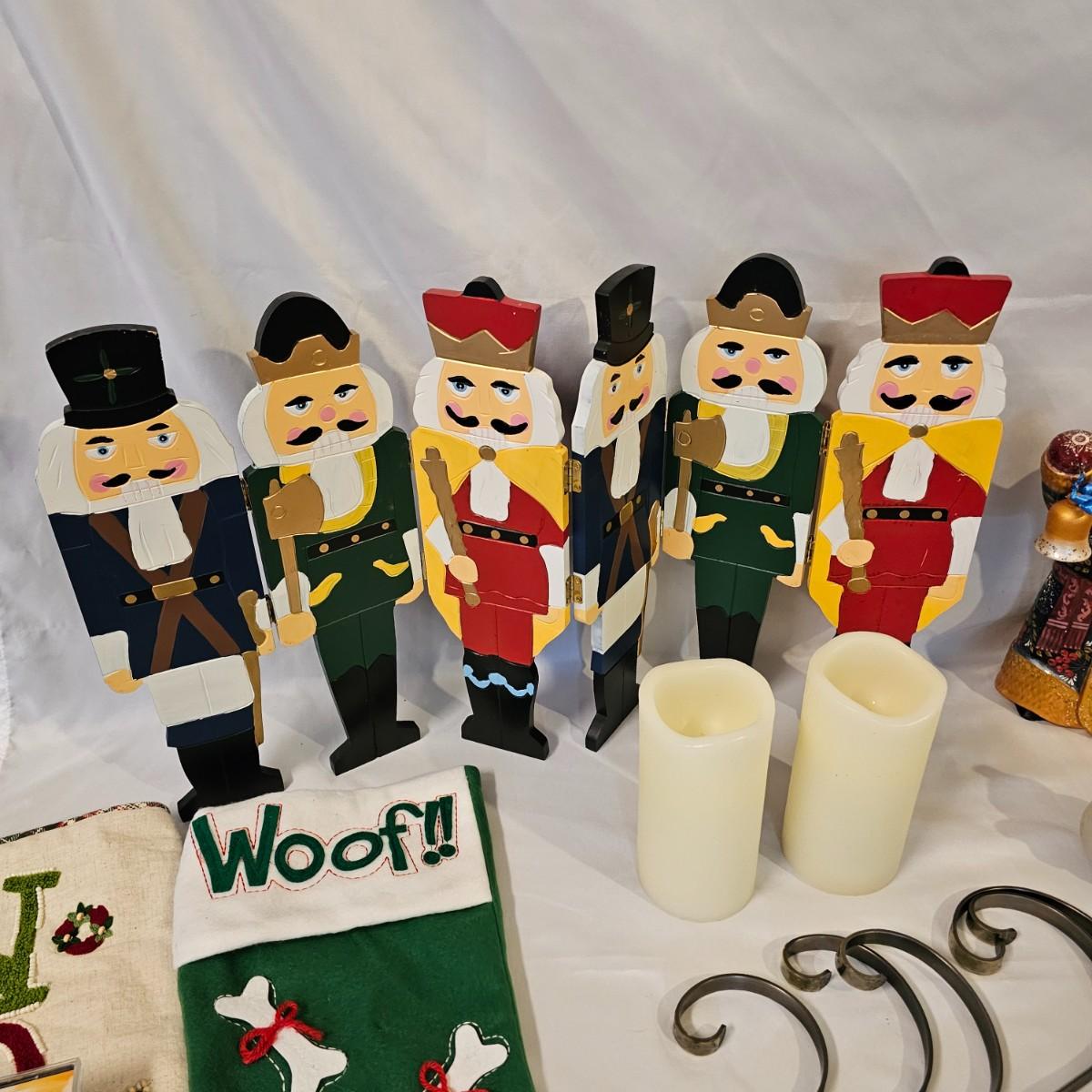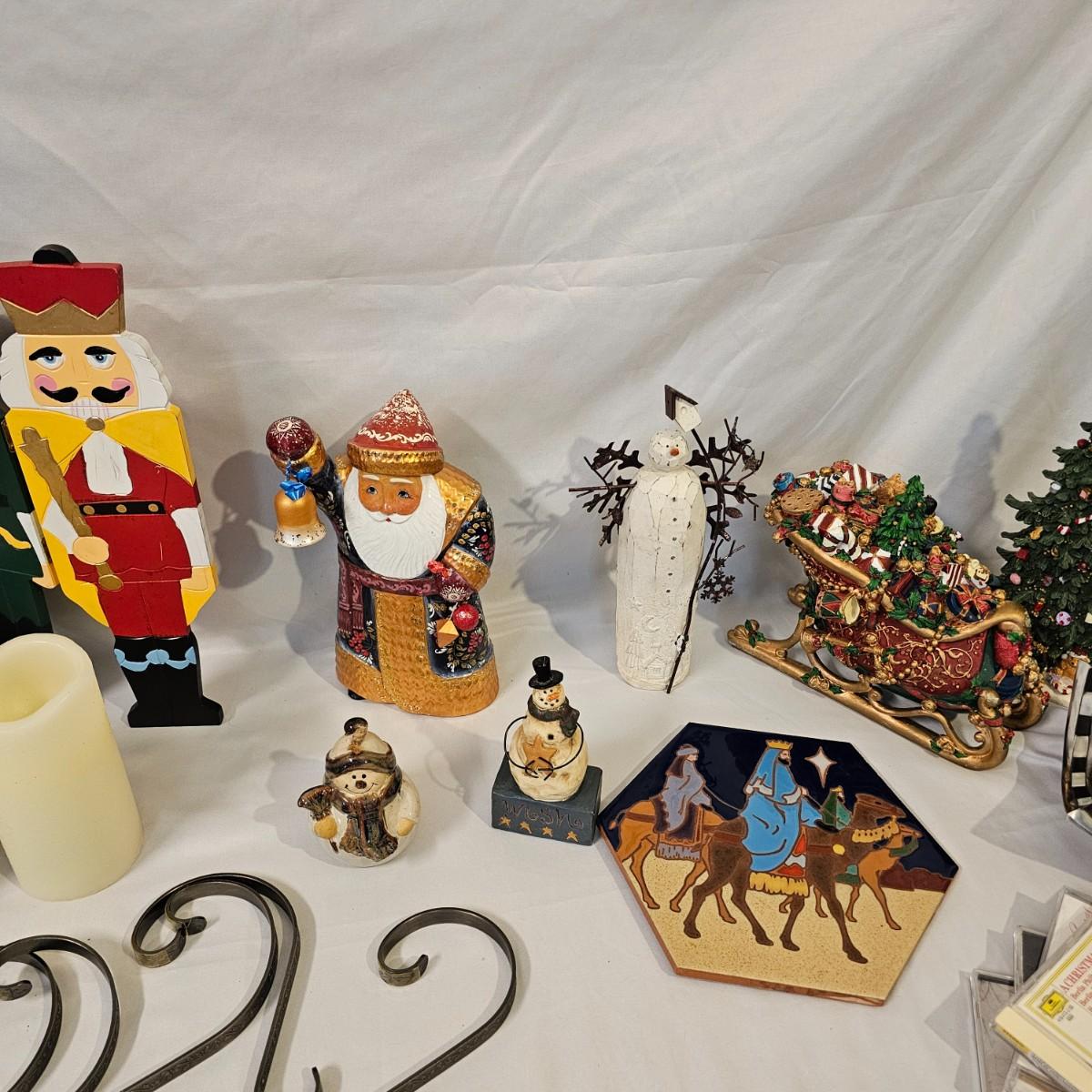 Festive table decorations, towels, stockings, more. Folding nutcracker screen is 24" x 14"H. DeLorme towel is 21" x 27". Also includes six metal stocking hangers and two flameless battery operated candles that turned on when tested. A wide selection of Christmas CDs by favorite artists: Kenny G, Mannheim Steamroller, Andy Williams, more. Over 35 titles included. See photos for details. Local pickup only.