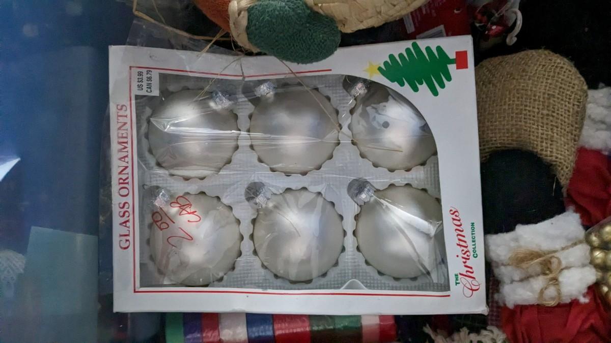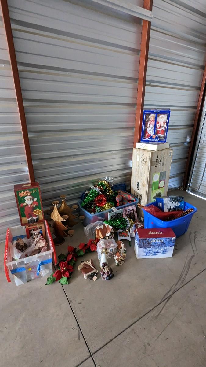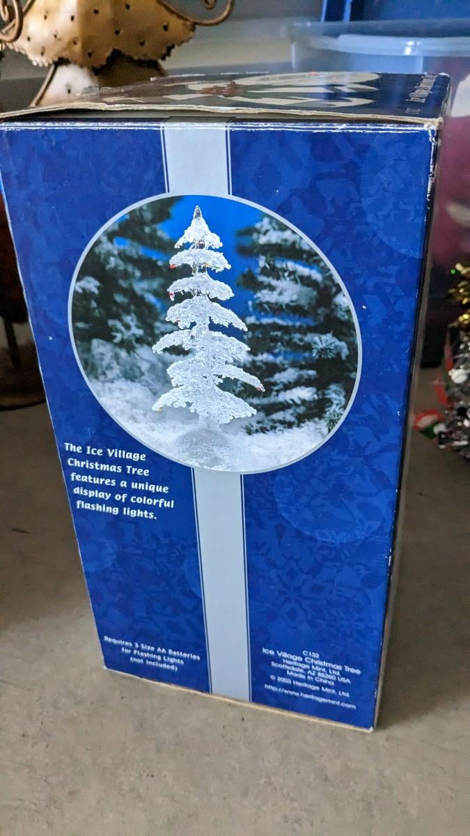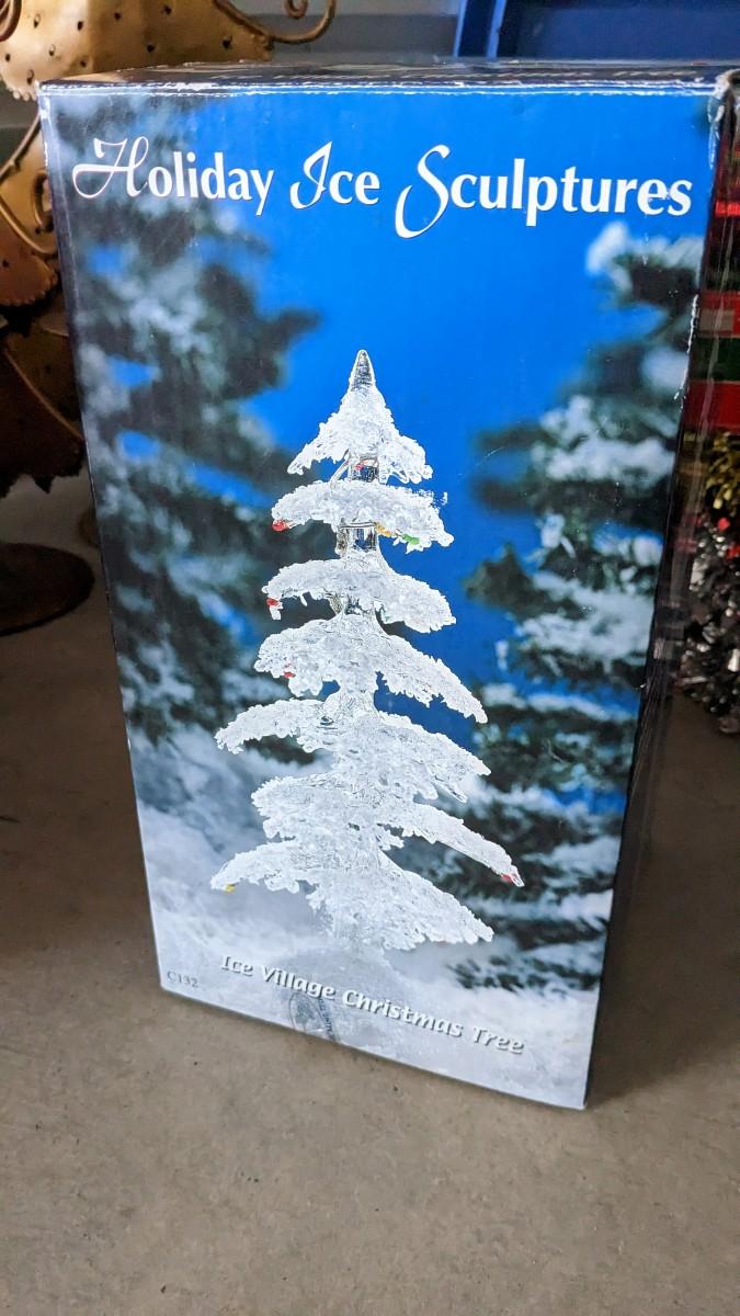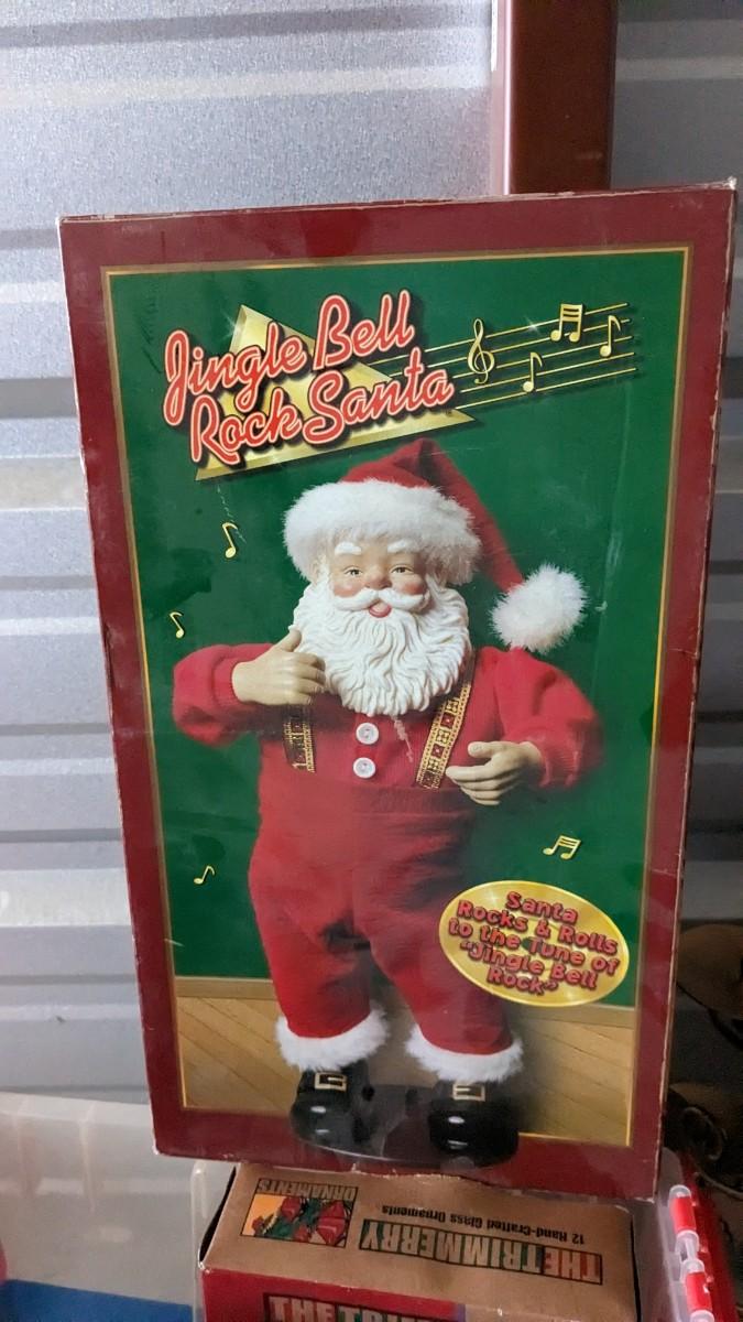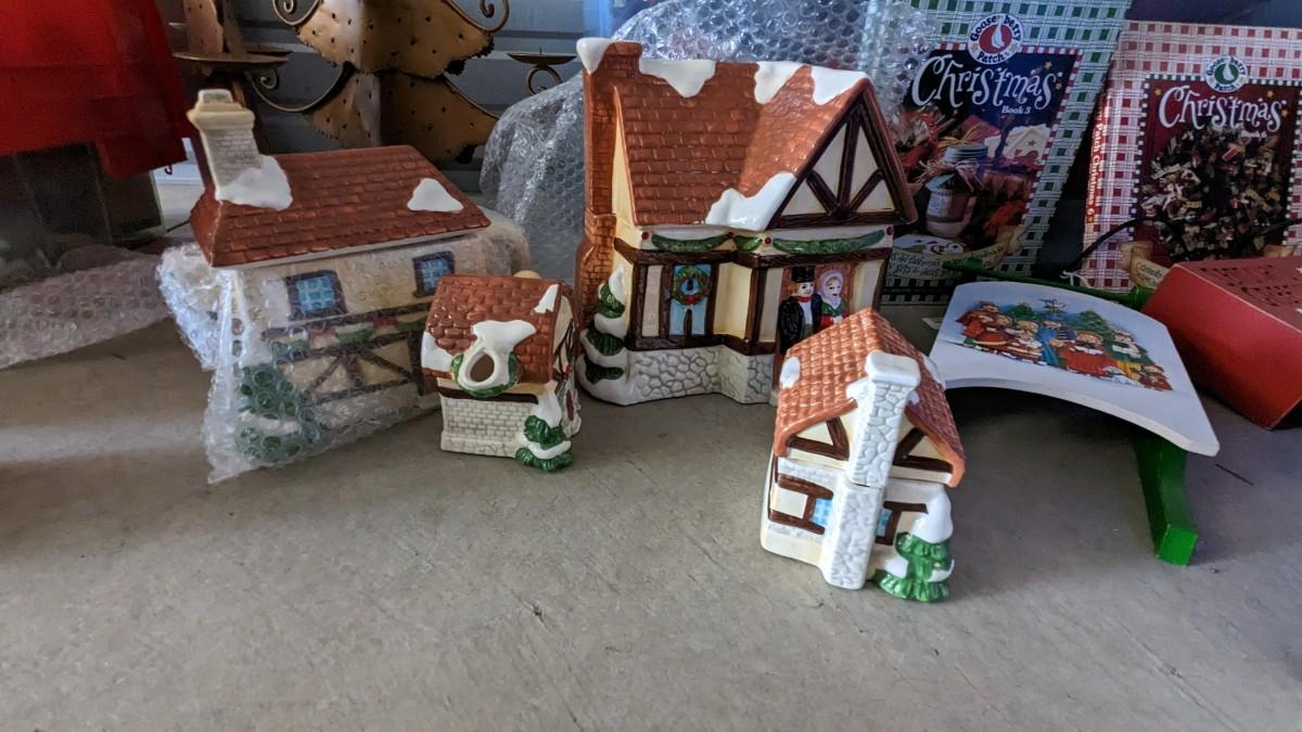 A great assortment of very decade christmas items. Includes June McKenna numbered santa, faux florals, mated christmas tree candle holders,tinsel trees, snowy village kitchen accessories, snowflake dessert bowls, crafting items, 4 ft christmas tree in box never opened, Jingle Bell Rock Santa, heritage mint ice village christmas tree, and more! No shipping 2616
