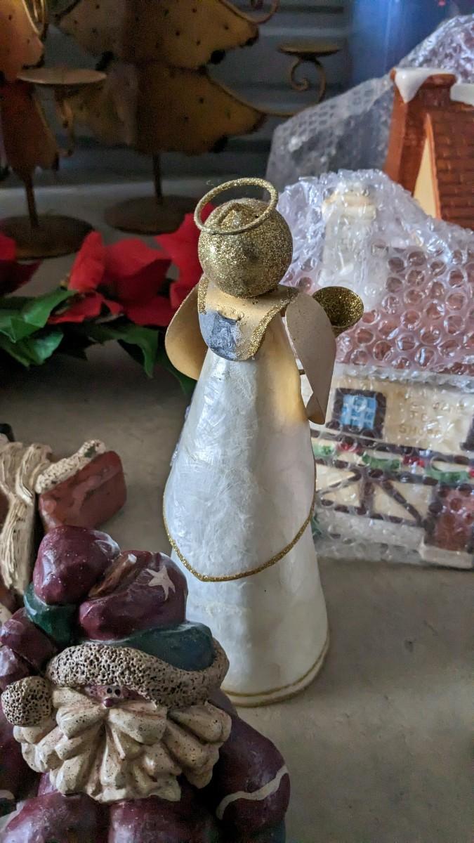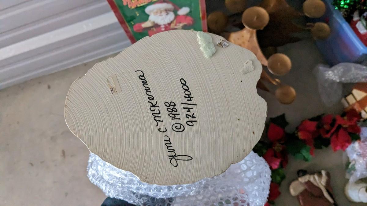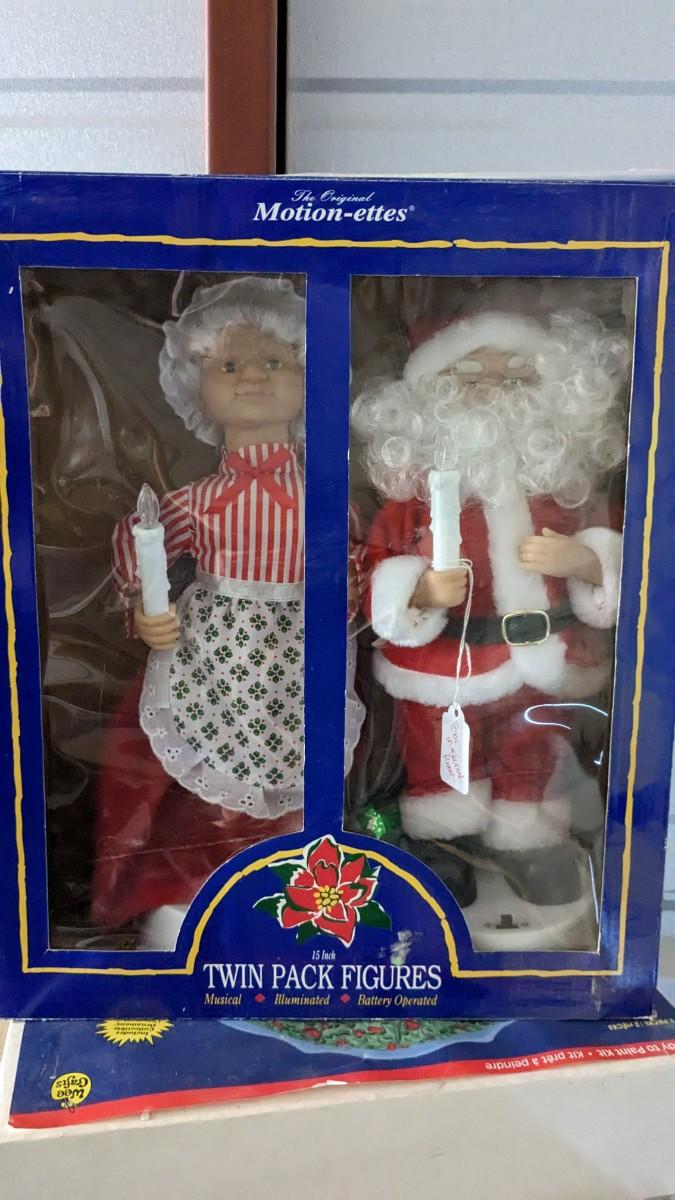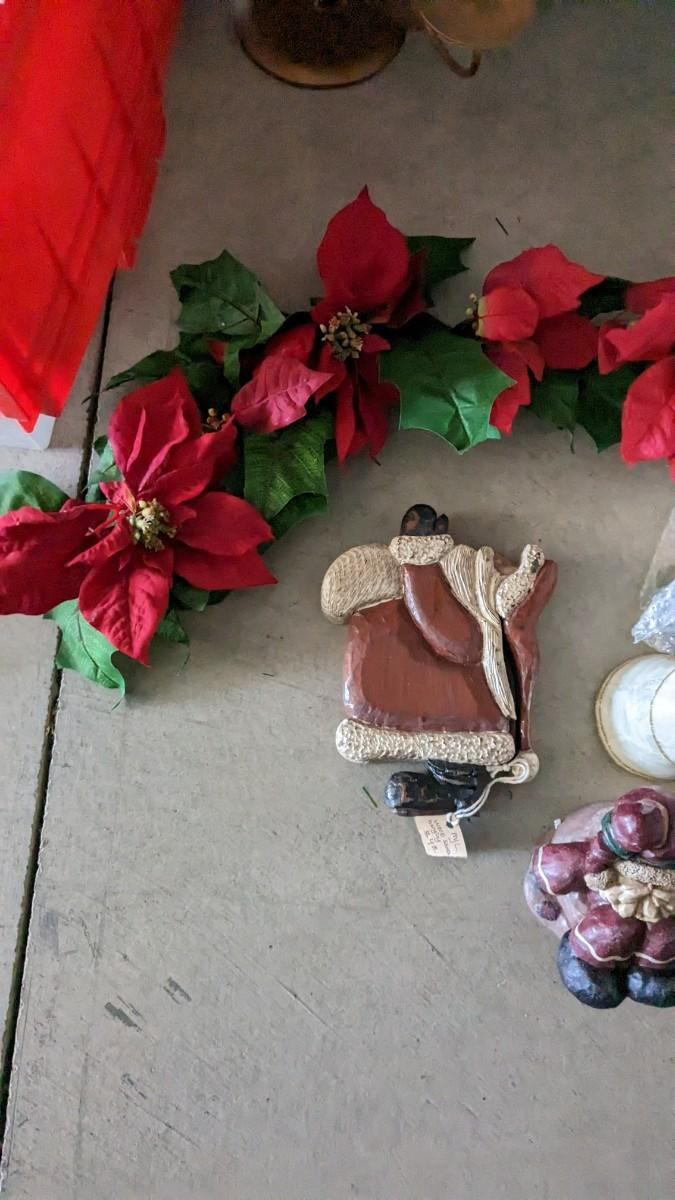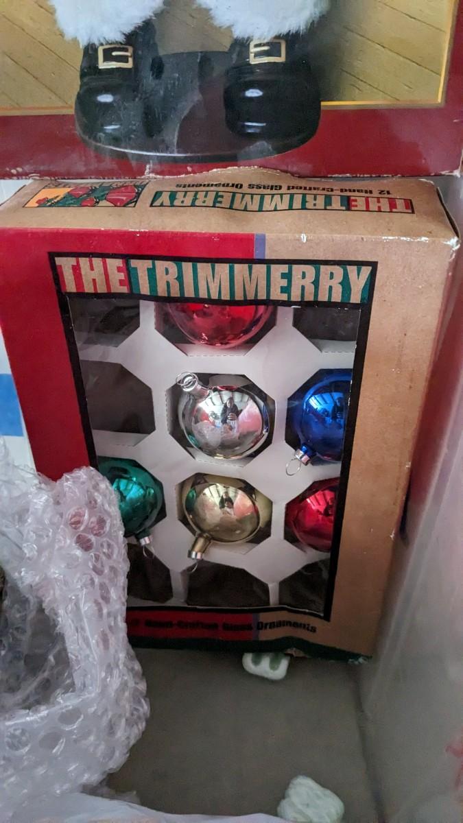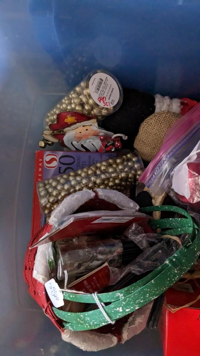 A great assortment of very decade christmas items. Includes June McKenna numbered santa, faux florals, mated christmas tree candle holders,tinsel trees, snowy village kitchen accessories, snowflake dessert bowls, crafting items, 4 ft christmas tree in box never opened, Jingle Bell Rock Santa, heritage mint ice village christmas tree, and more! No shipping 2616