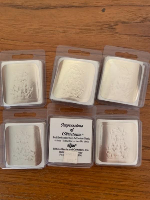 Assorted tags and 5 unopened boxes (15 pcs ea) and 1 opened approx 10 pcs) of gold, self-adhesive seals embossed with Teddy Bears.