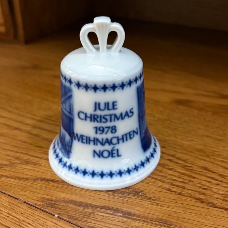 The bell is white with blue decorative patterns and text. The text includes "JULE," "CHRISTMAS," "1978," "WEIHNACHTEN," and "NOËL," representing Christmas in Danish/Norwegian, English, German, and French, respectively.