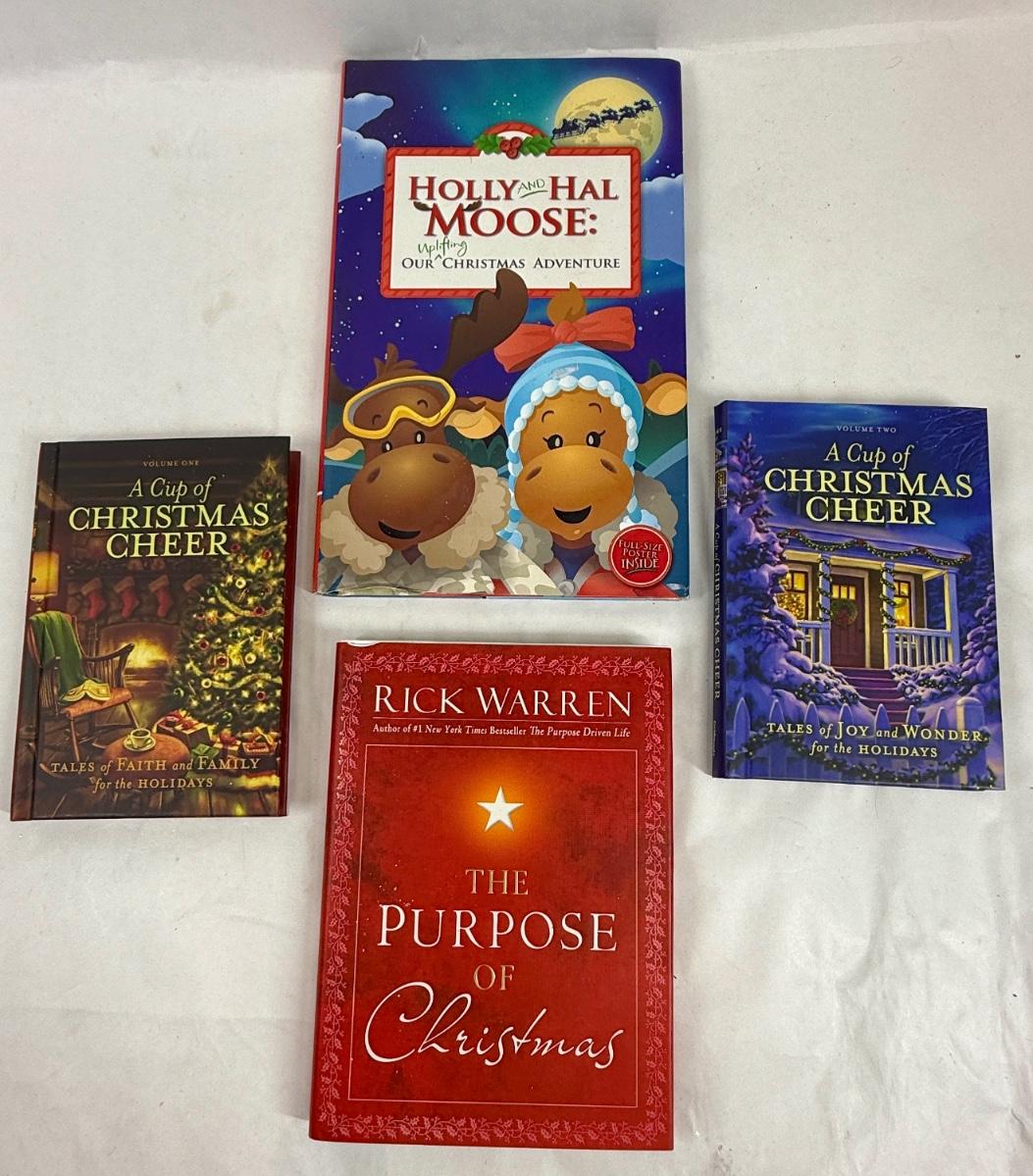Titles include: A Cup of Christmas Cheer (Vols. 1 & 2), The Purpose of Christmas, and Holly and Hal Moose - Our Uplifting Christmas Adventure. All in like-new condition.