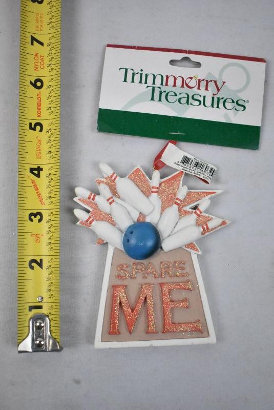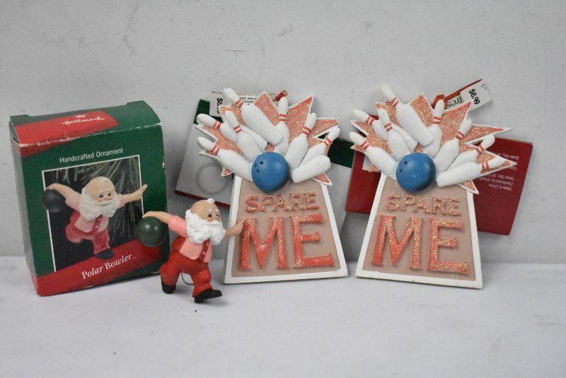 Christmas Bowling Ornaments: 2 "Spare Me" and 1 Santa "Polar Bowler"