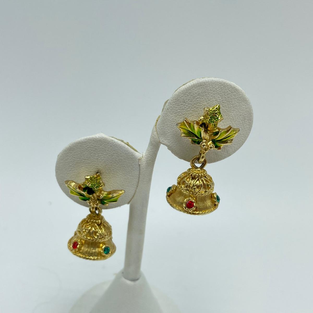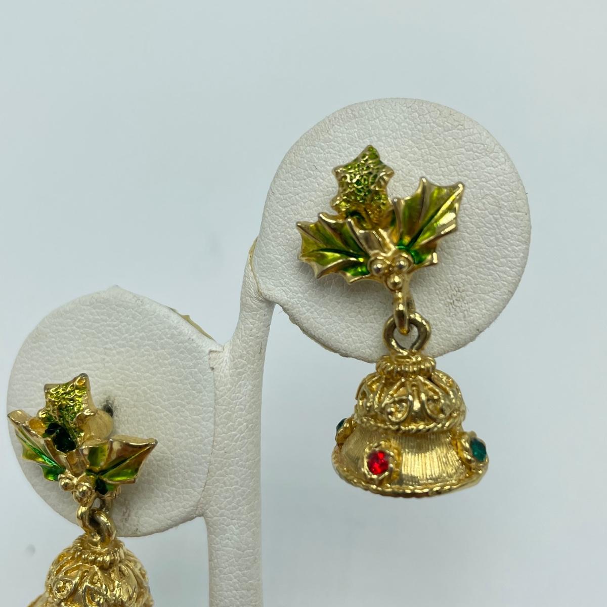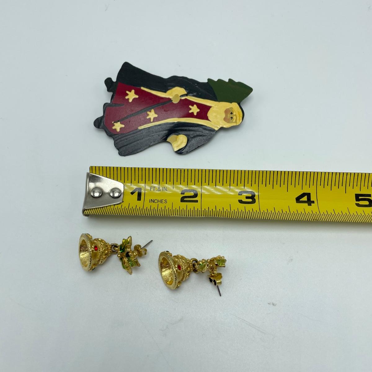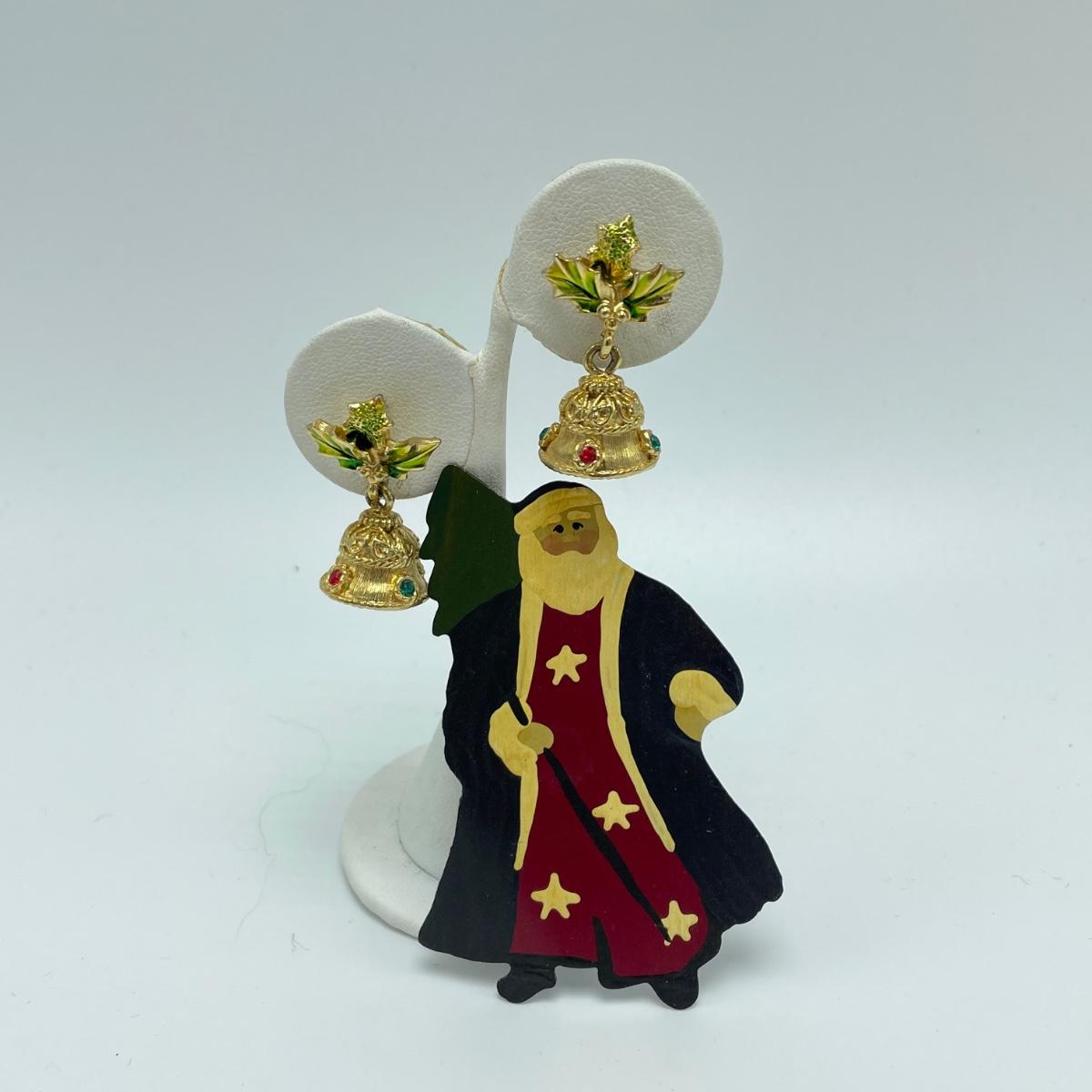 Hand painted Santa brooch, piece appears to be on a sheet of plastic-like material. Lot also offers a pair of gold colored Christmas bell earrings with green and red gems and painted mistletoe leaves. See images. Shipping available.